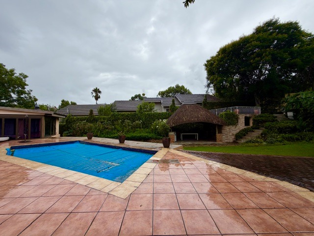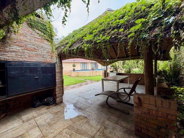 Outdoor living is a true pleasure on the expansive 1896 sqm erf. A private swimming pool, a spacious paved patio, and a charming thatched lapa with a built-in braai create an ideal setting for entertaining and relaxation. The terraced garden, mature trees, and a borehole ensure a vibrant and sustainable landscape. Parking is abundant with three garages and additional open parking for up to ten vehicles.