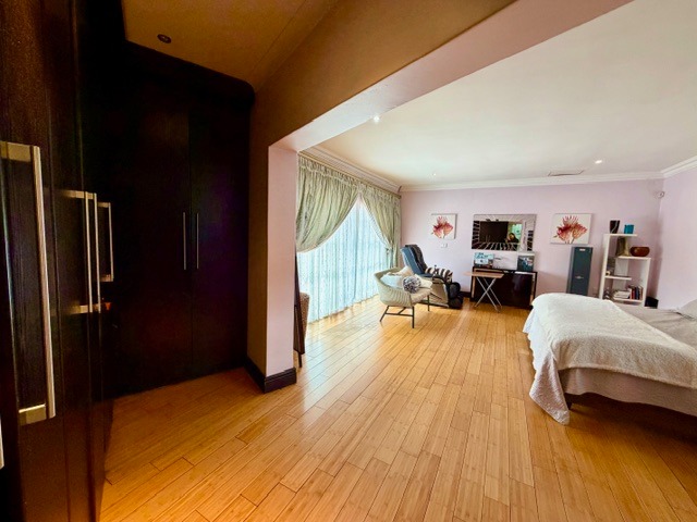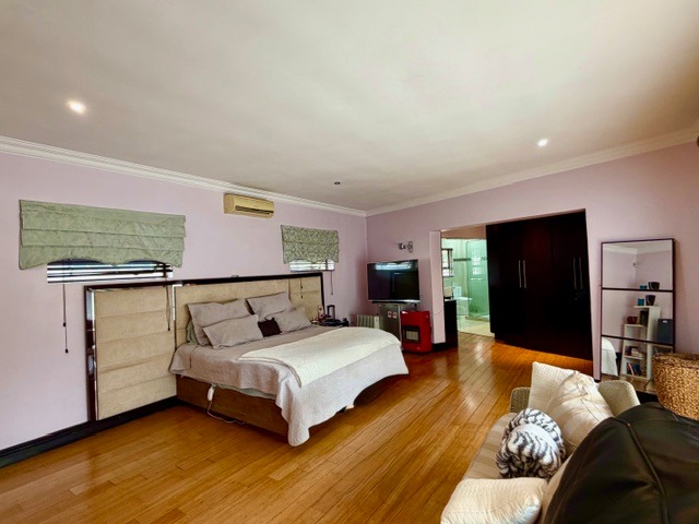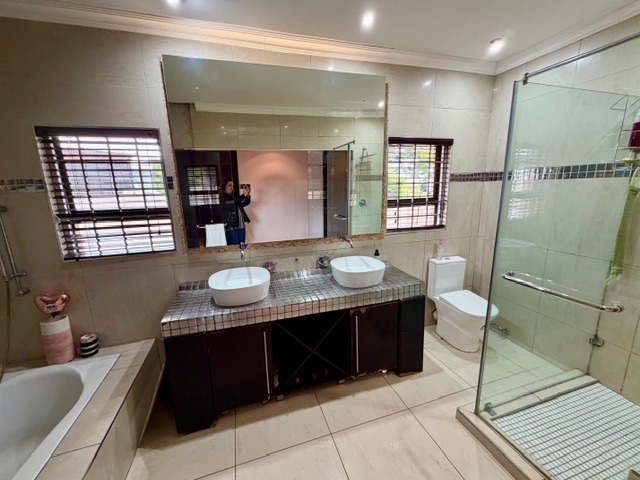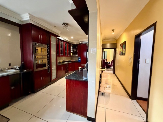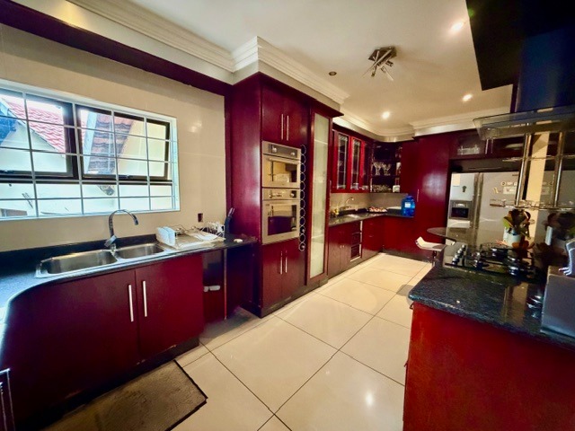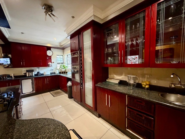 Spanning a generous 479 sqm under roof, the interior offers a spacious and functional layout. Enjoy three distinct lounges, including a dedicated family TV room, alongside a formal dining area featuring vaulted ceilings and an elegant chandelier. The well-appointed kitchen is a highlight, boasting dark red cabinetry, granite countertops, integrated oven and microwave units, a gas hob, and ample storage, including a built-in wine rack.