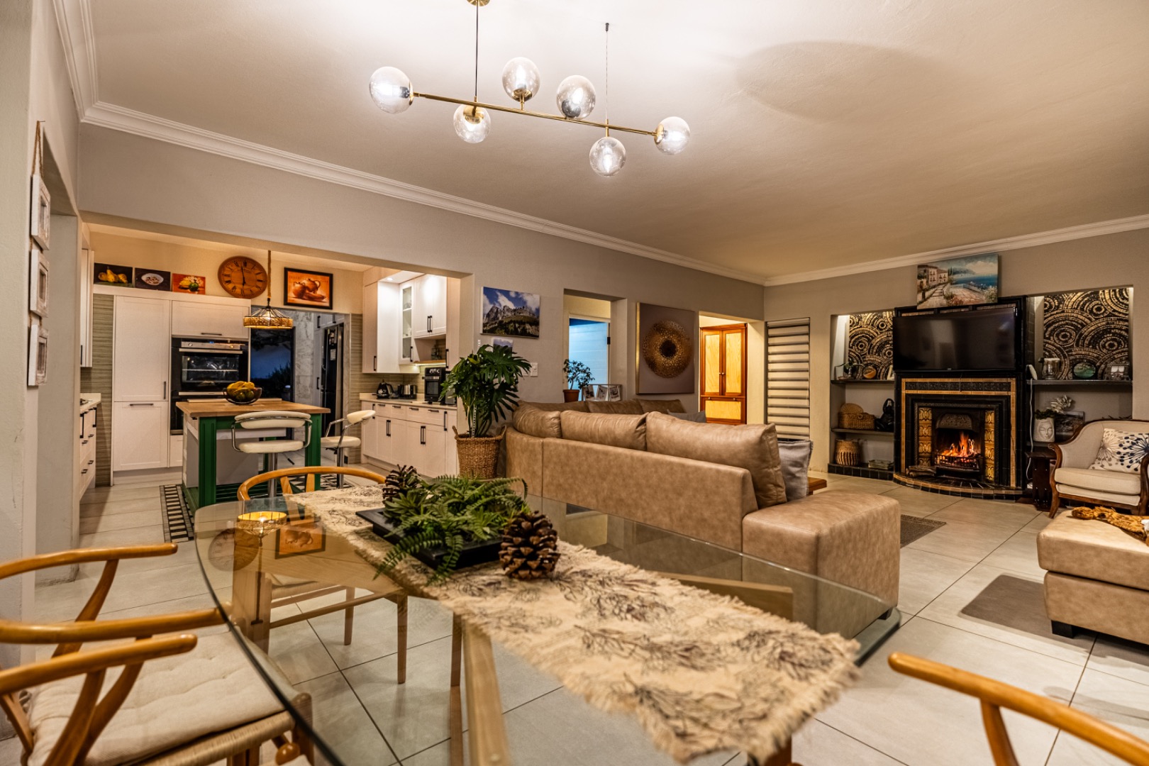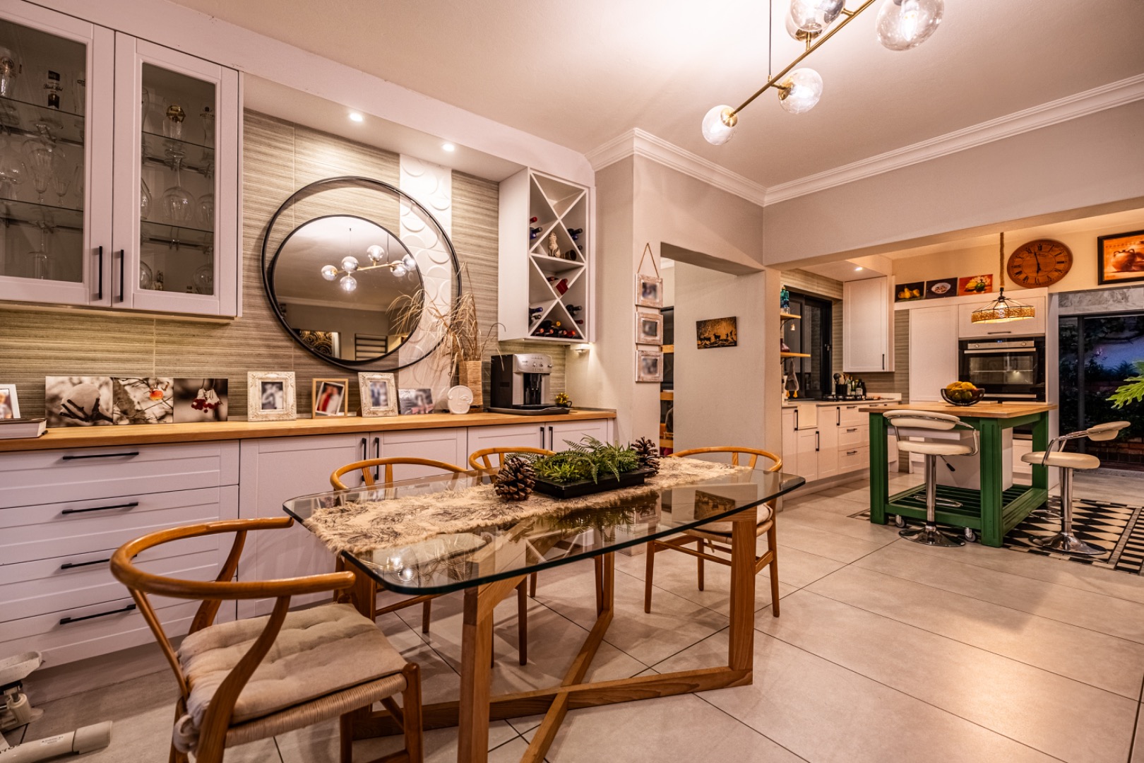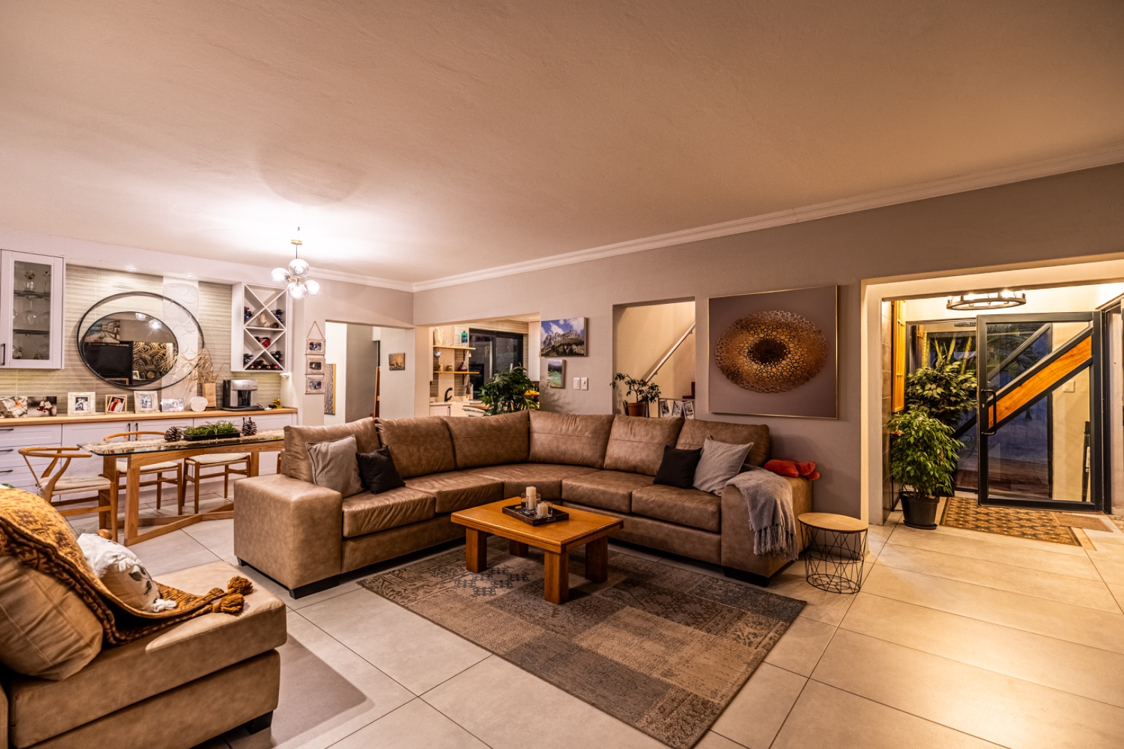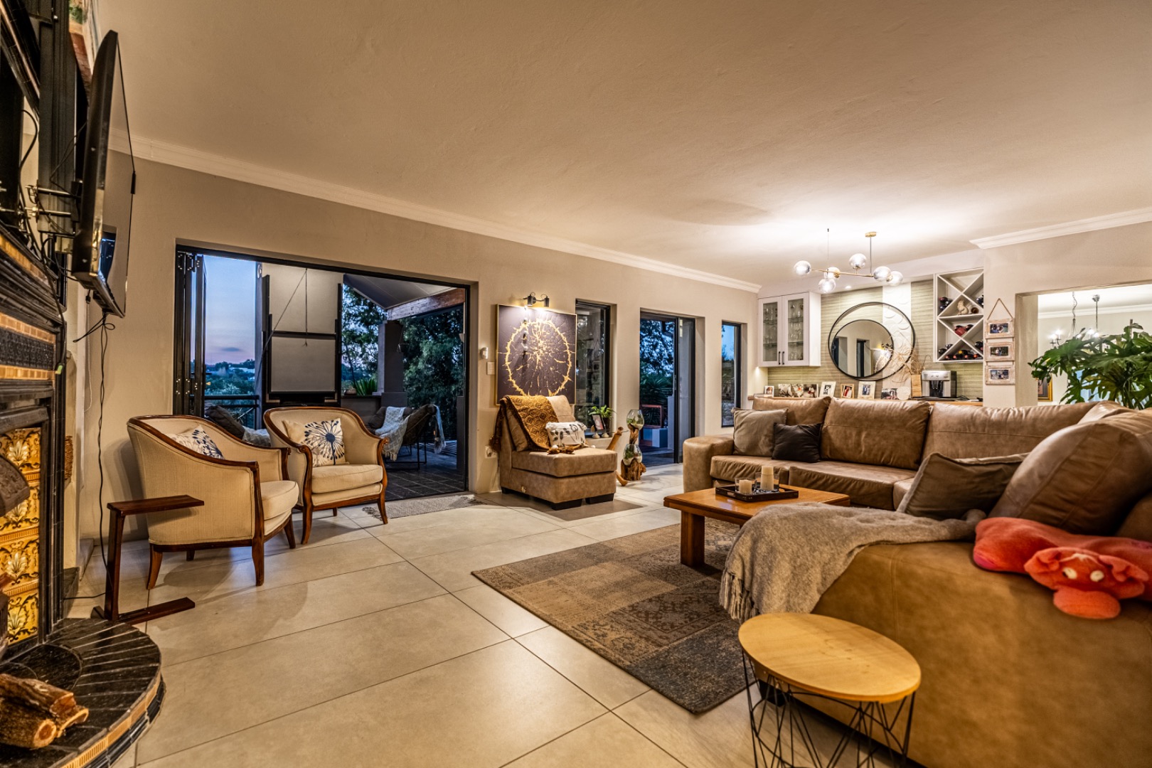 Three expansive interconnected living areas flow seamlessly, ideal for both refined entertaining and relaxed family living. Natural light pours in through large-format windows, drawing attention to the unique mosaic tile inlays that dot the interiors like artwork and the exclusive pendant lighting that adds sculptural drama to every room.