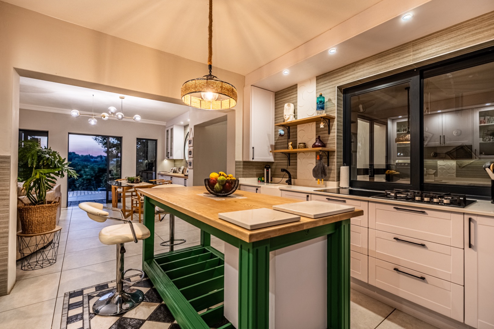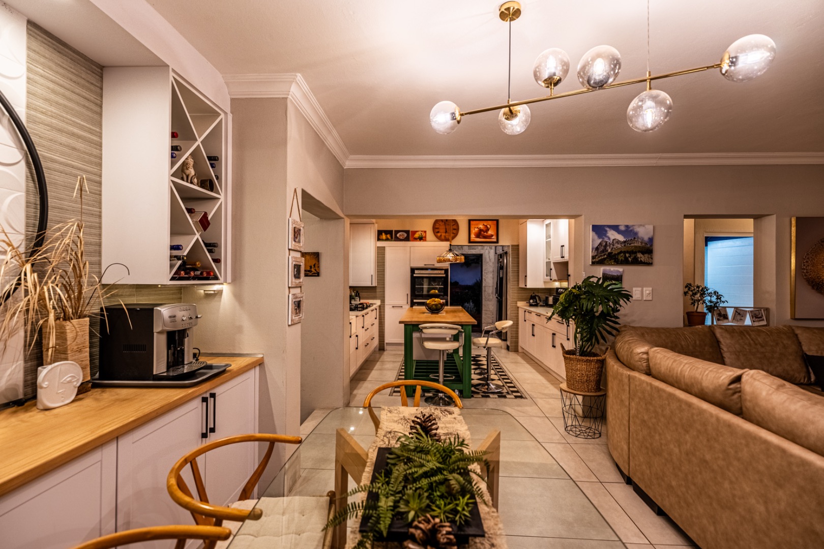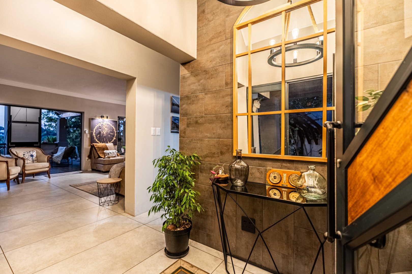Three expansive interconnected living areas flow seamlessly, ideal for both refined entertaining and relaxed family living. Natural light pours in through large-format windows, drawing attention to the unique mosaic tile inlays that dot the interiors like artwork and the exclusive pendant lighting that adds sculptural drama to every room.