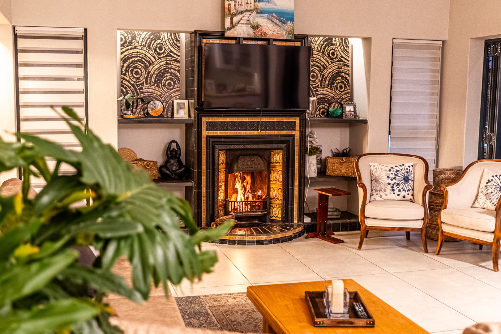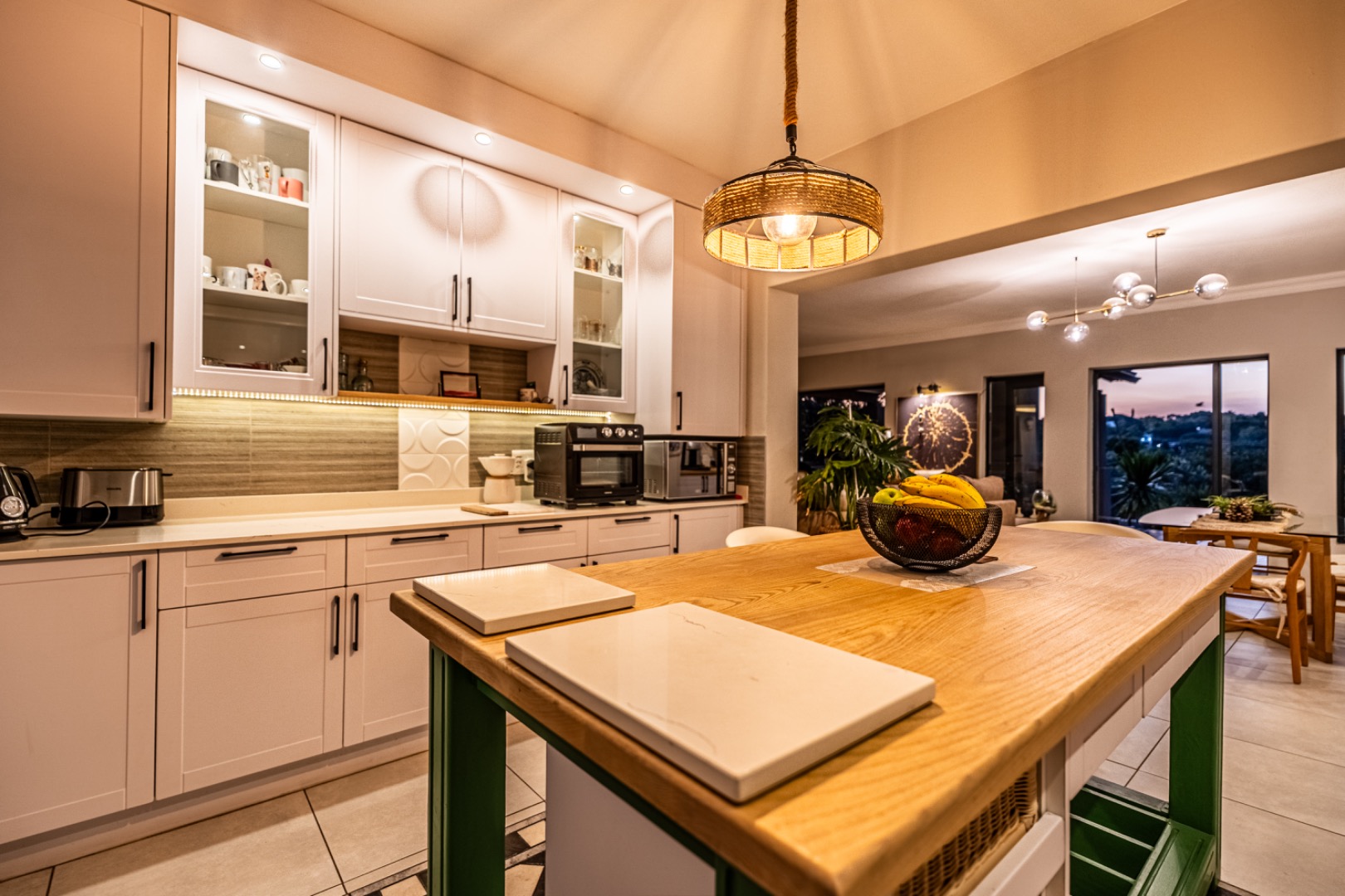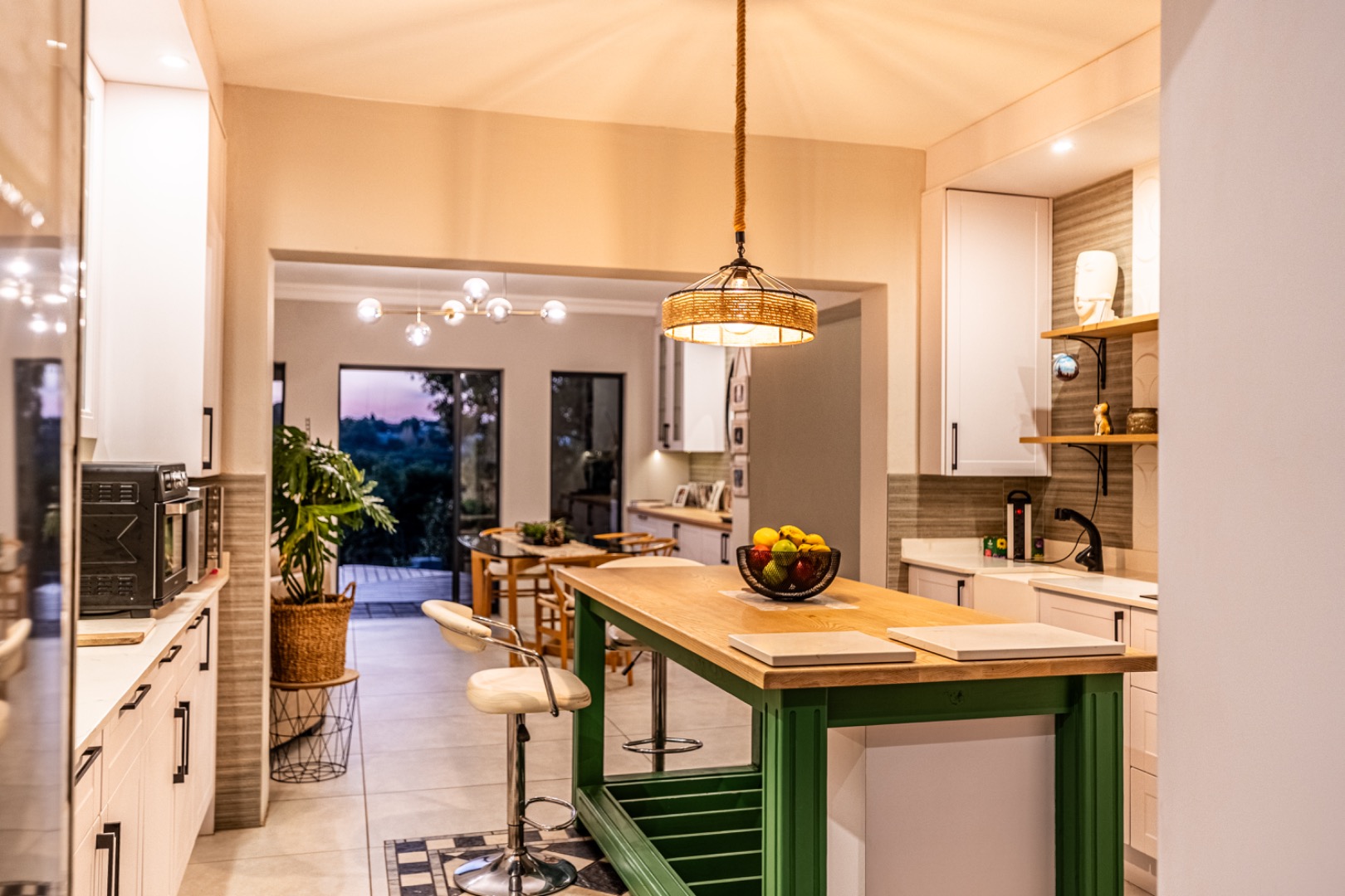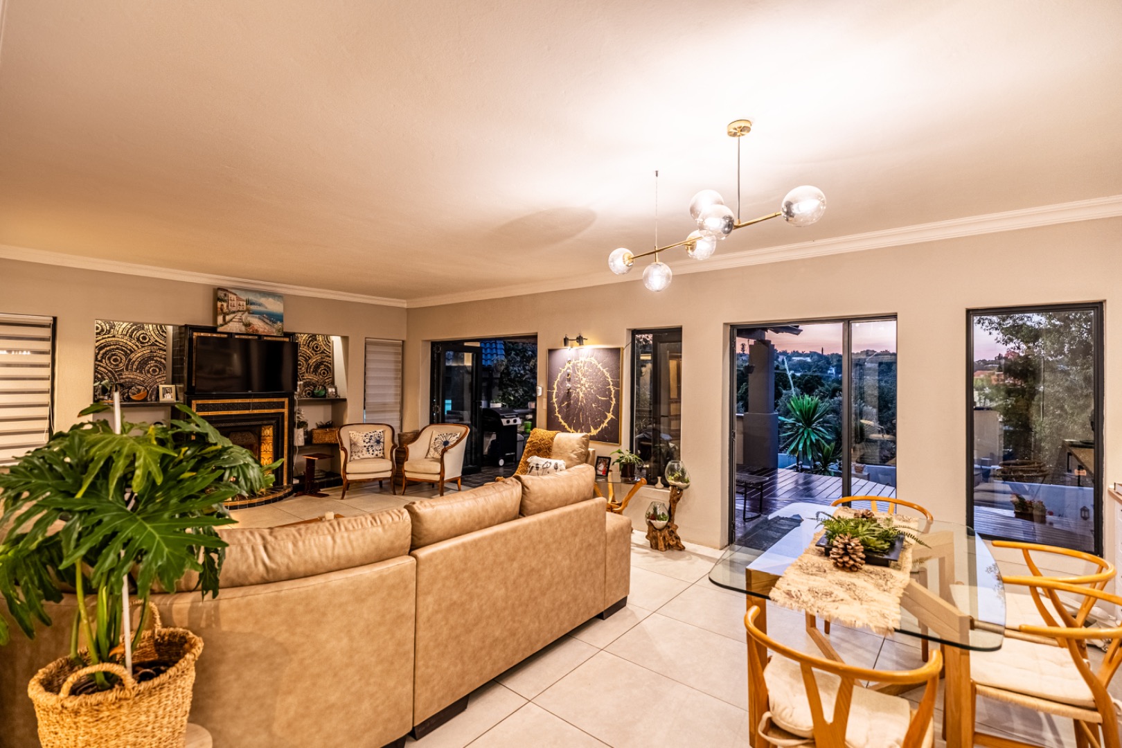 Three expansive interconnected living areas flow seamlessly, ideal for both refined entertaining and relaxed family living. Natural light pours in through large-format windows, drawing attention to the unique mosaic tile inlays that dot the interiors like artwork and the exclusive pendant lighting that adds sculptural drama to every room.