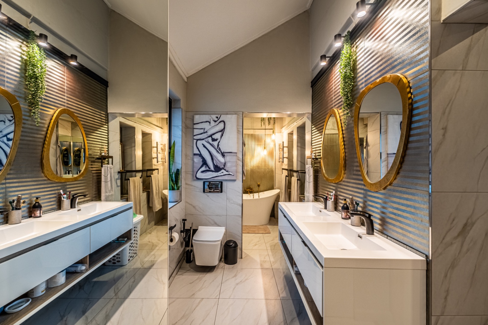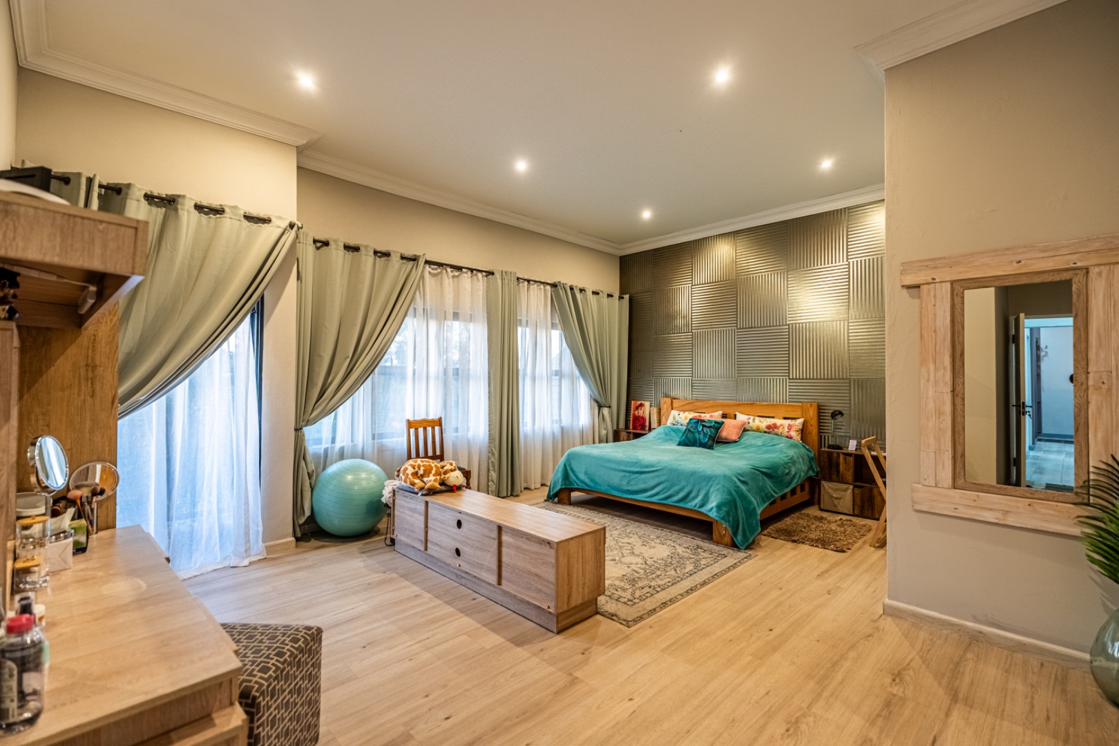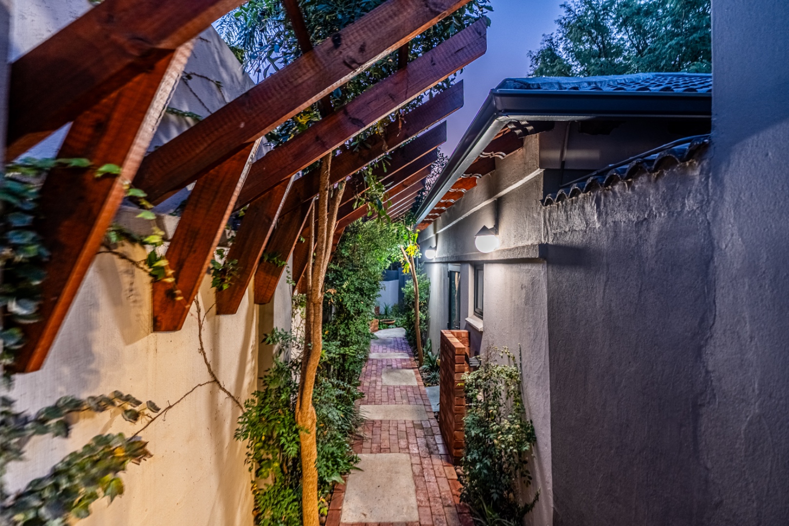 The main house boasts four spacious bedrooms, two of which are lavish en-suite sanctuaries, complete with heated towel rails, bespoke vanities, and back-lit mirrors that exude spa-like serenity. The primary suite is a masterpiece, with a designer walk-in closet, an elegant en-suite bathroom, and panoramic tree-top views over the verdant Waterkloof Ridge – a daily reminder of the beauty of this exclusive locale.