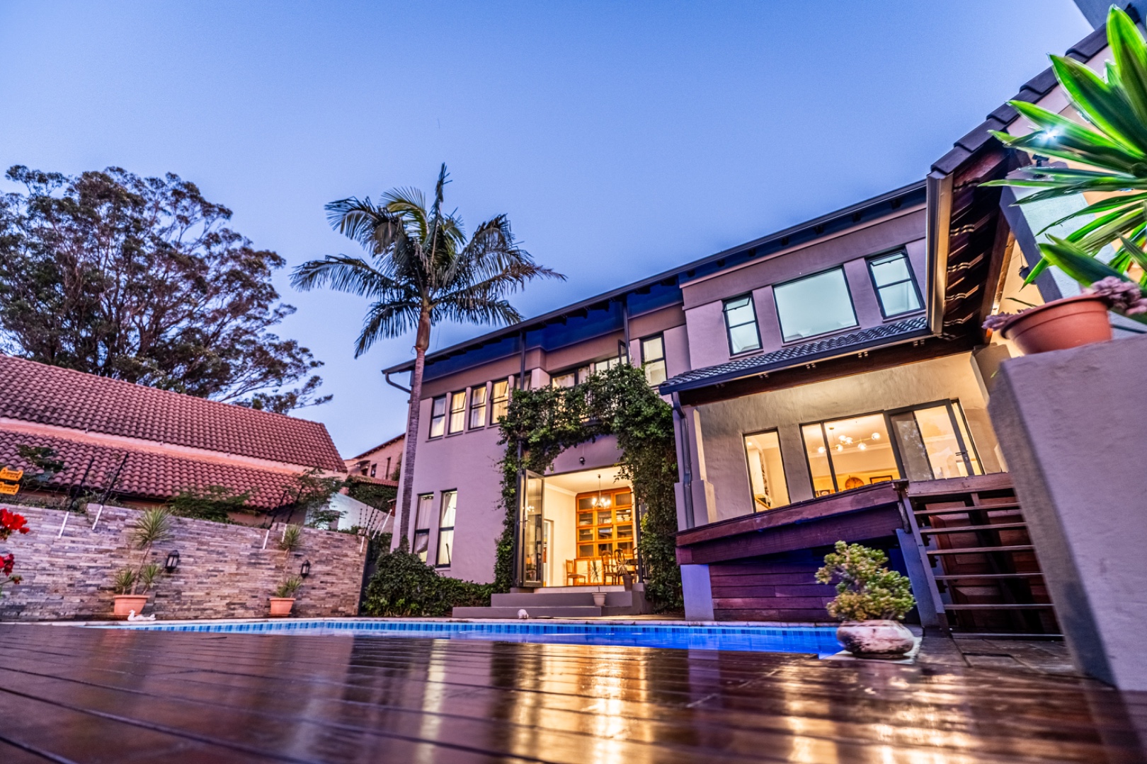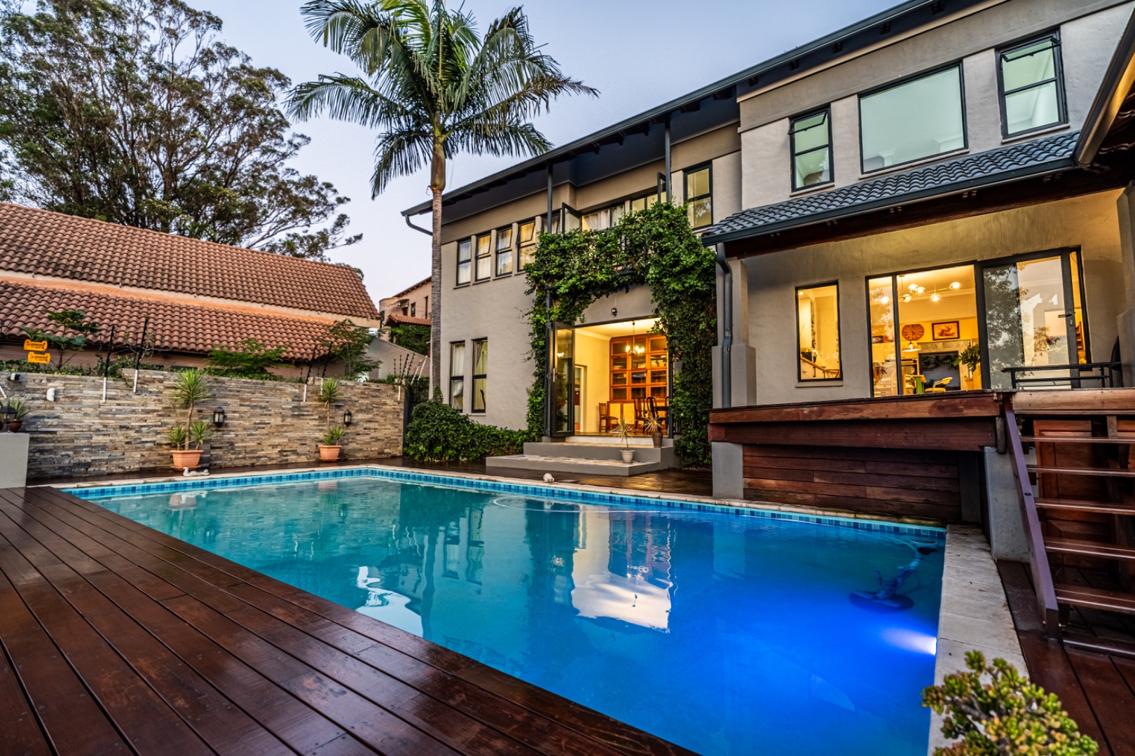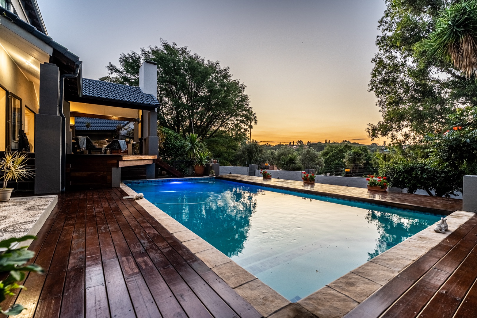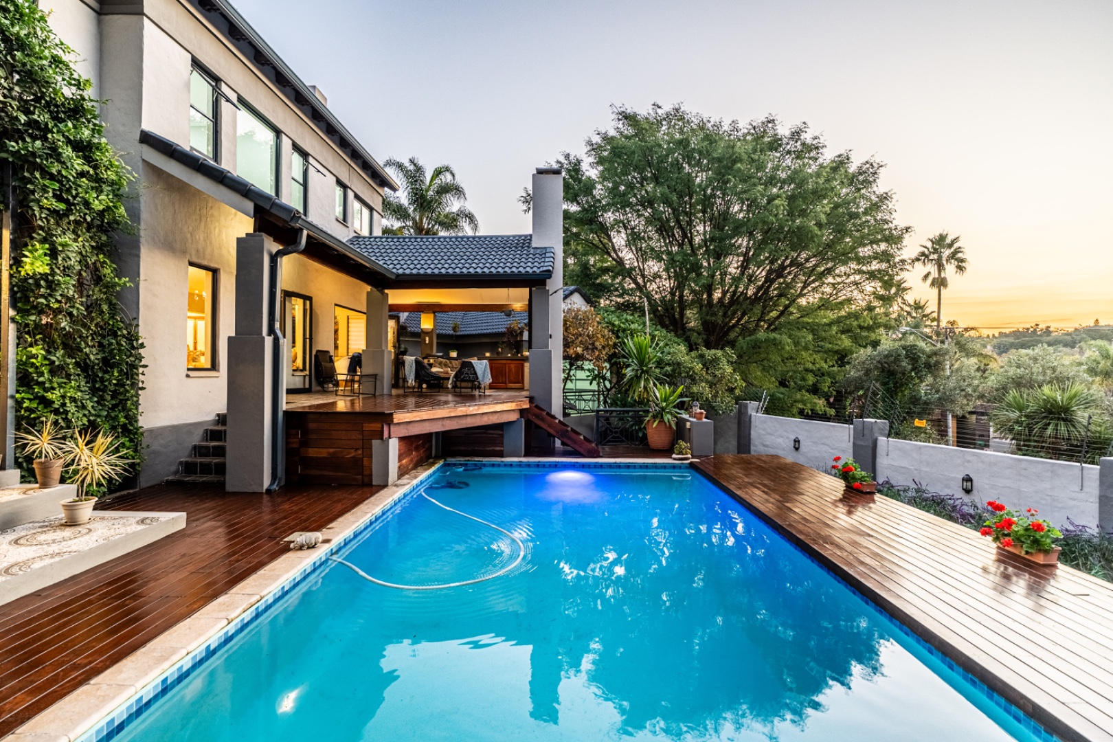 The exterior is just as breathtaking. A sparkling swimming pool beckons from the sun-drenched patio, while a tranquil koi pond brings an air of Zen to the manicured garden. Elevated views over the treetops offer serene sunsets and an ever-changing natural backdrop, perfect for entertaining or simply unwinding in your own private paradise.
