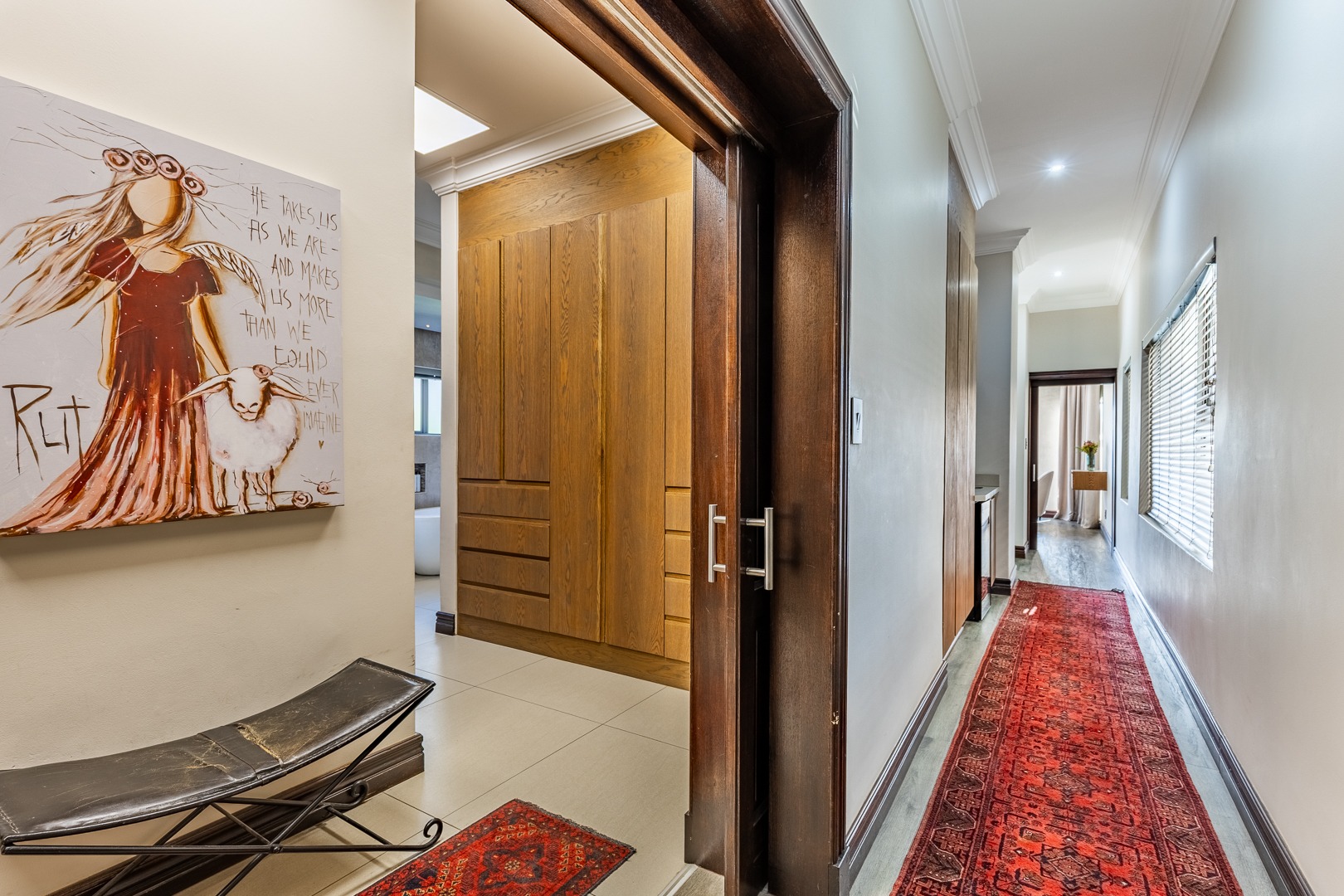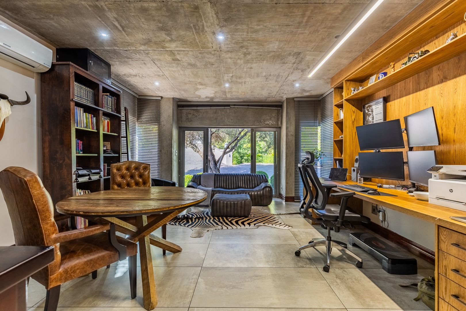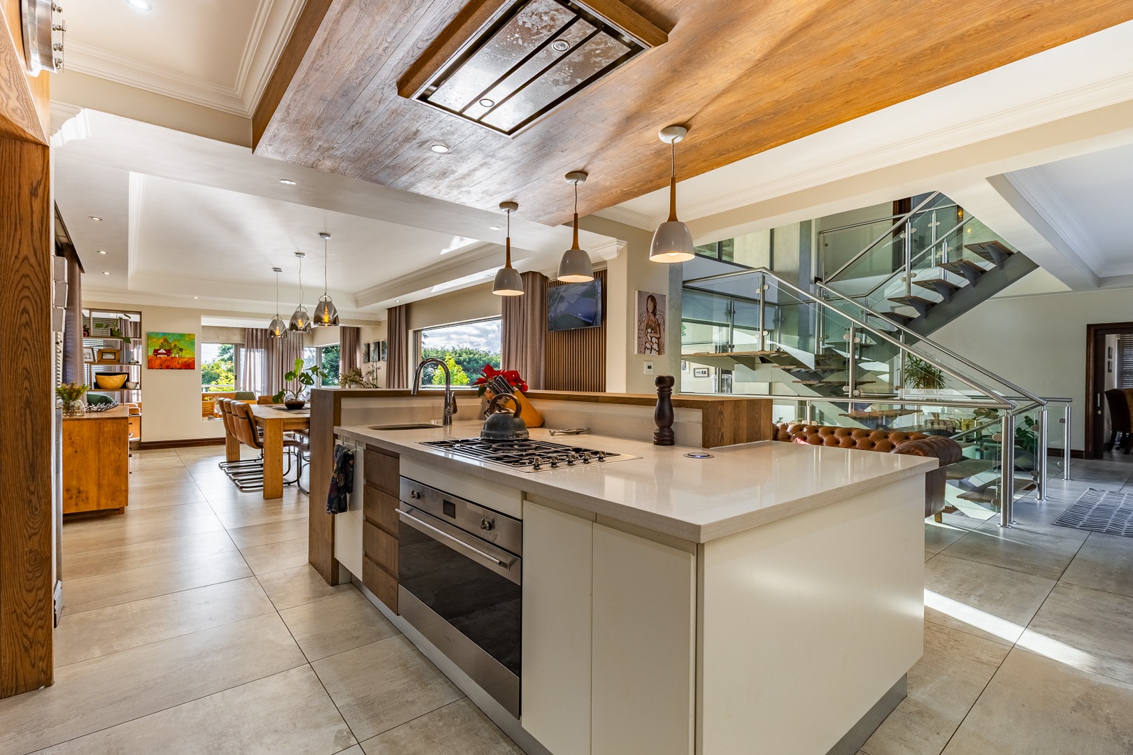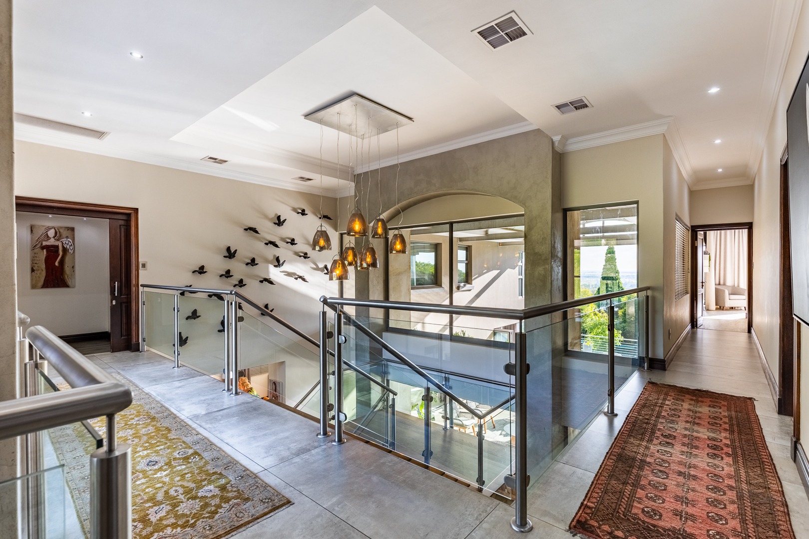 Premium features include heated flooring in selected bathrooms and living areas, aluminium windows (partially double glazed), soft-close cabinetry, Geberit sanitaryware, Legrand electrical fittings, excellent lighting throughout, and three-phase electricity. The home is further enhanced by a 24kW solar system with 70kW battery storage, borehole with JoJo tanks, central and zoned air-conditioning, full WiFi and network infrastructure, and exceptional security with AI-enabled CCTV, alarm system, electric fencing and ADT street patrols. The lower level offers six motor garages (three double garages), including extended garages suitable for 4x4s and larger vehicles, with direct access into the home. All buildings are fully approved to plans. A comprehensive information pack is available on request for serious buyers. VAT applicable – no transfer duty payable.