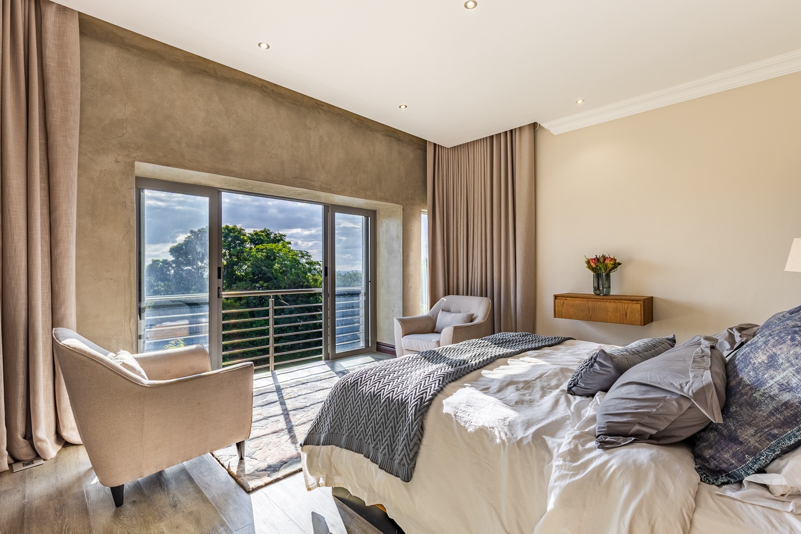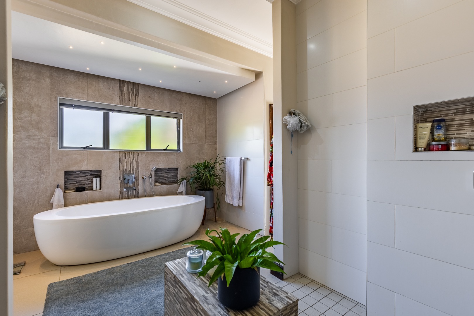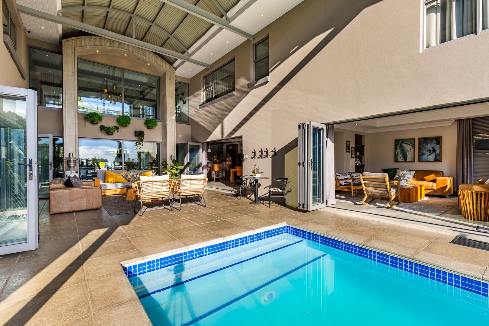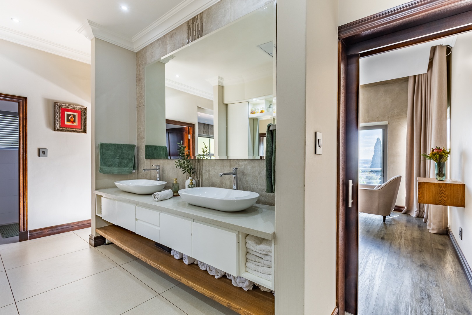 Premium features include heated flooring in selected bathrooms and living areas, aluminium windows (partially double glazed), soft-close cabinetry, Geberit sanitaryware, Legrand electrical fittings, excellent lighting throughout, and three-phase electricity. The home is further enhanced by a 24kW solar system with 70kW battery storage, borehole with JoJo tanks, central and zoned air-conditioning, full WiFi and network infrastructure, and exceptional security with AI-enabled CCTV, alarm system, electric fencing and ADT street patrols. The lower level offers six motor garages (three double garages), including extended garages suitable for 4x4s and larger vehicles, with direct access into the home. All buildings are fully approved to plans. A comprehensive information pack is available on request for serious buyers. VAT applicable – no transfer duty payable.
