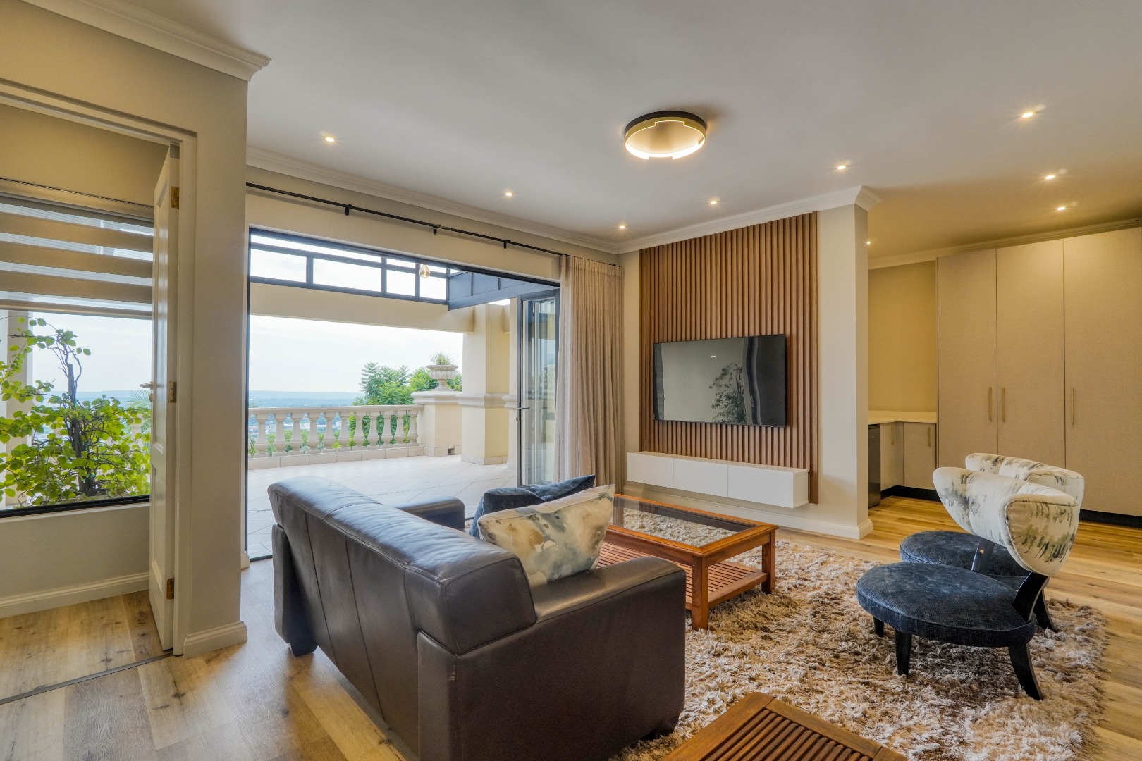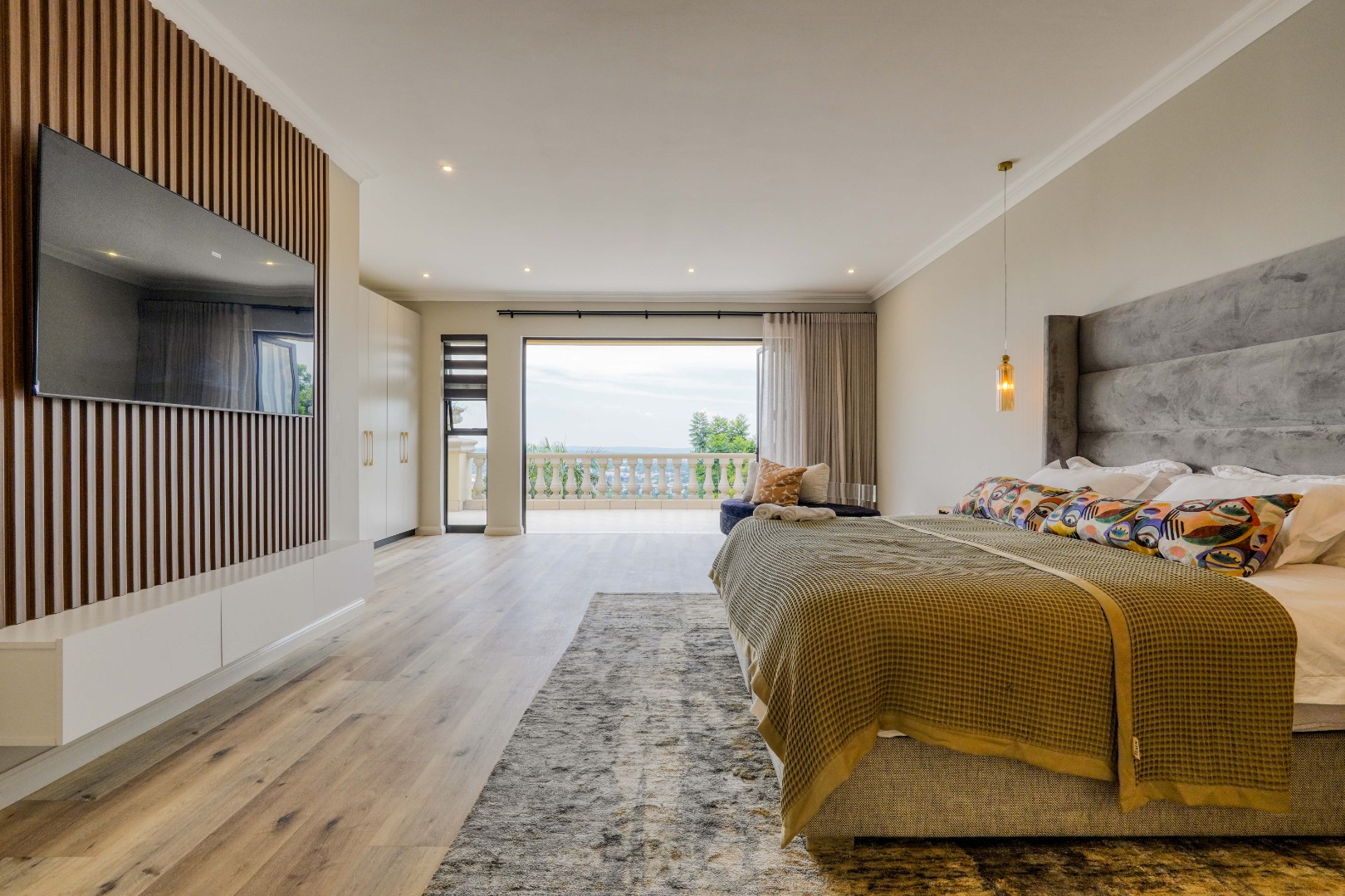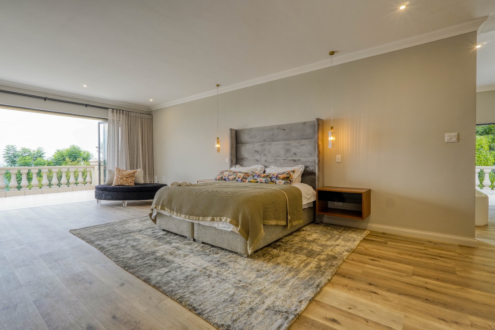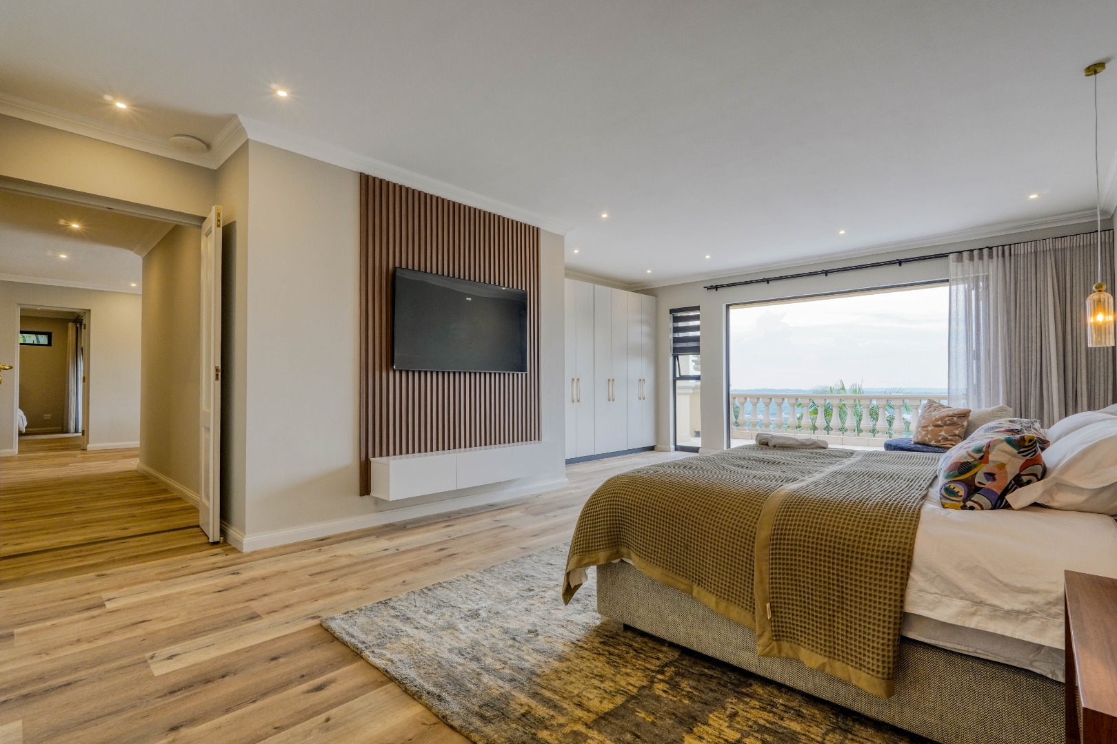 Upstairs, the home is dedicated to accommodation and quiet living. The master bedroom is a true retreat with a full en suite bathroom, a walk in closet, and its own private balcony. At the center of this floor, where the staircase arrives, is a comfortable pajama lounge with a kitchenette. This space shares a large scenic balcony with the master bedroom, offering both a communal viewing area and a more private extension for the main suite. The remaining bedrooms are all en suite, providing comfort and privacy for family and guests alike.