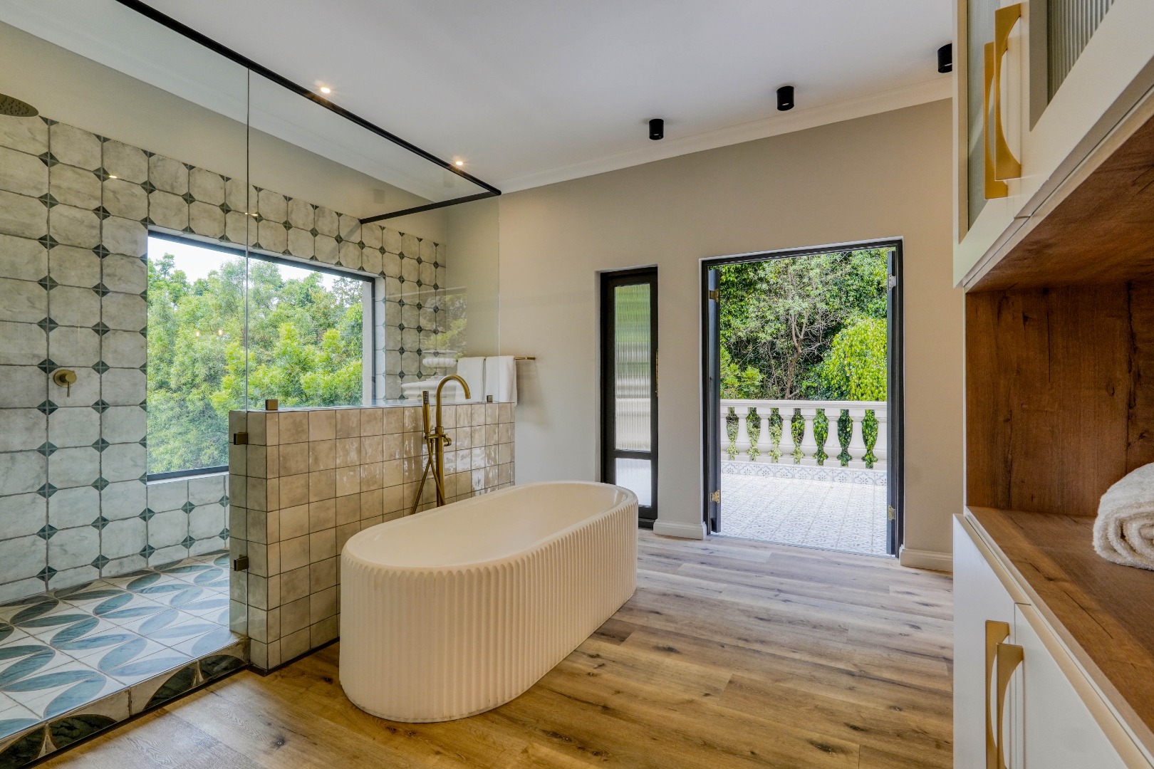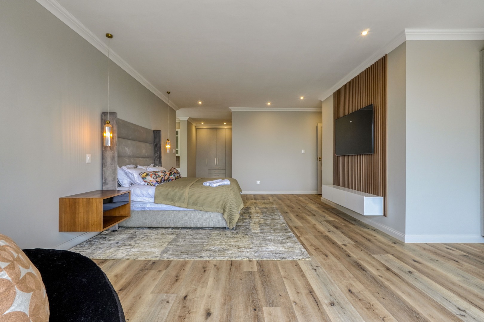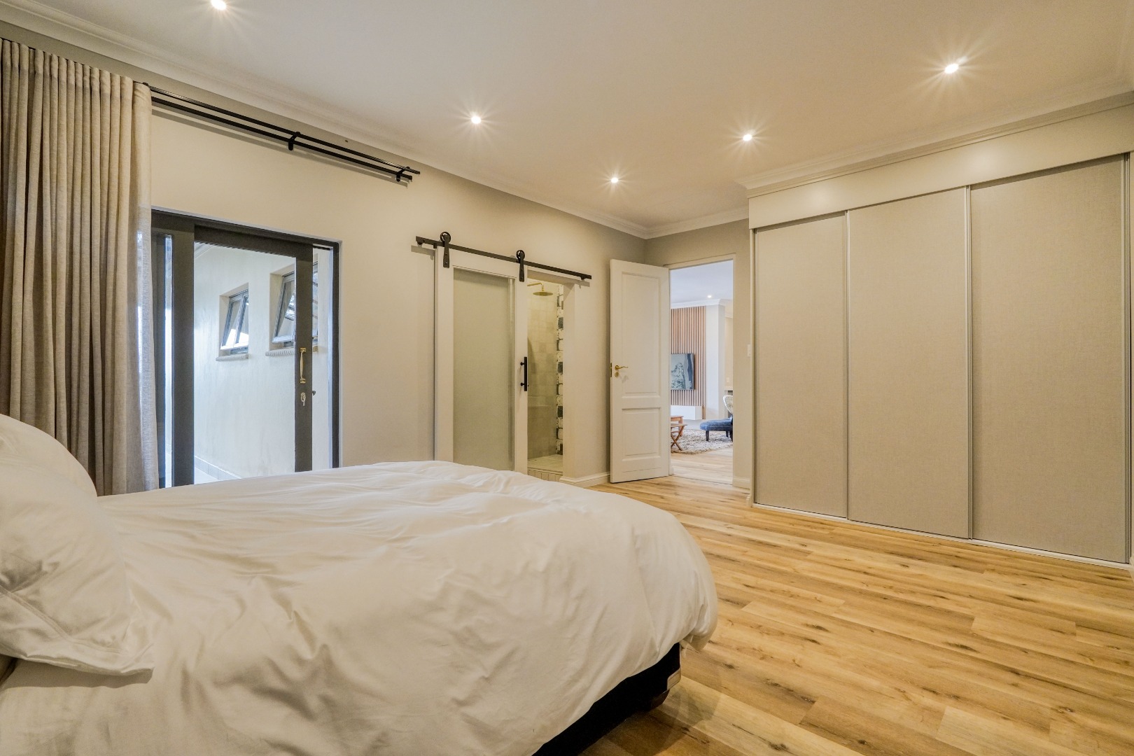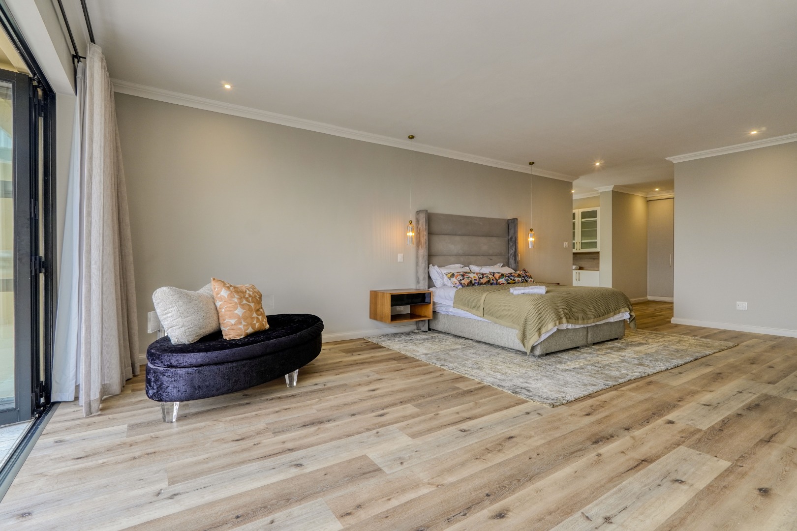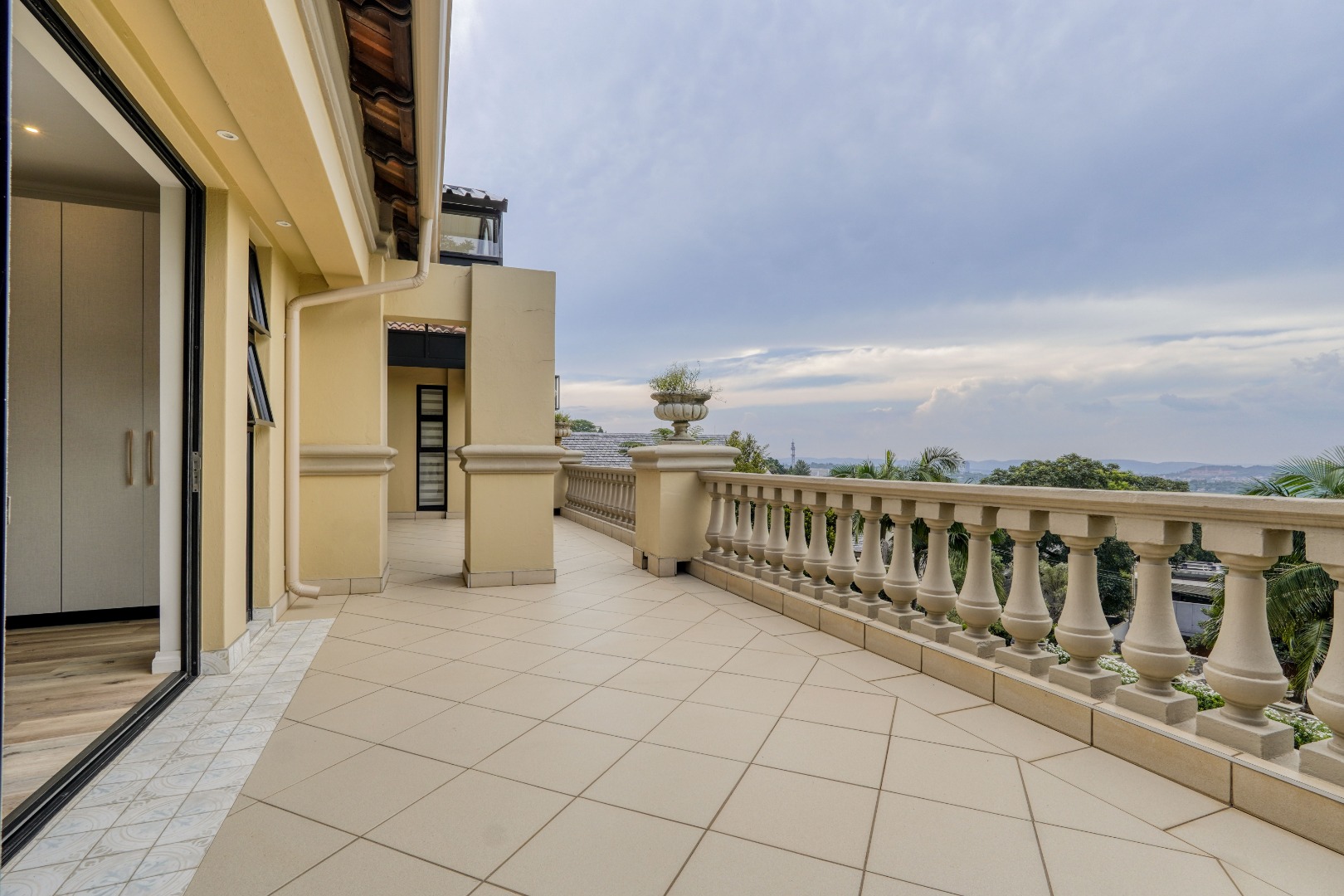 Upstairs, the home is dedicated to accommodation and quiet living. The master bedroom is a true retreat with a full en suite bathroom, a walk in closet, and its own private balcony. At the center of this floor, where the staircase arrives, is a comfortable pajama lounge with a kitchenette. This space shares a large scenic balcony with the master bedroom, offering both a communal viewing area and a more private extension for the main suite. The remaining bedrooms are all en suite, providing comfort and privacy for family and guests alike.