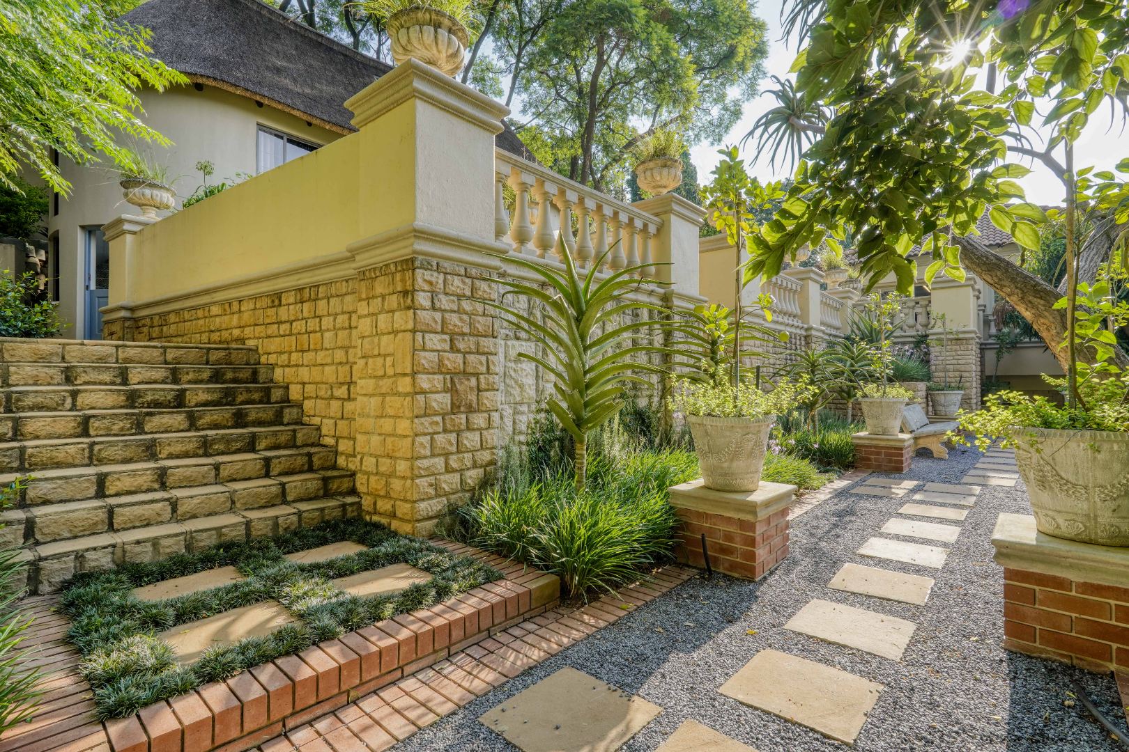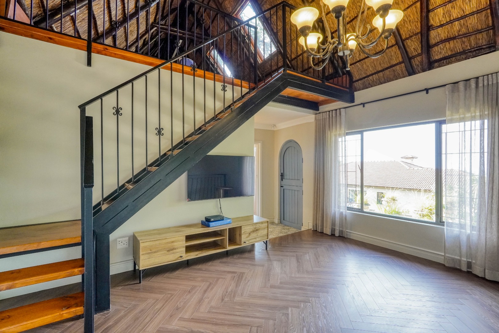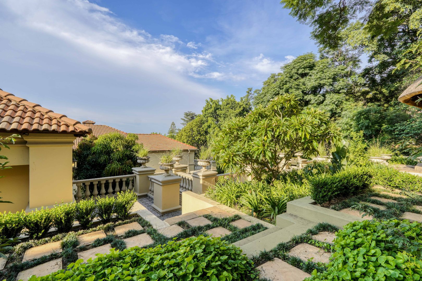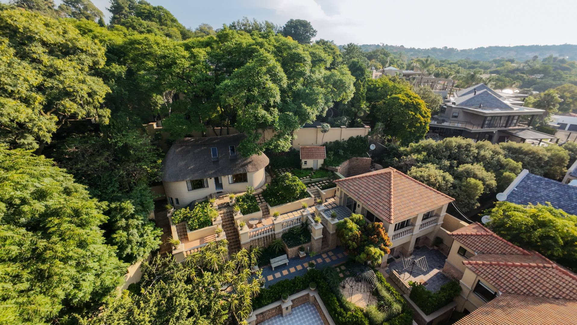The grounds continue to impress. At the back of the yard, set on an incline, is a separate building currently used as a gym, ideal for fitness or hobby space. At the very back and at the highest point of the property sits a charming cottage. The cottage features a kitchen on the first floor, with a lounge, bathroom, and bedroom on the second floor, and a loft above with skylights in the thatch roof, offering beautiful elevated views over the city.