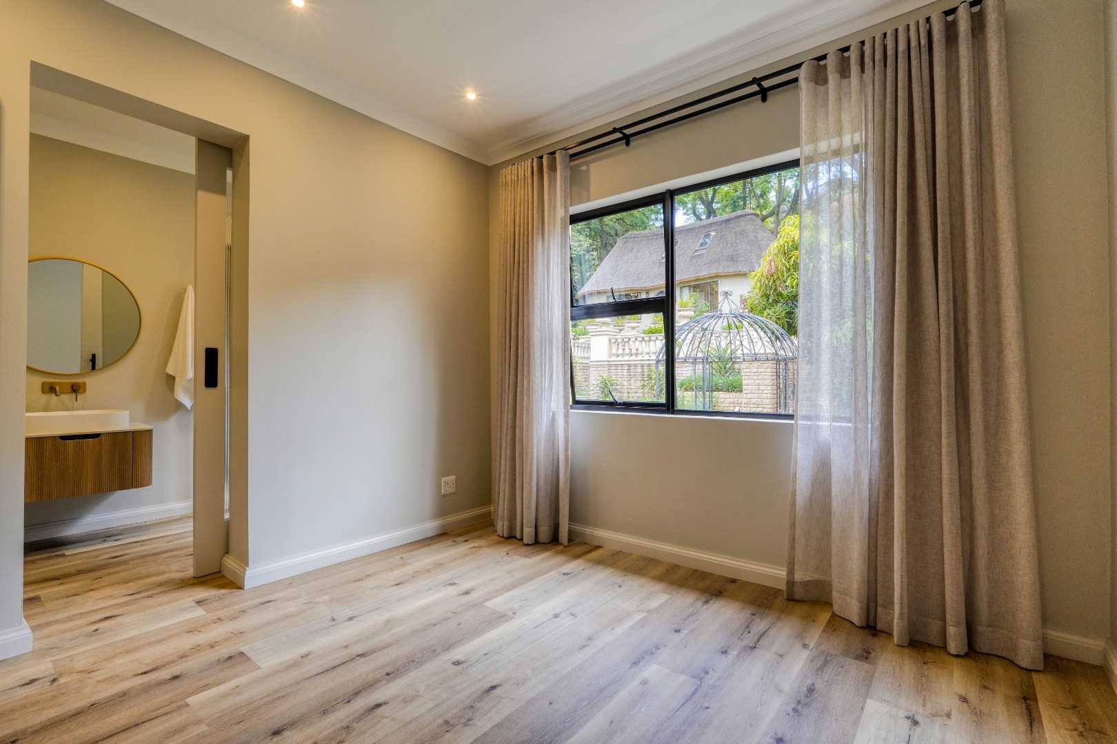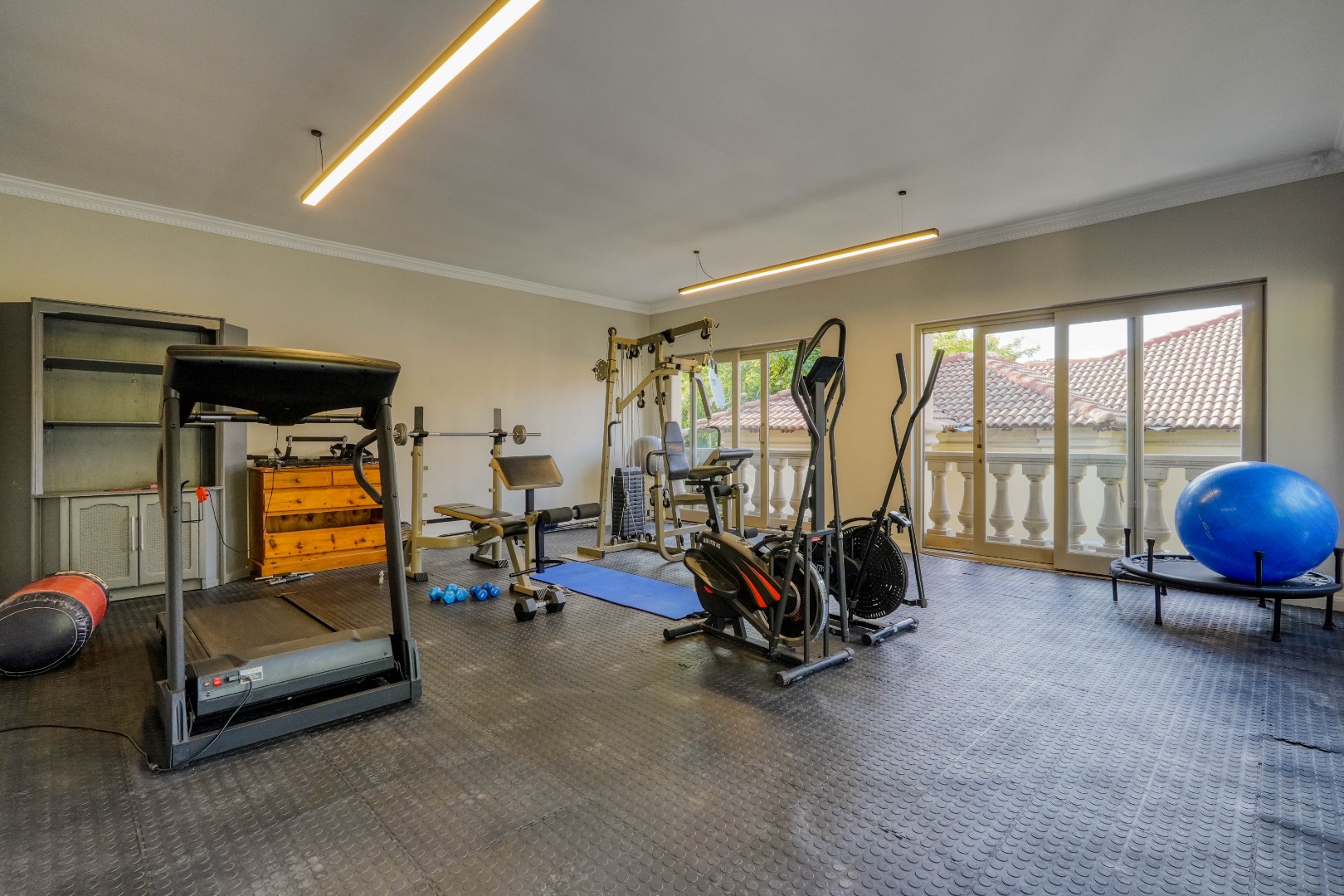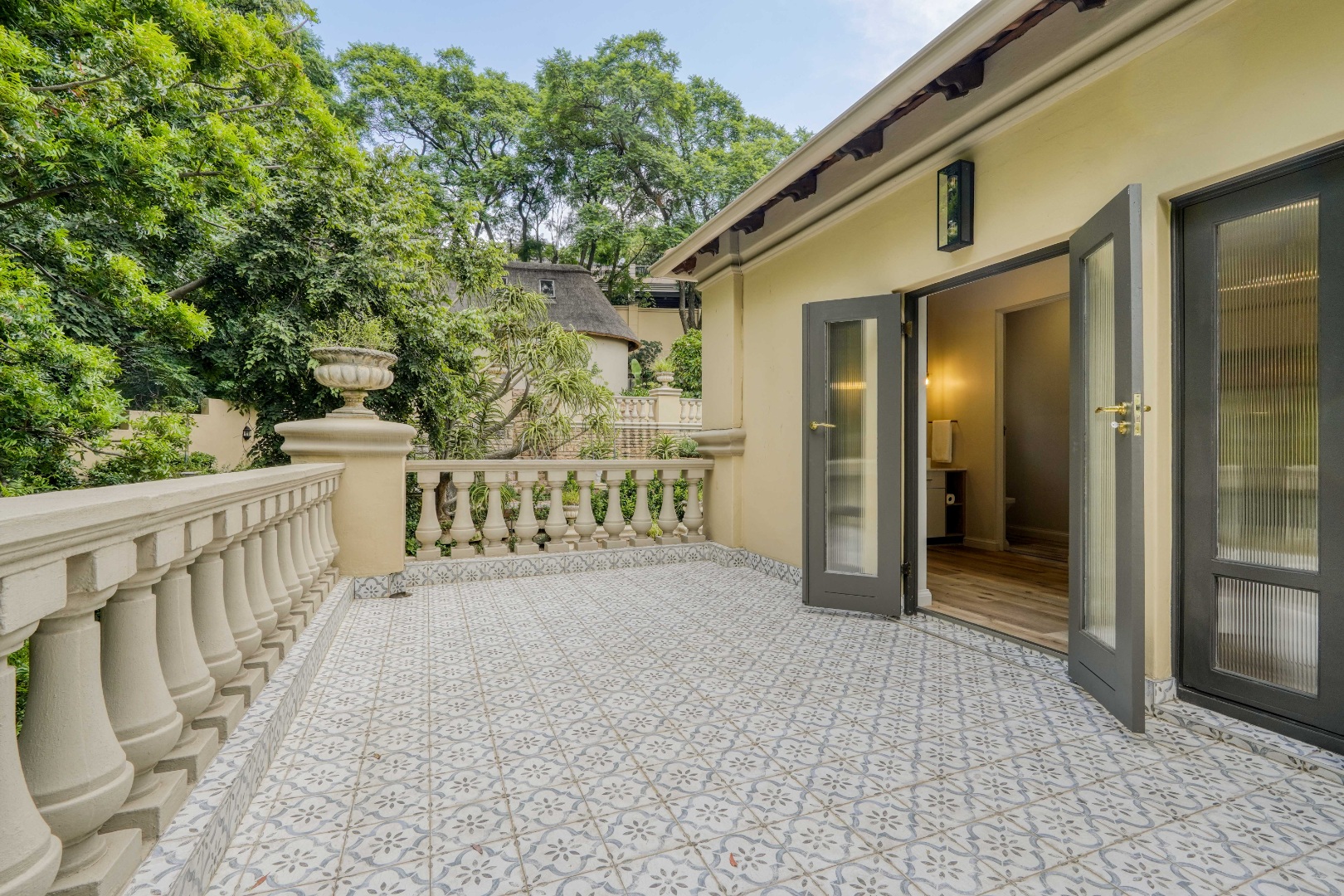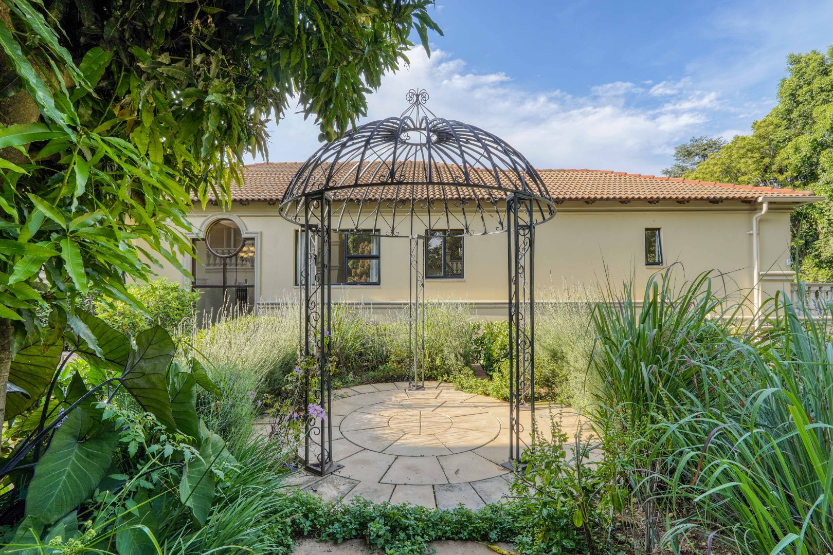 The grounds continue to impress. At the back of the yard, set on an incline, is a separate building currently used as a gym, ideal for fitness or hobby space. At the very back and at the highest point of the property sits a charming cottage. The cottage features a kitchen on the first floor, with a lounge, bathroom, and bedroom on the second floor, and a loft above with skylights in the thatch roof, offering beautiful elevated views over the city.