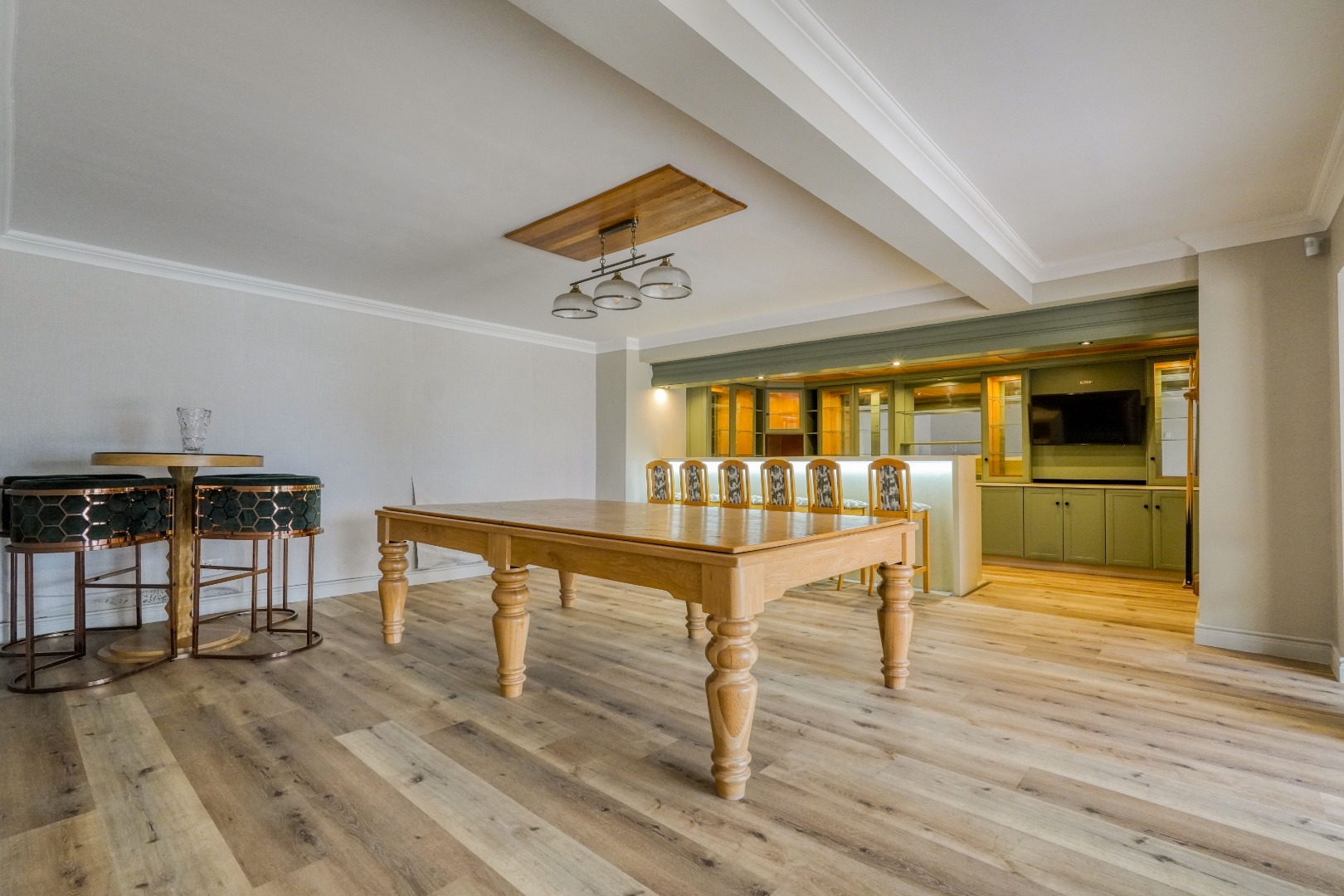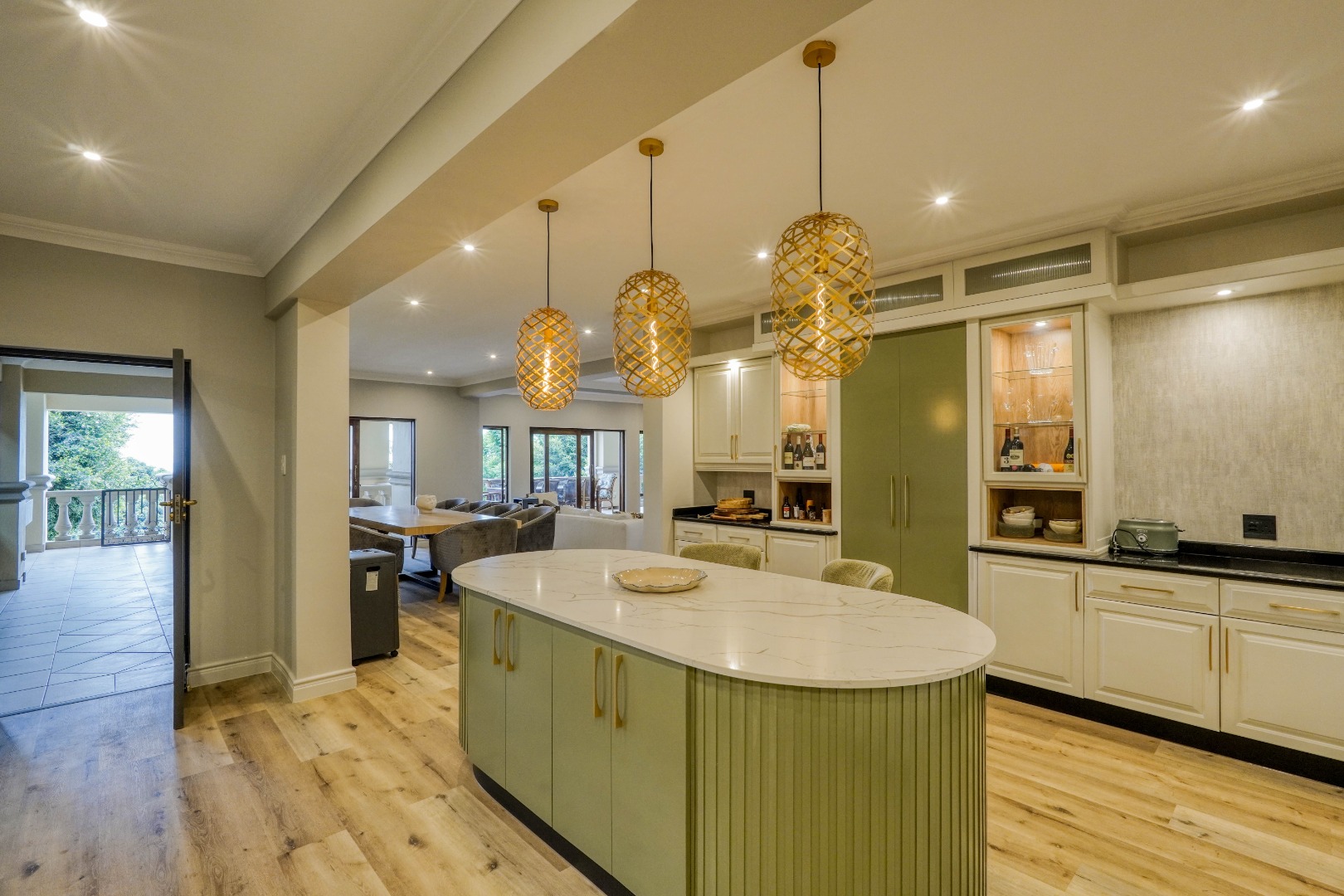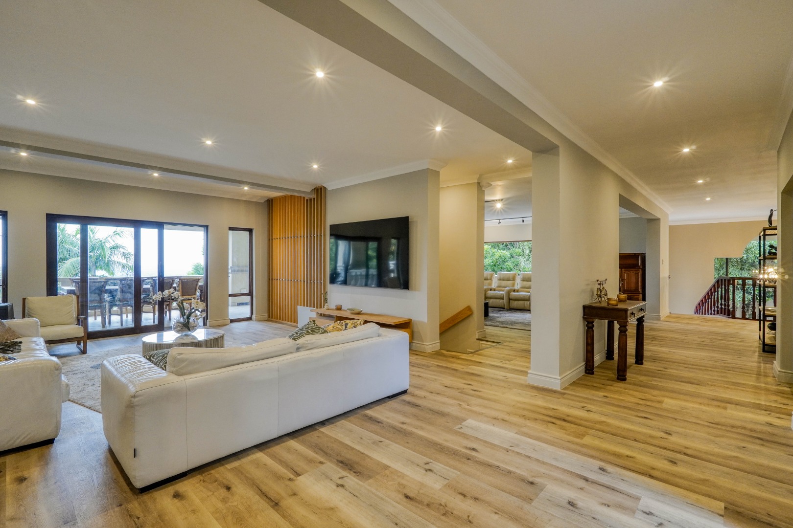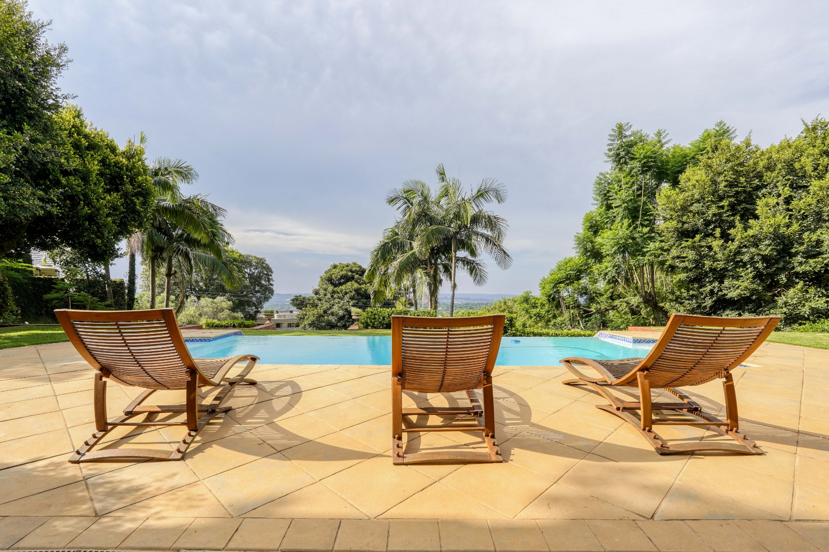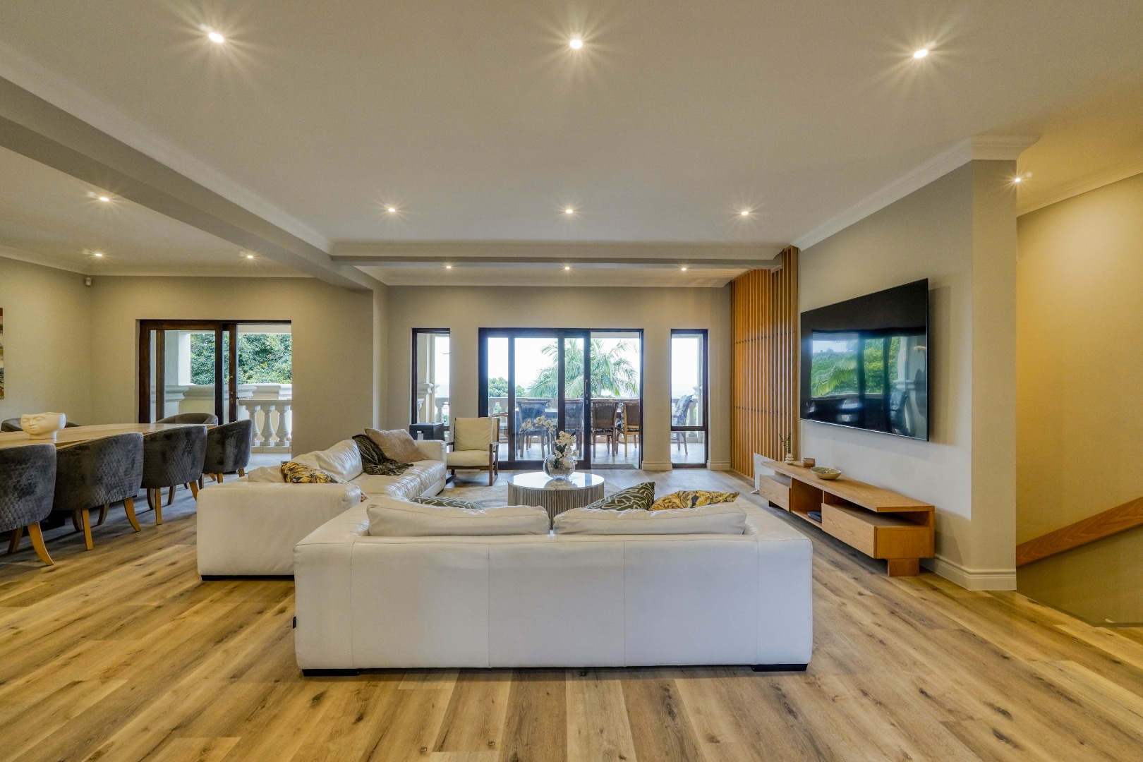The main living level welcomes you with a generous kitchen that flows into the dining area and then into two spacious lounges. These living areas all open onto a large balcony fitted with two built in braais, creating a perfect setting for hosting and relaxed outdoor meals while enjoying the views. Between the two lounges, a central staircase leads down to an impressive entertainment level featuring a built in bar and a large guest toilet. This entertainment area opens directly onto the front garden where a swimming pool completes the outdoor leisure space.