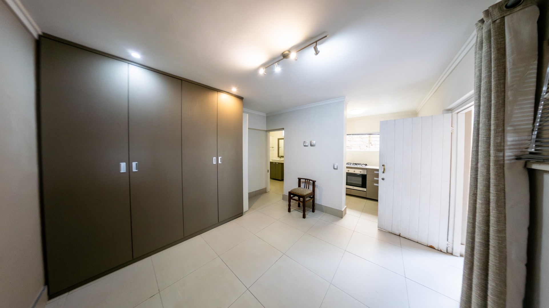 Features one spacious bedroom with built-in cupboards, an en-suite bathroom with a shower, and a fitted kitchen with a gas hob.