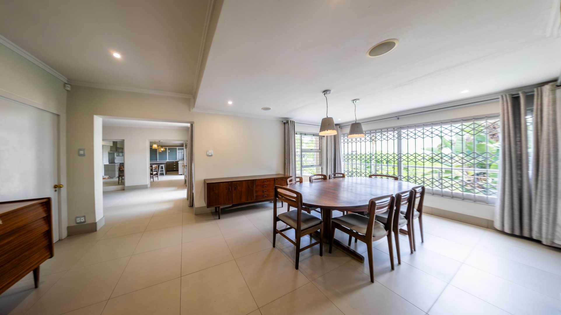 The layout includes two distinct dining areas—one formal for lavish celebrations and one informal for everyday family meals.