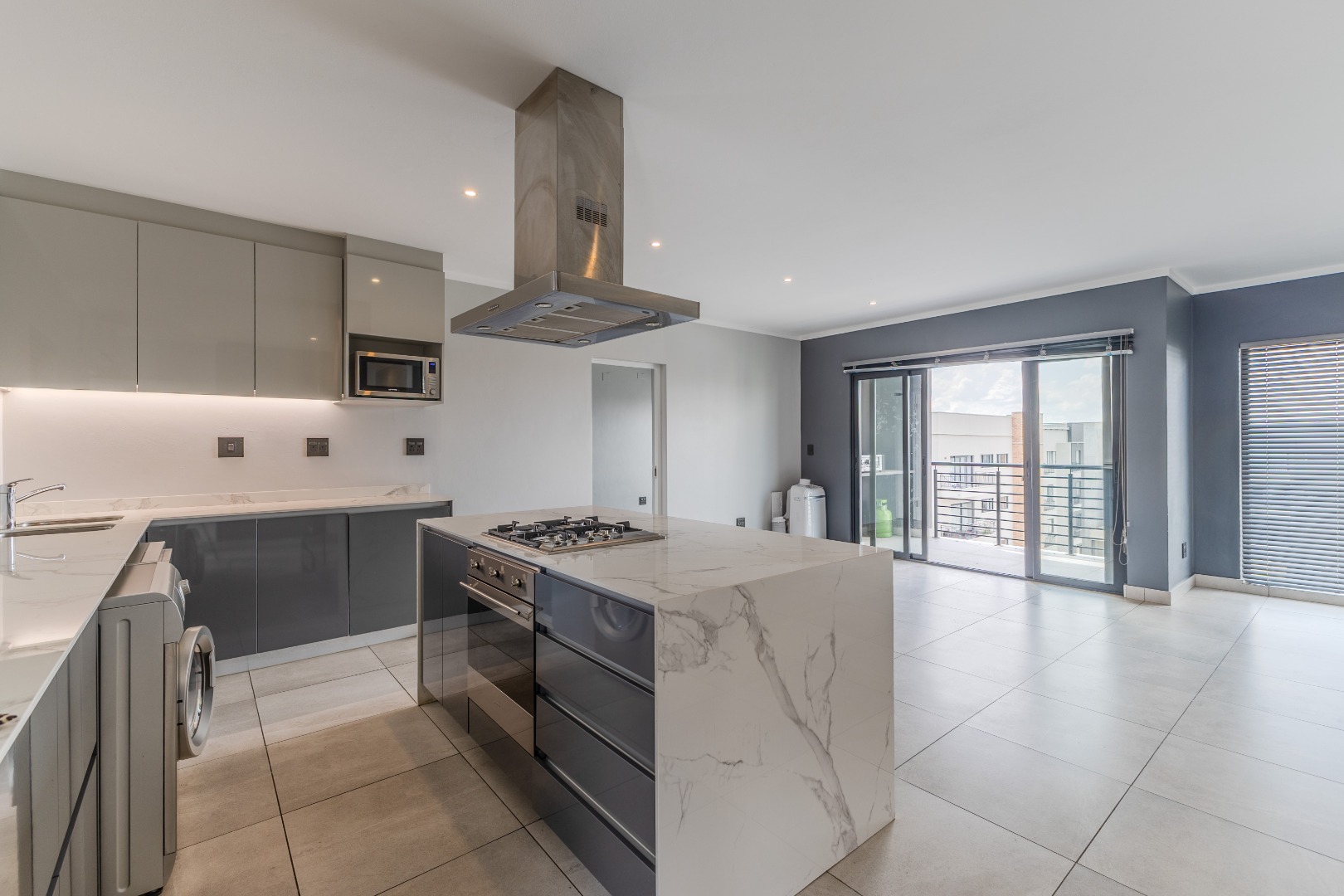 The open-plan layout connects the kitchen, dining, and living areas, creating an inviting space ideal for both everyday living and entertaining. The modern kitchen features high-end finishes and includes a washer and dryer for added ease.