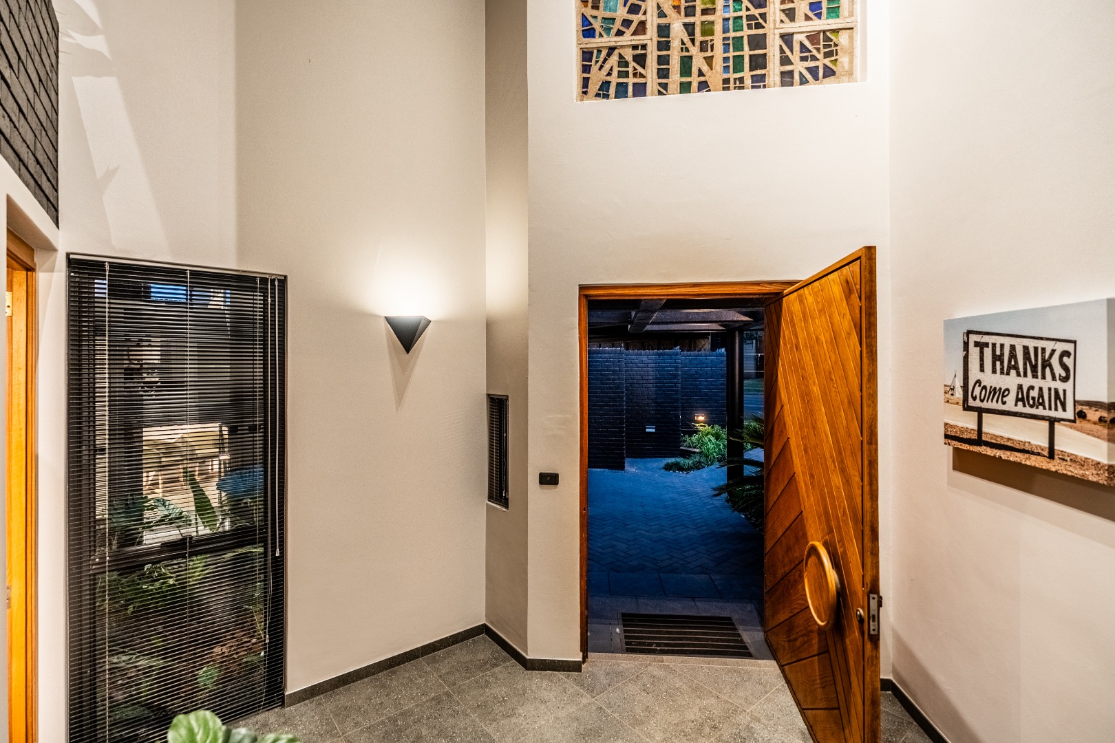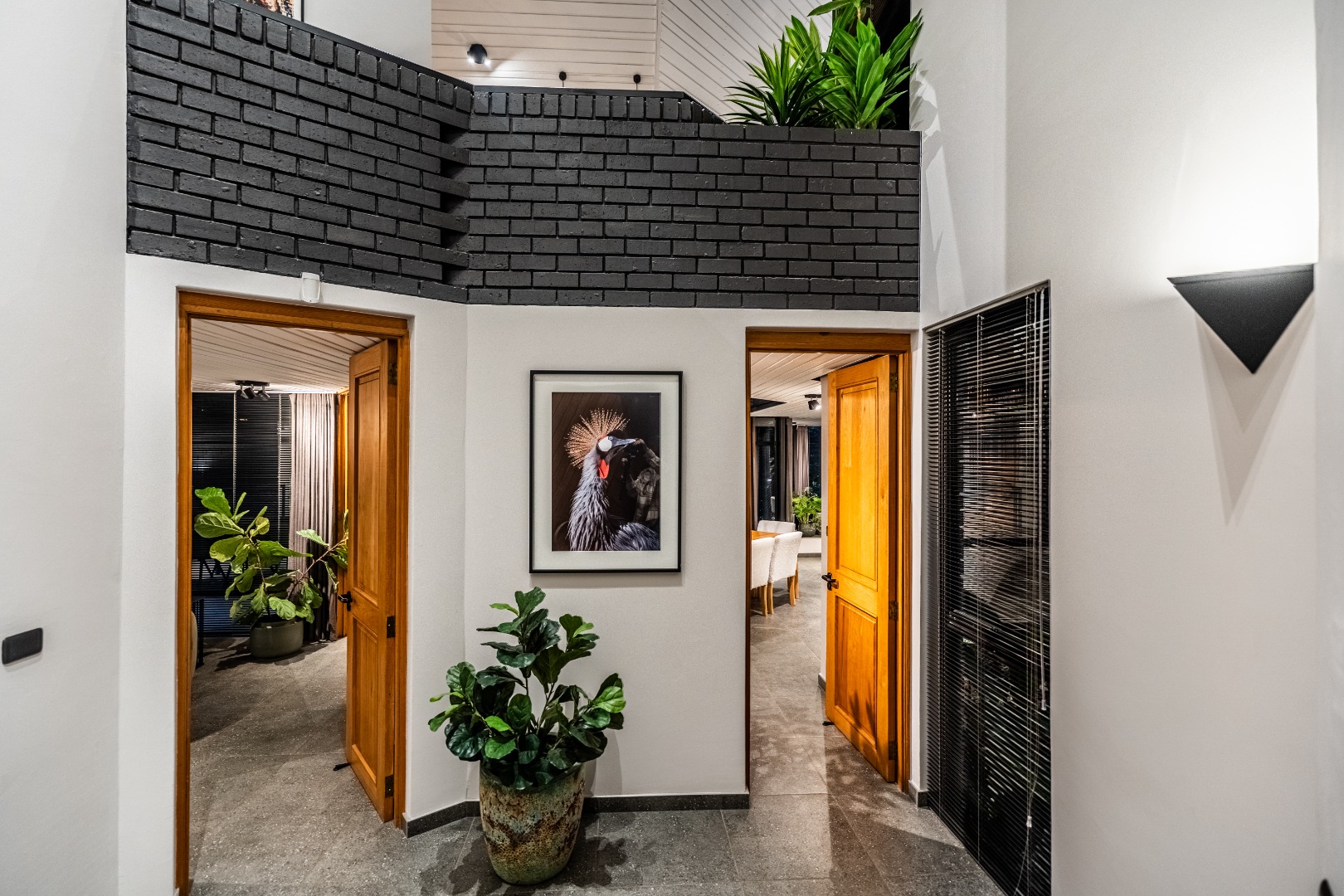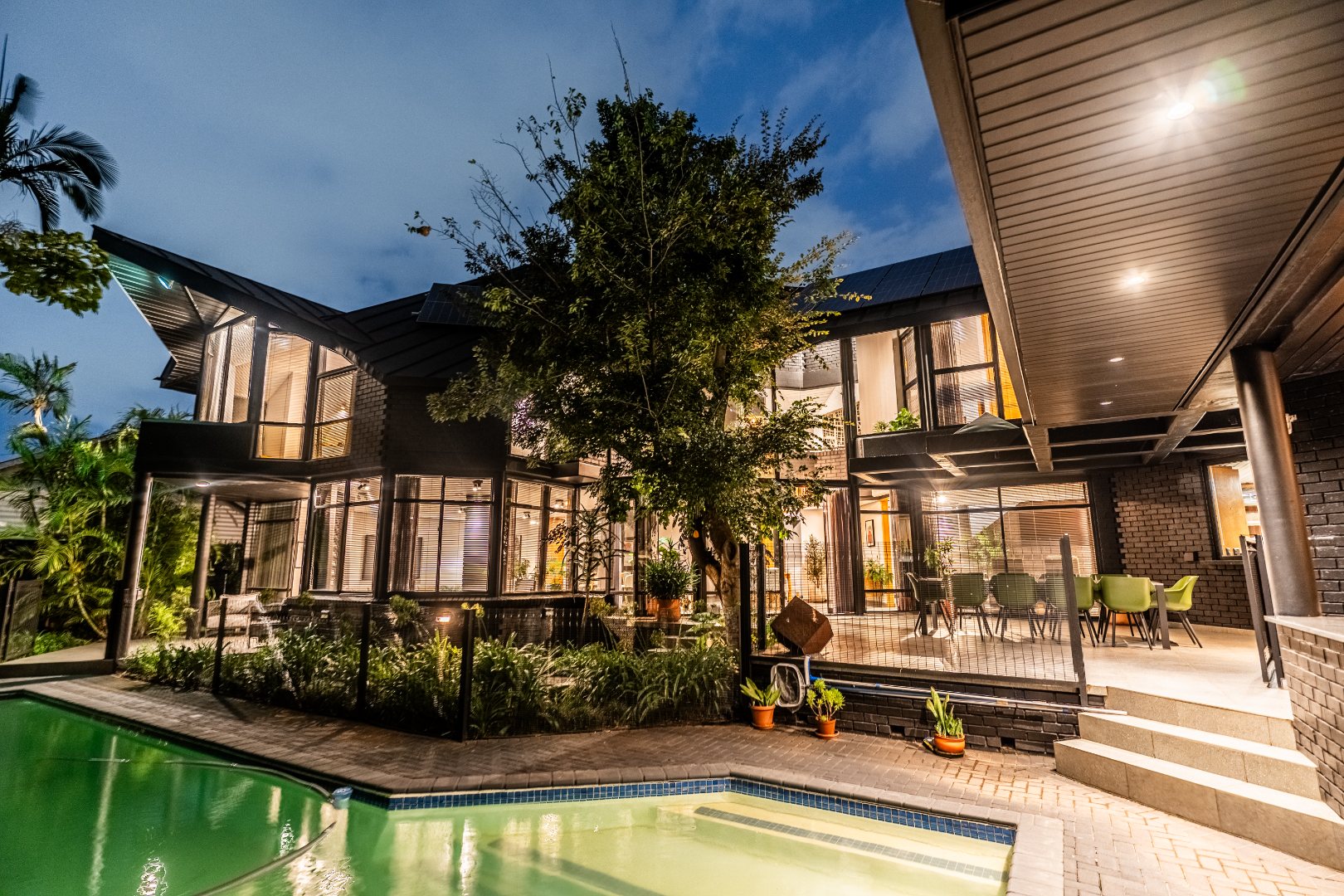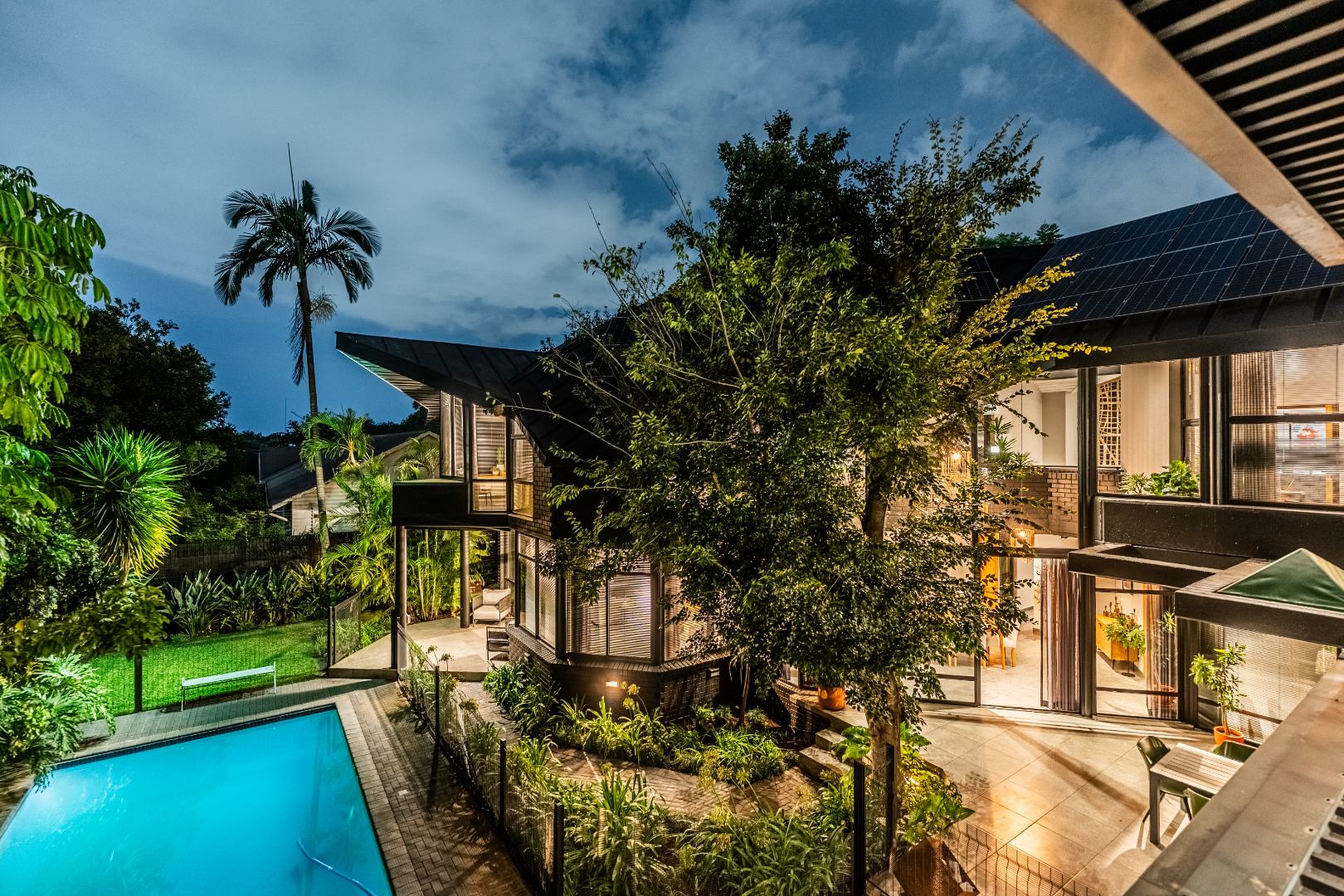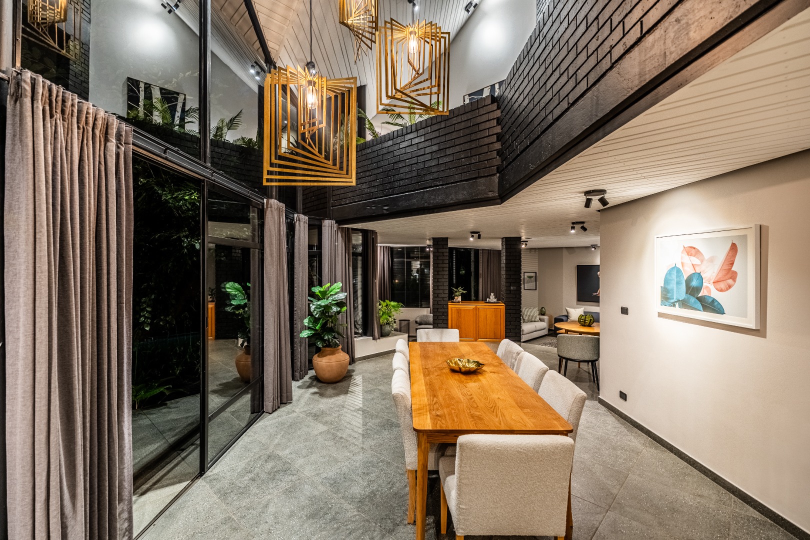 As you enter through the grand lead-glass entrance, you are welcomed by double-volume spaces and an abundance of natural light. The home is engineered for comfort with double-cavity walls providing superior insulation and soundproofing. The master retreat is a true sanctuary featuring a private reading nook overlooking the garden, a walk-in wardrobe, and a designer en-suite bathroom bathed in light from a curated skylight. For visiting family or long-term guests, the guest wing offers complete privacy with its own separate entrance, private balcony, en-suite bathroom, and kitchenette. The gourmet kitchen serves as the heart of the home, equipped with a gas stove, pantry, and scullery, featuring a clever serving hatch that connects the interior to the outdoor entertainment deck.