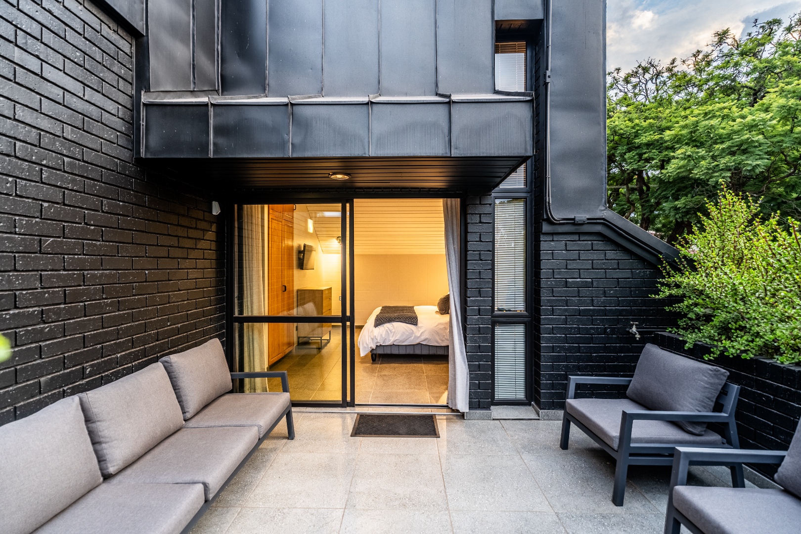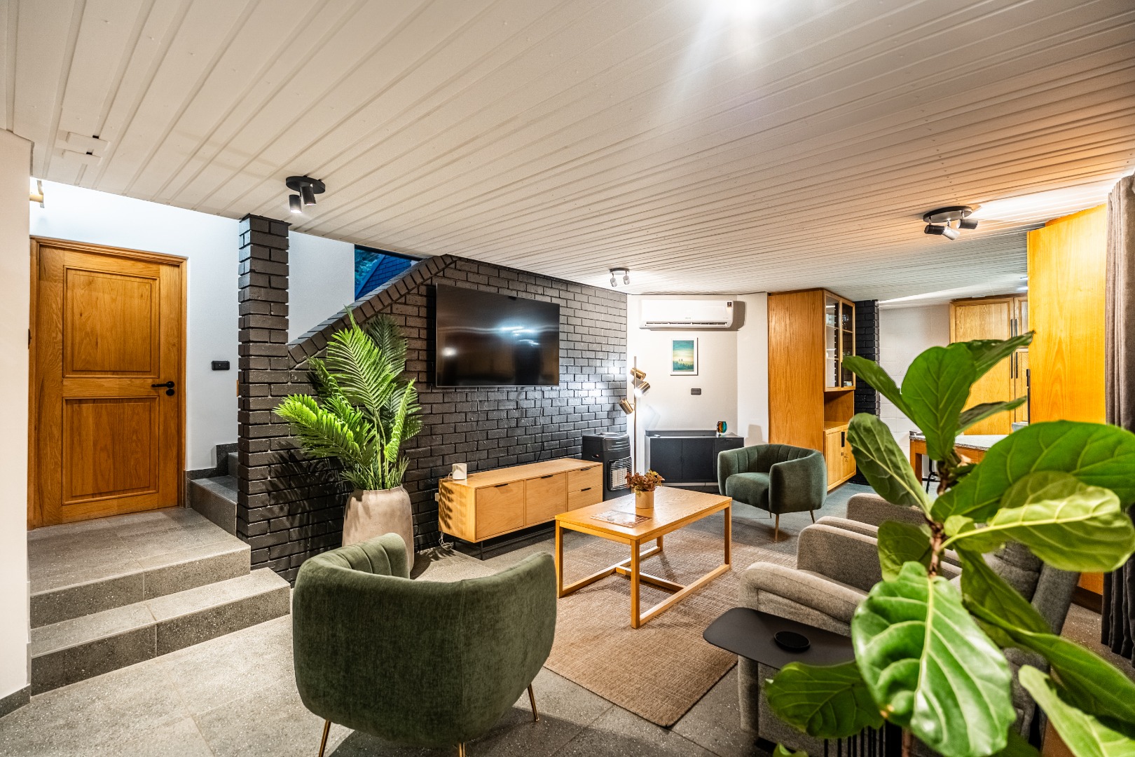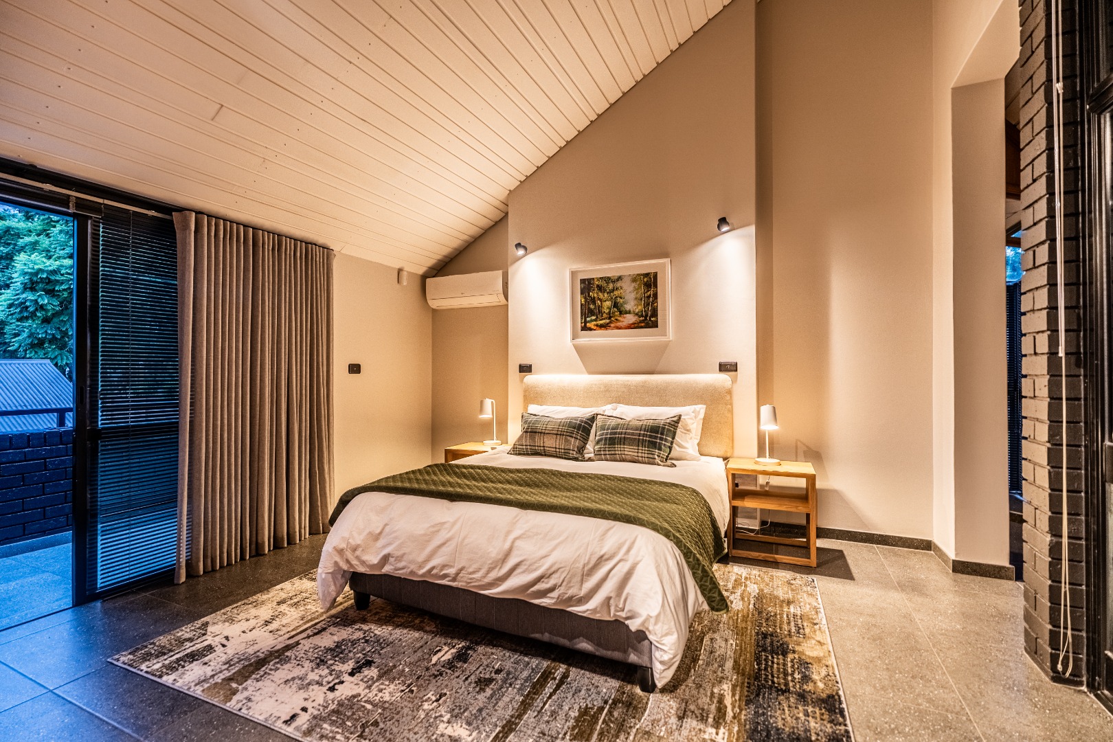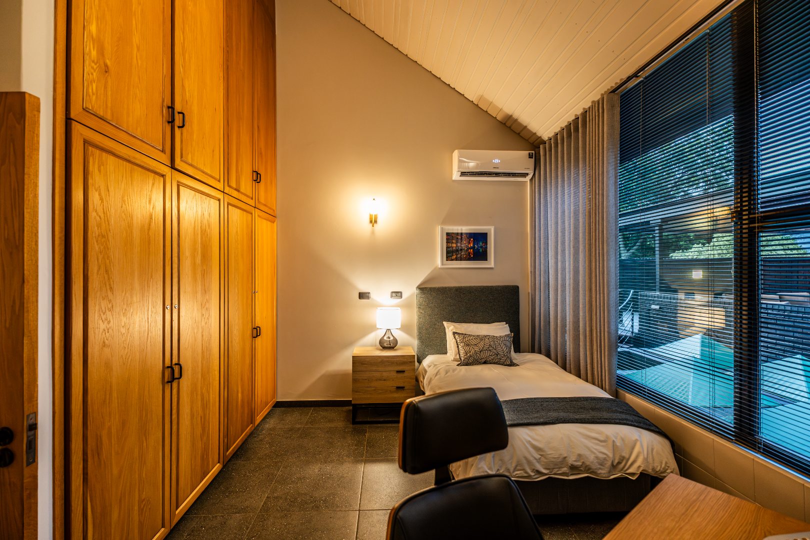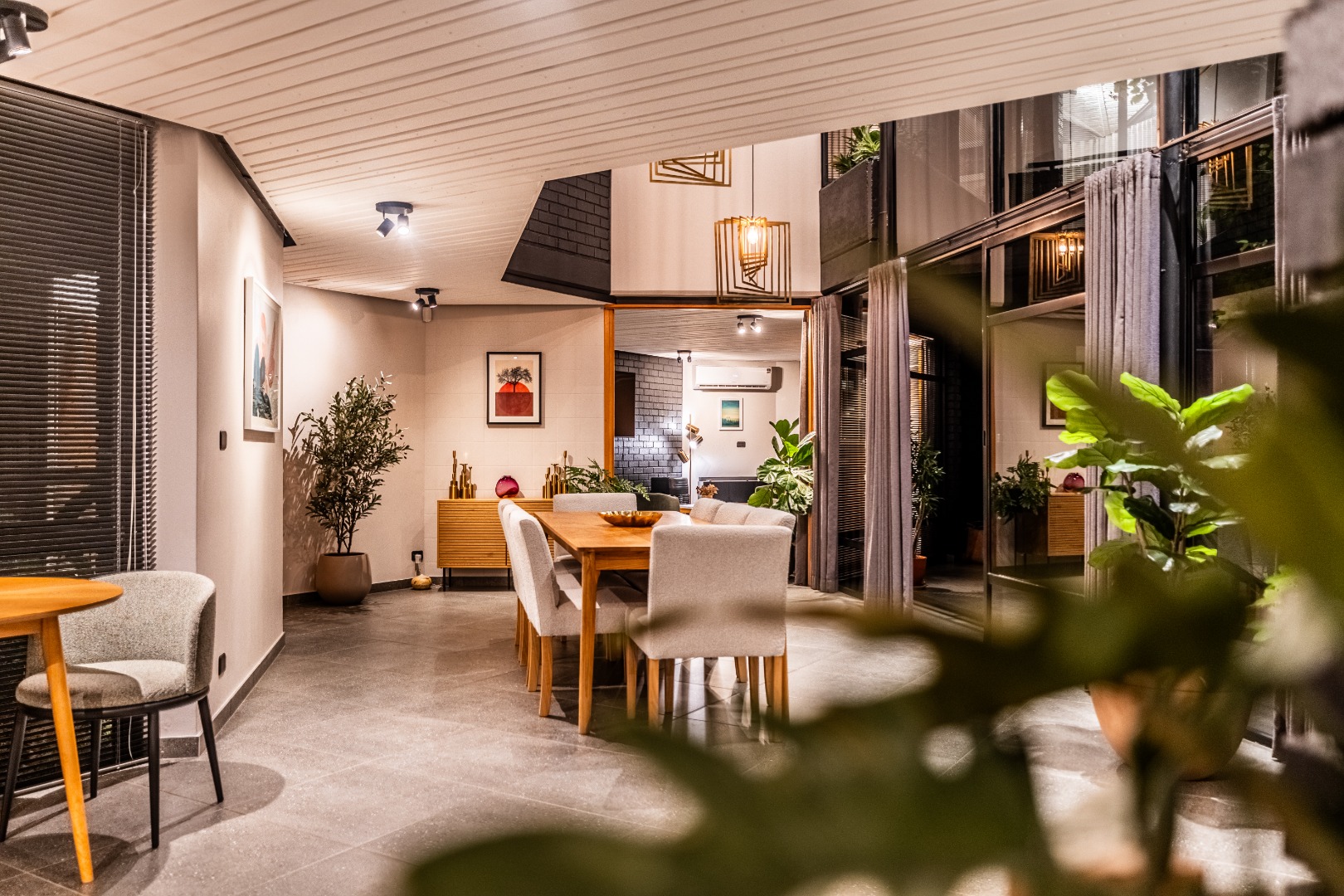 As you enter through the grand lead-glass entrance, you are welcomed by double-volume spaces and an abundance of natural light. The home is engineered for comfort with double-cavity walls providing superior insulation and soundproofing. The master retreat is a true sanctuary featuring a private reading nook overlooking the garden, a walk-in wardrobe, and a designer en-suite bathroom bathed in light from a curated skylight. For visiting family or long-term guests, the guest wing offers complete privacy with its own separate entrance, private balcony, en-suite bathroom, and kitchenette. The gourmet kitchen serves as the heart of the home, equipped with a gas stove, pantry, and scullery, featuring a clever serving hatch that connects the interior to the outdoor entertainment deck.