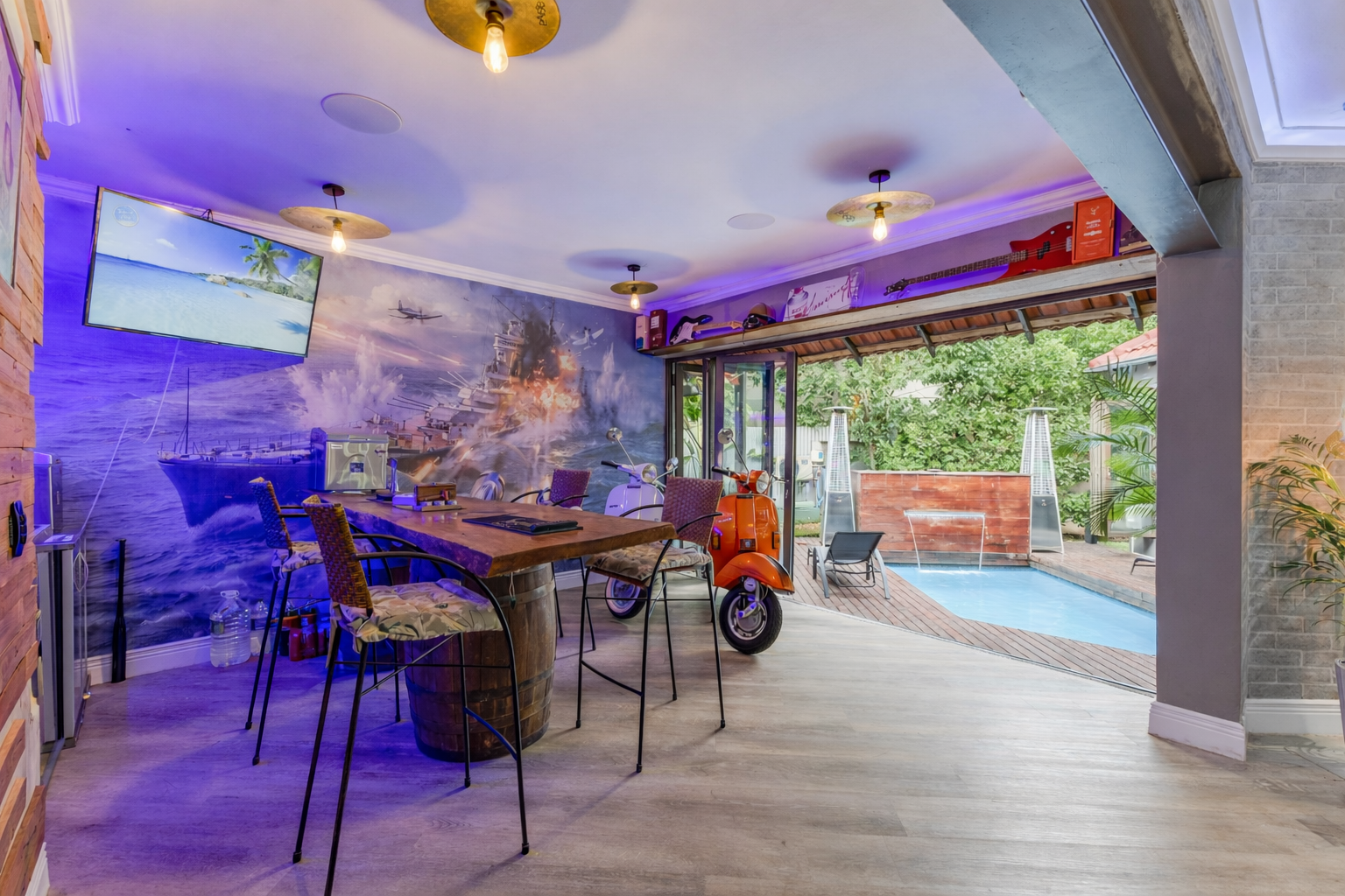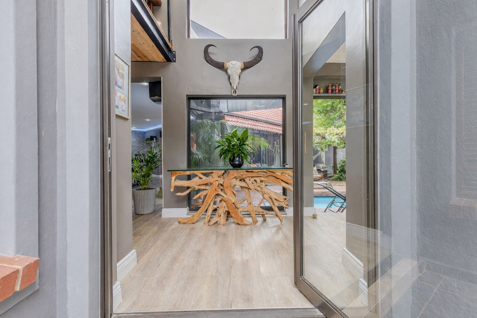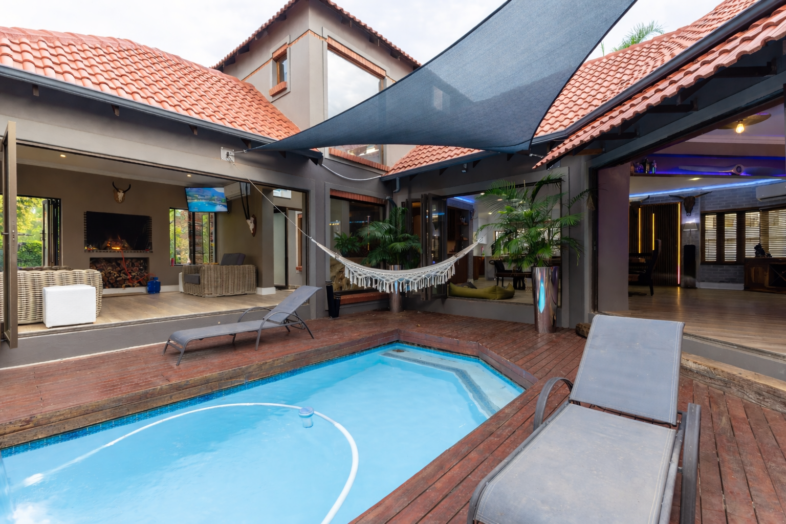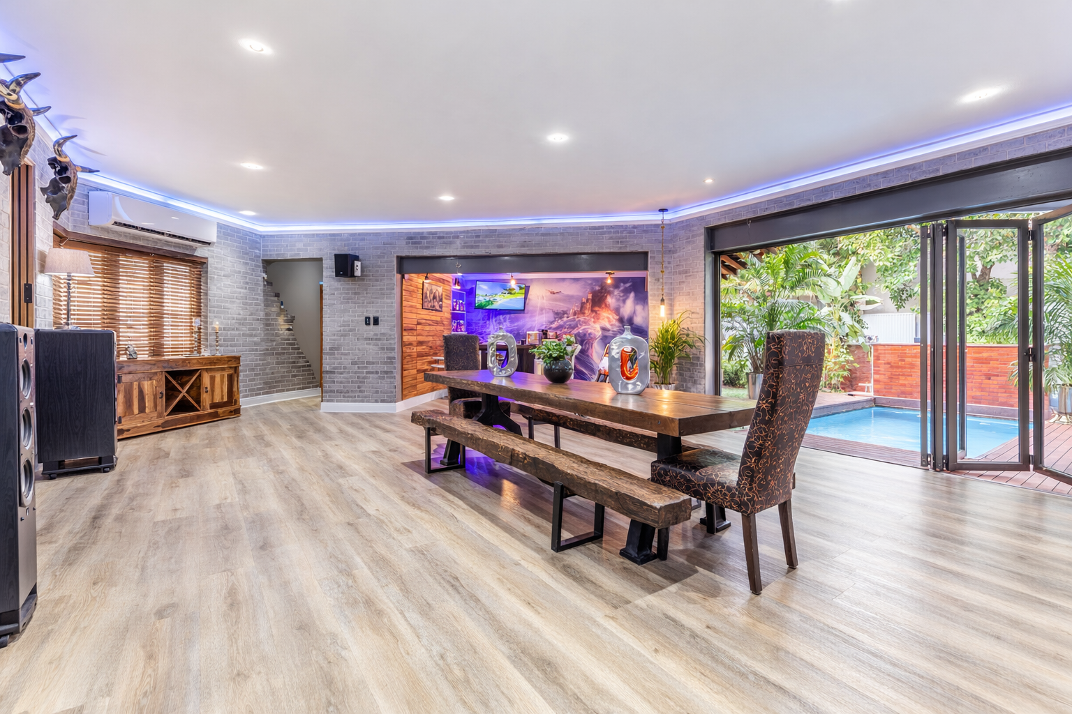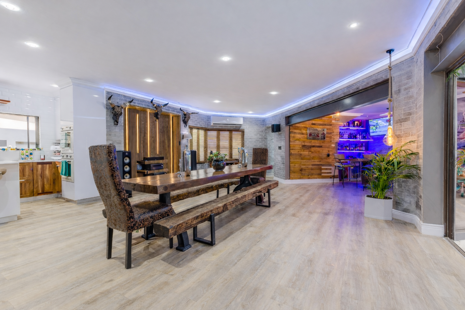 The beautifully redesigned kitchen flows seamlessly into an expansive open-plan entertainment area, complete with a stylish bar and built-in braai. These spaces open directly onto the swimming pool, creating the perfect indoor-outdoor lifestyle for entertaining family and friends.