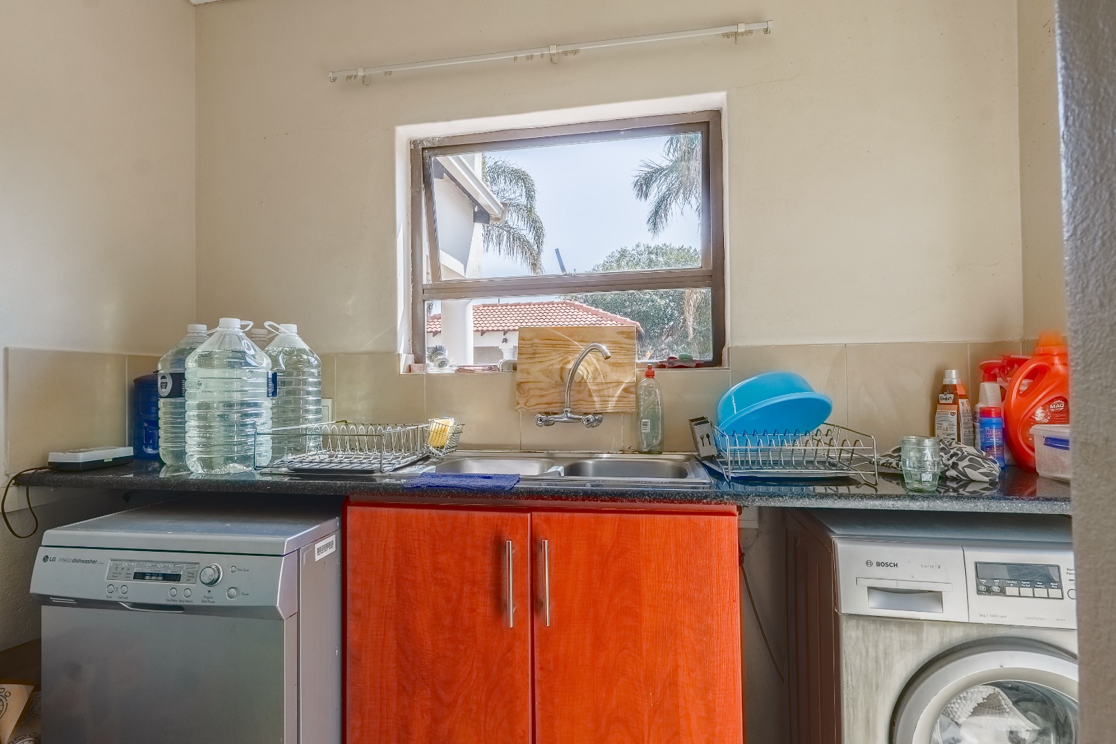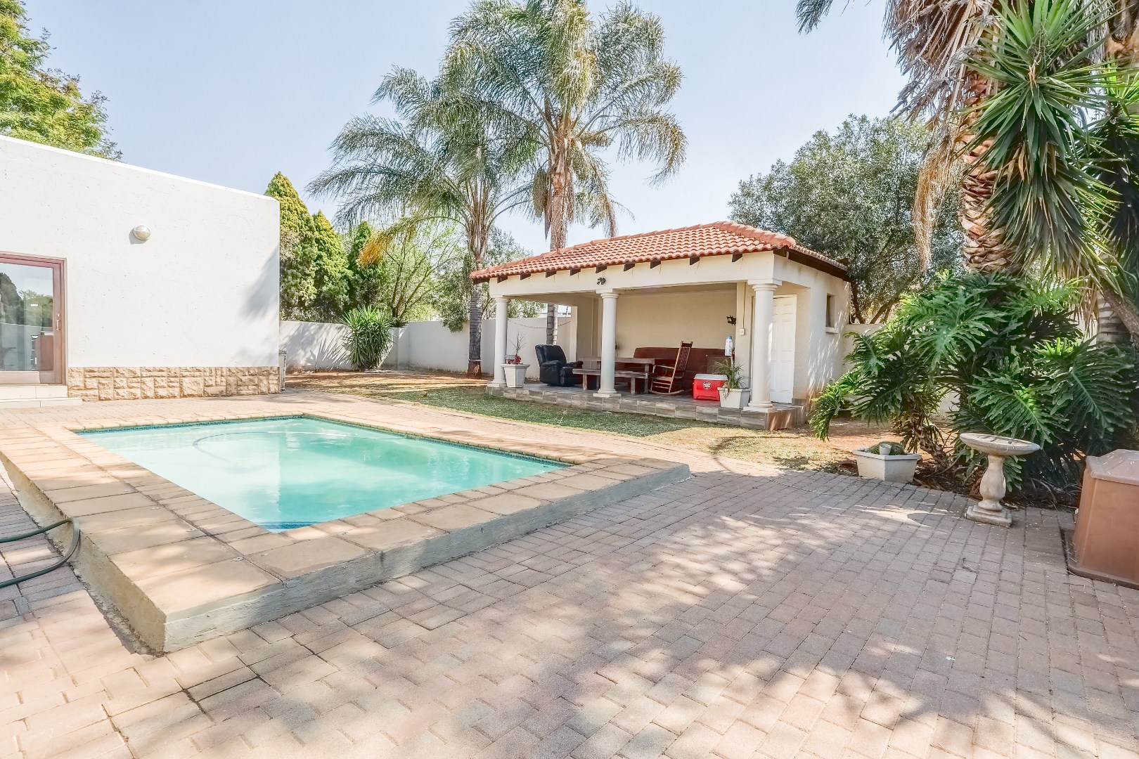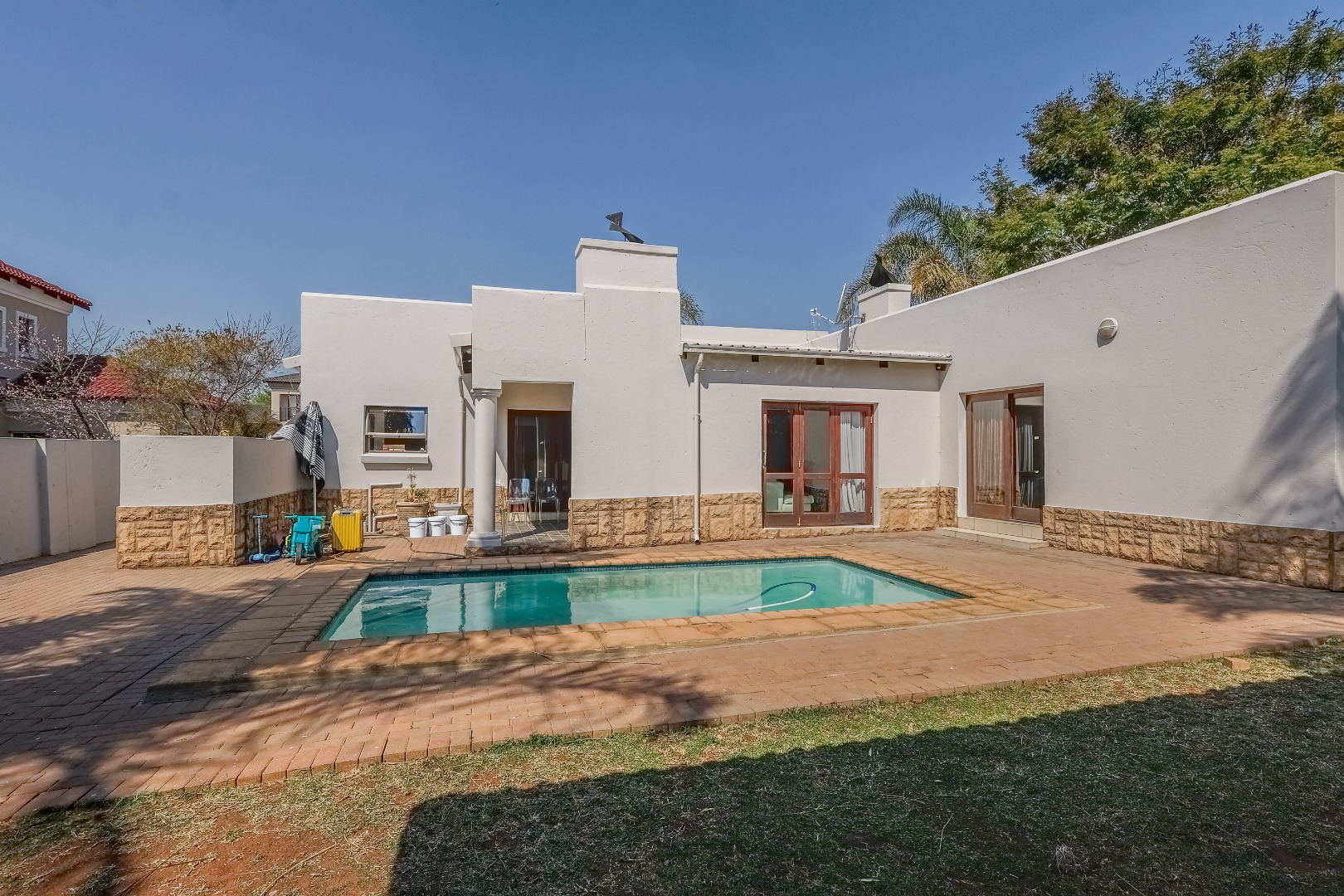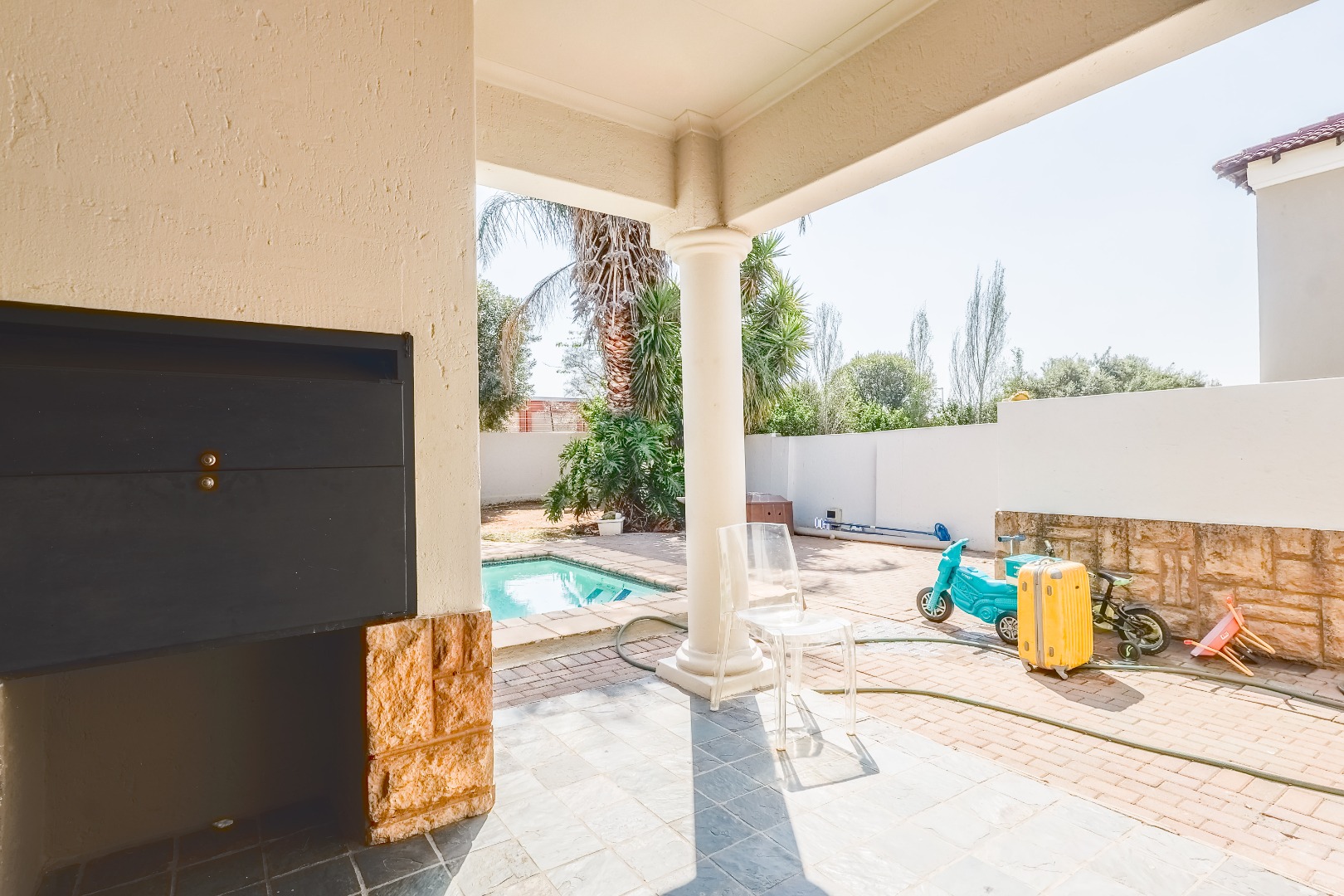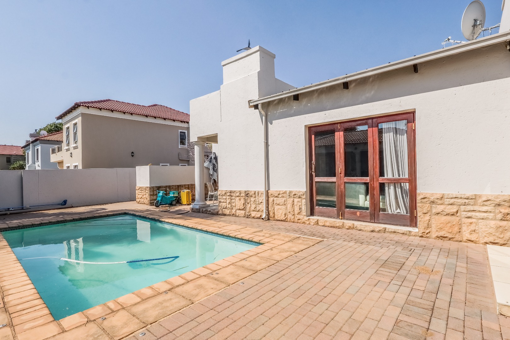 The kitchen is a chef's delight, featuring sleek countertops, an electric hob with an electric oven, and a separate scullery that provides additional storage and space for appliances. The layout is designed for effortless daily living and hosting guests. Outdoor living is a central feature of this property, with a dedicated covered patio and a built-in braai, perfect for year round entertaining. This area overlooks a meticulously maintained, compact garden and a sparkling swimming pool, creating a private retreat for relaxation and fun-filled family weekends. The home’s three bedrooms are a haven of peace and privacy. The main bedroom includes a full en-suite bathroom and generous cupboard space.