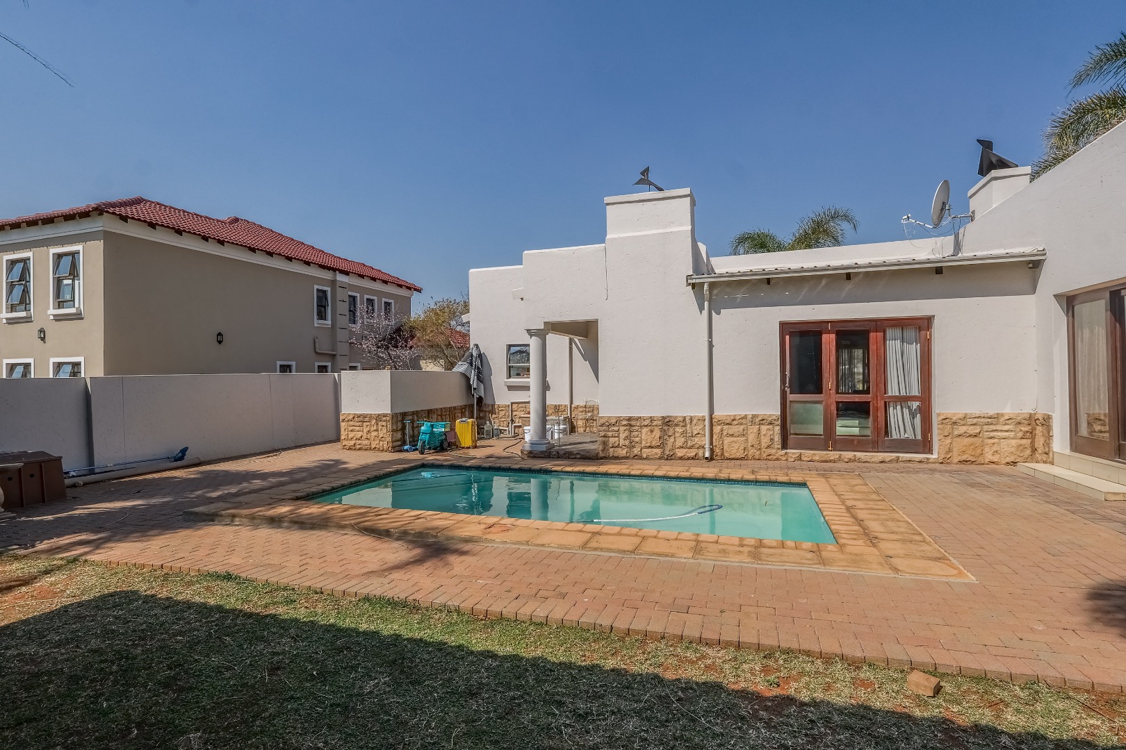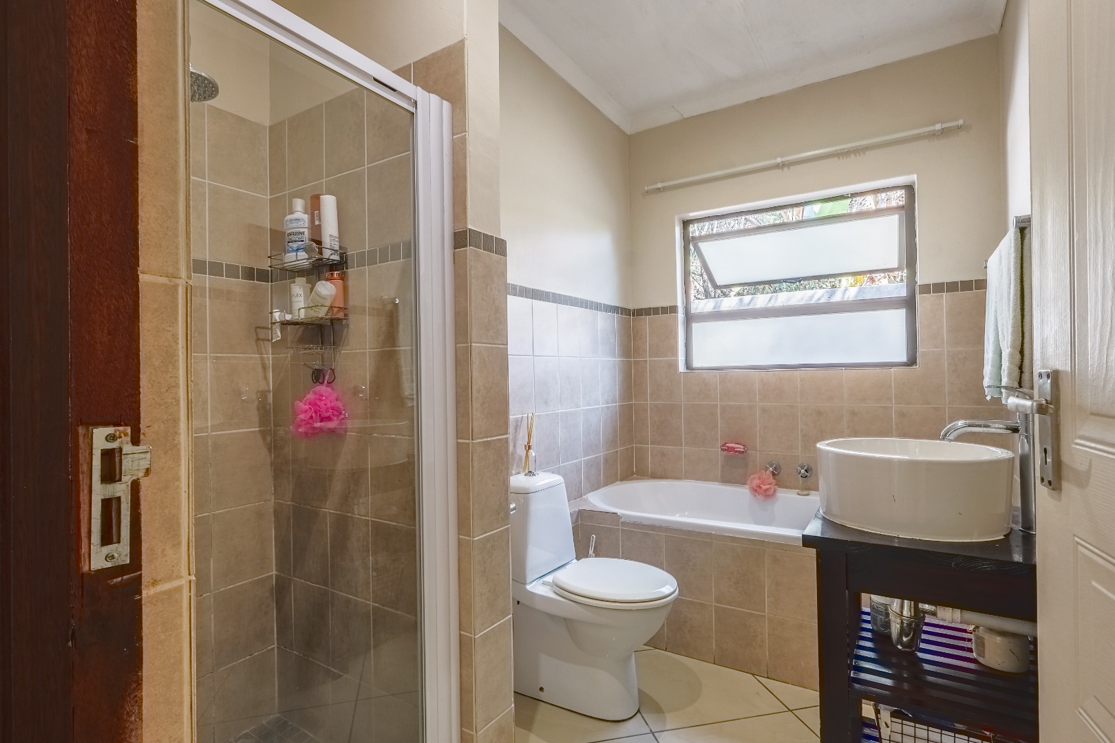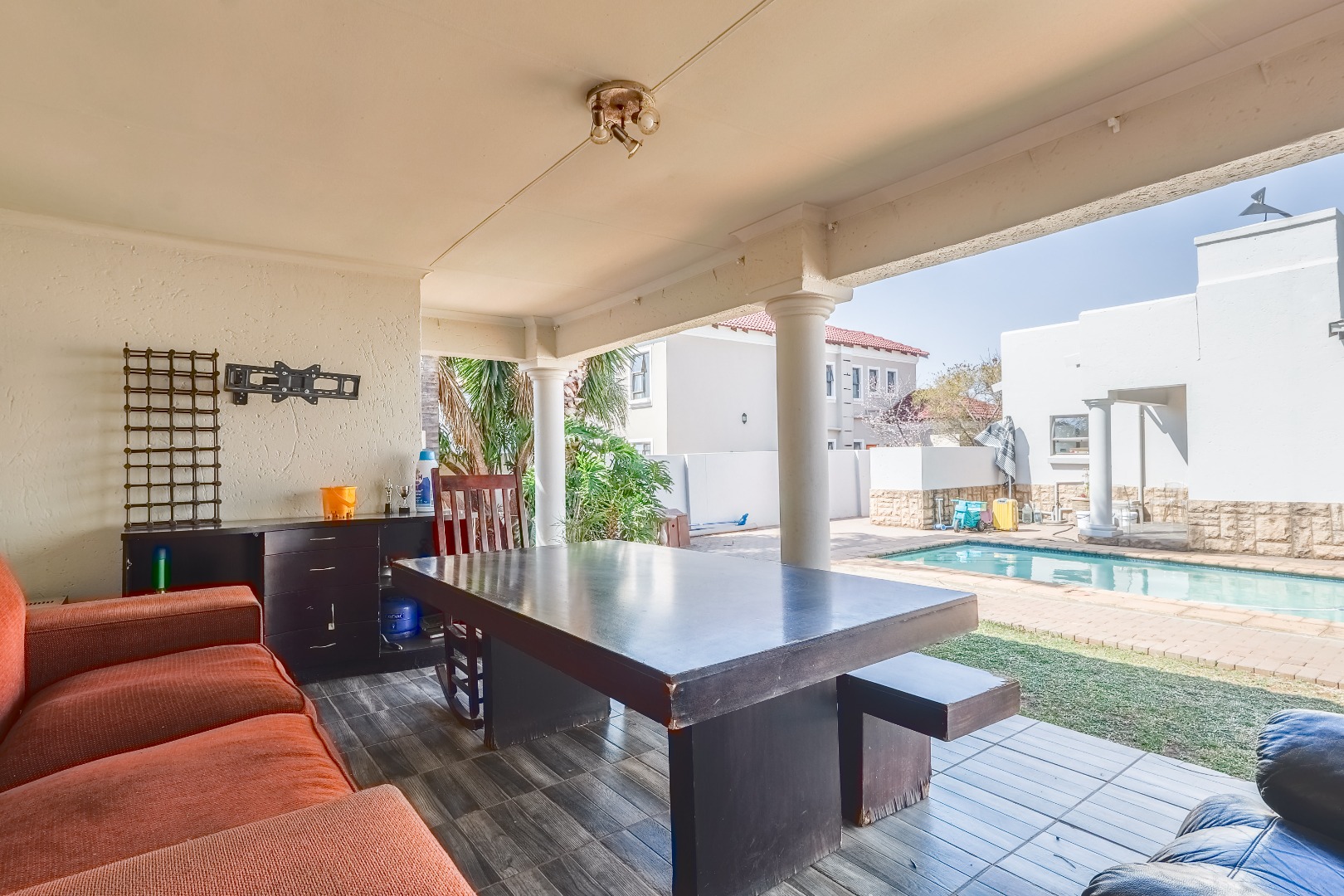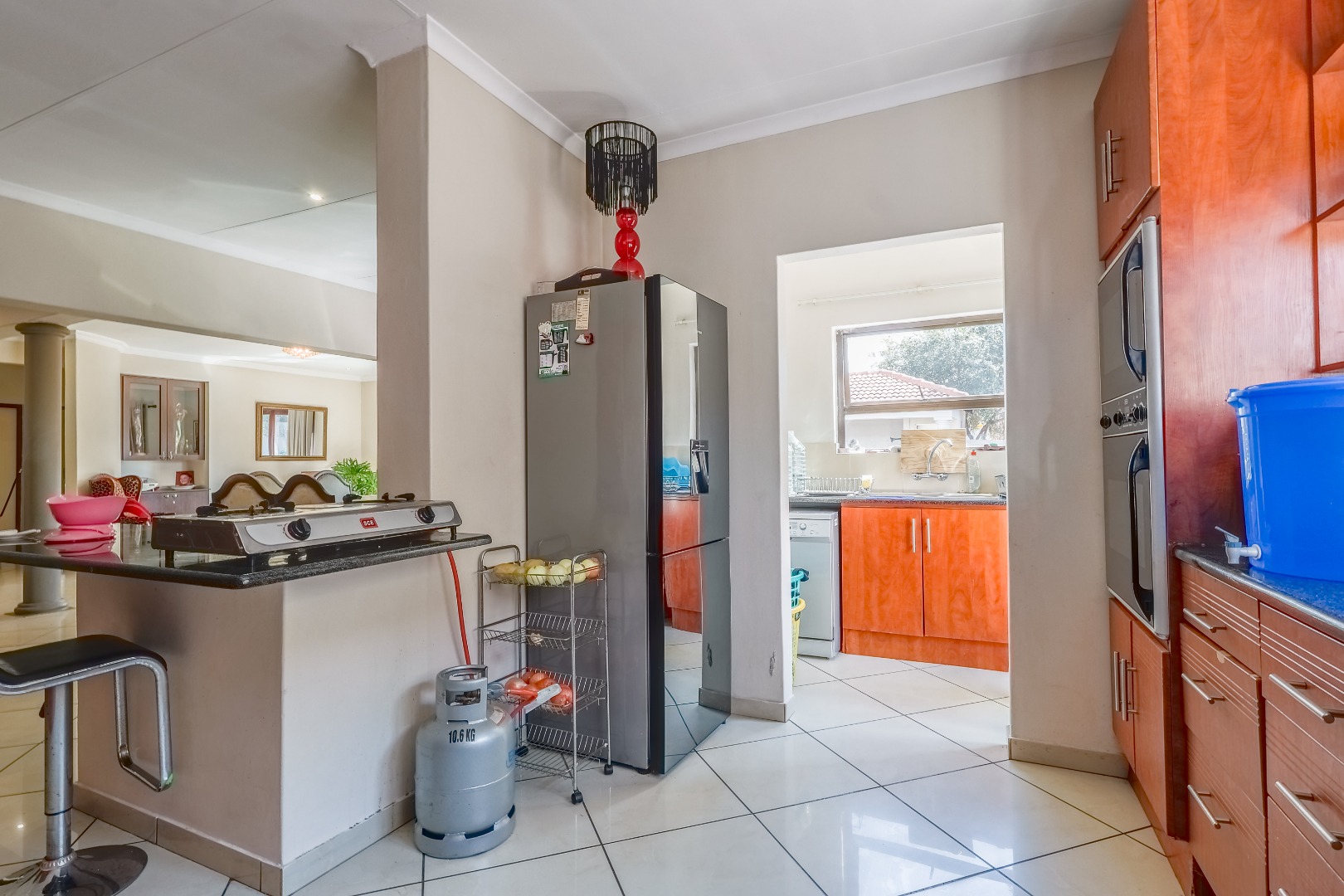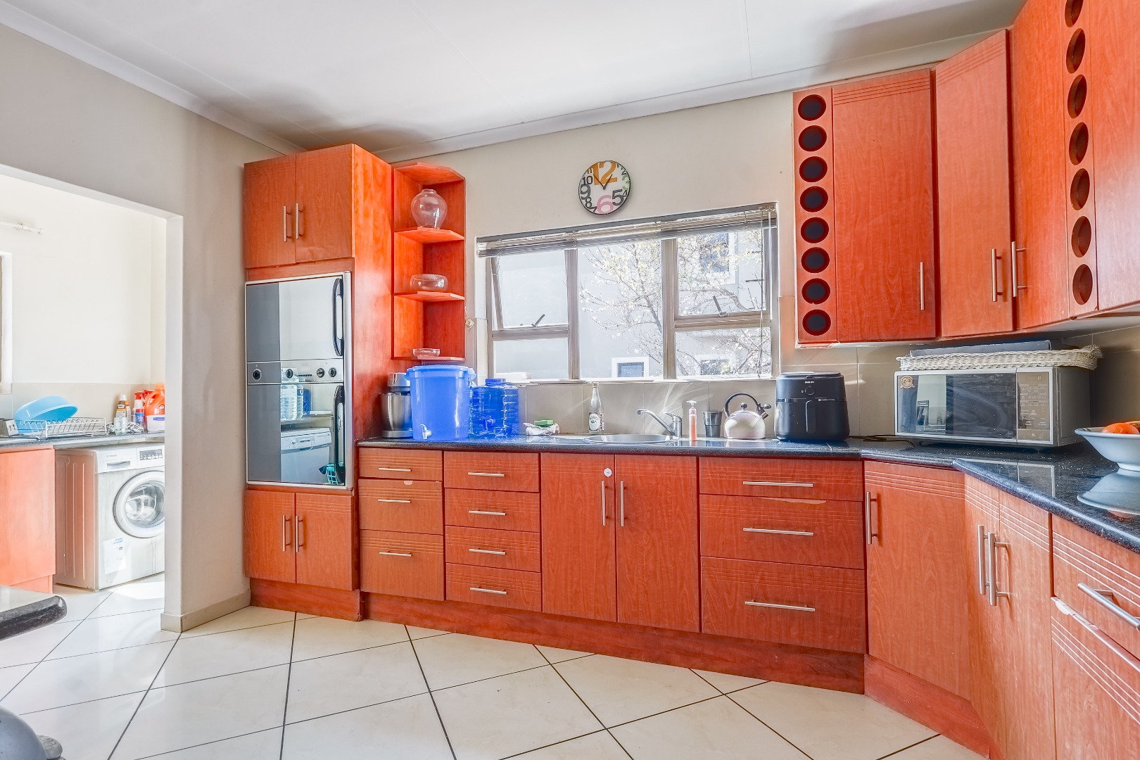 The kitchen is a chef's delight, featuring sleek countertops, an electric hob with an electric oven, and a separate scullery that provides additional storage and space for appliances. The layout is designed for effortless daily living and hosting guests. Outdoor living is a central feature of this property, with a dedicated covered patio and a built-in braai, perfect for year round entertaining. This area overlooks a meticulously maintained, compact garden and a sparkling swimming pool, creating a private retreat for relaxation and fun-filled family weekends. The home’s three bedrooms are a haven of peace and privacy. The main bedroom includes a full en-suite bathroom and generous cupboard space.