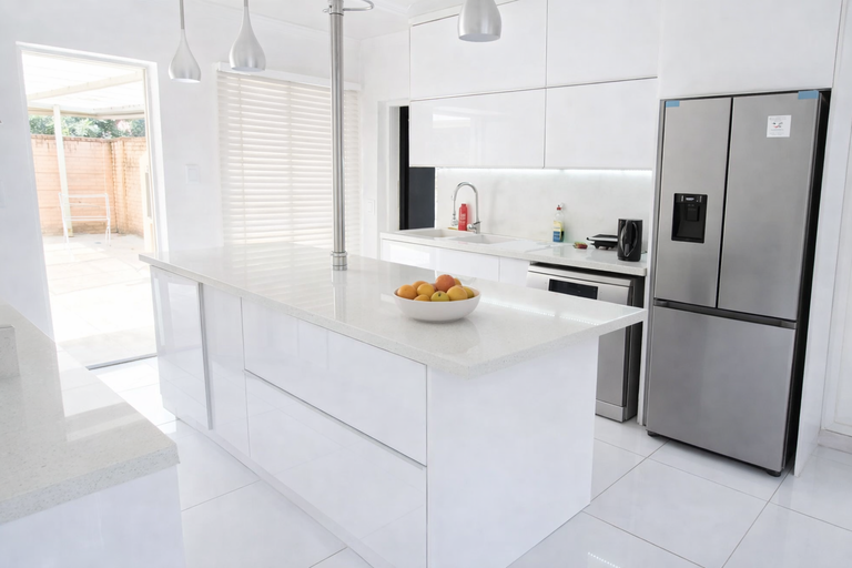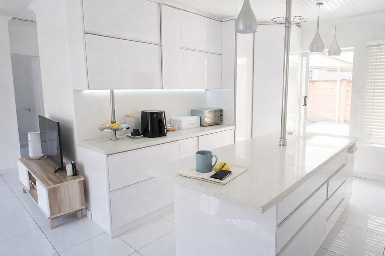 low-maintenance finish, while the open-plan layout seamlessly connects the