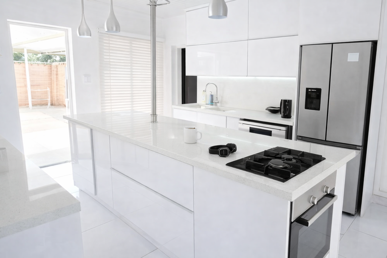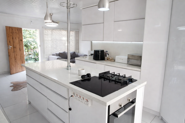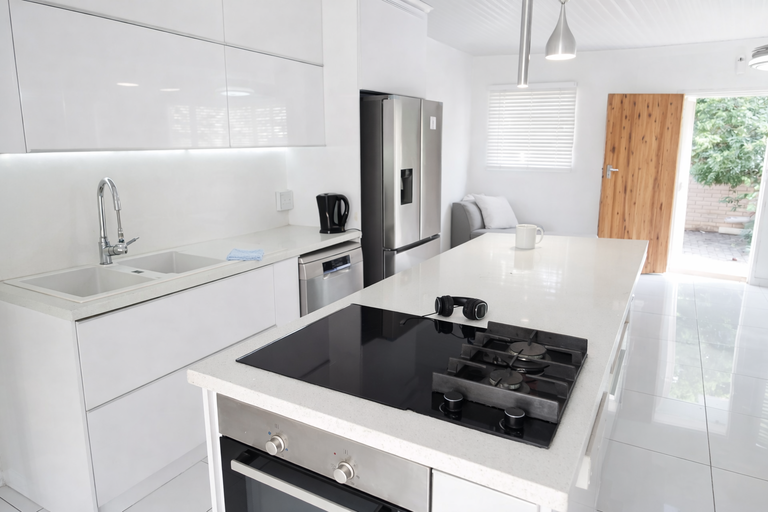 The modern kitchen is fitted with a gas stove