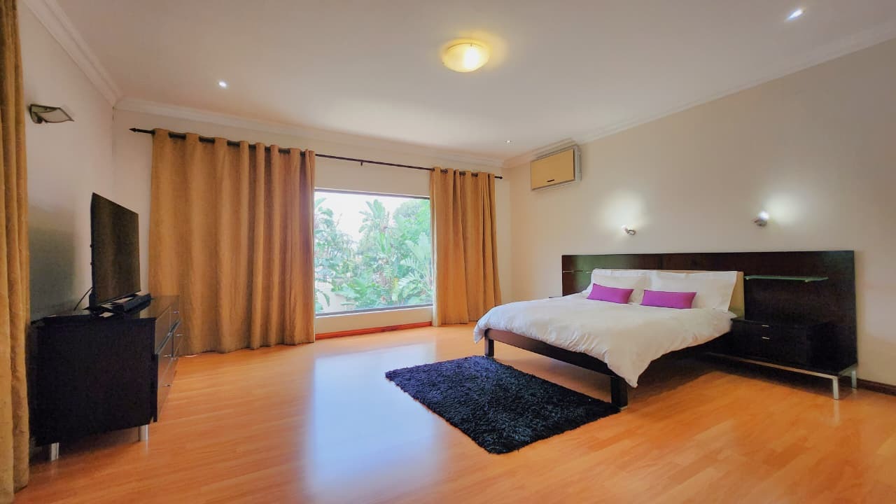 All four bedrooms feature laminated flooring and generous natural light, with each room opening onto a shared covered balcony that enhances the home’s indoor-outdoor appeal. The main bedroom includes an en-suite bathroom, walk-in closet, and a fireplace, providing a private and well-appointed retreat. The garden and swimming pool offer an inviting outdoor space, supported by practical additions such as a double automated garage.