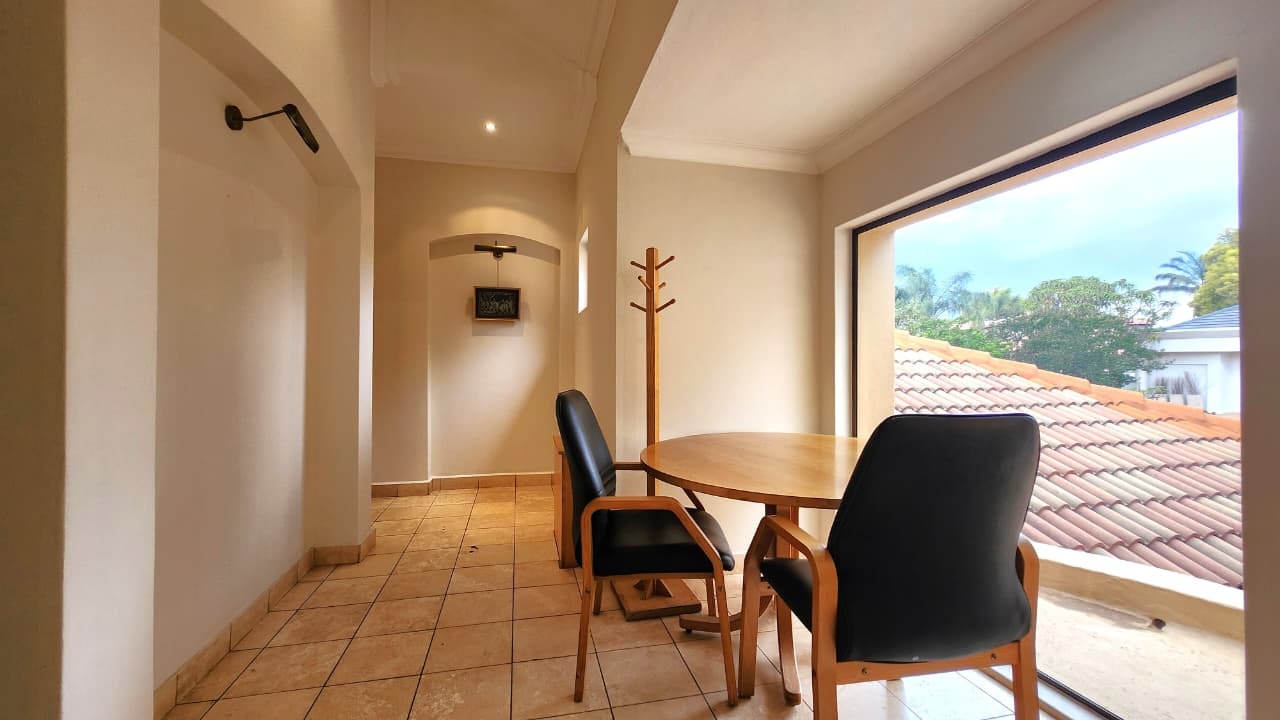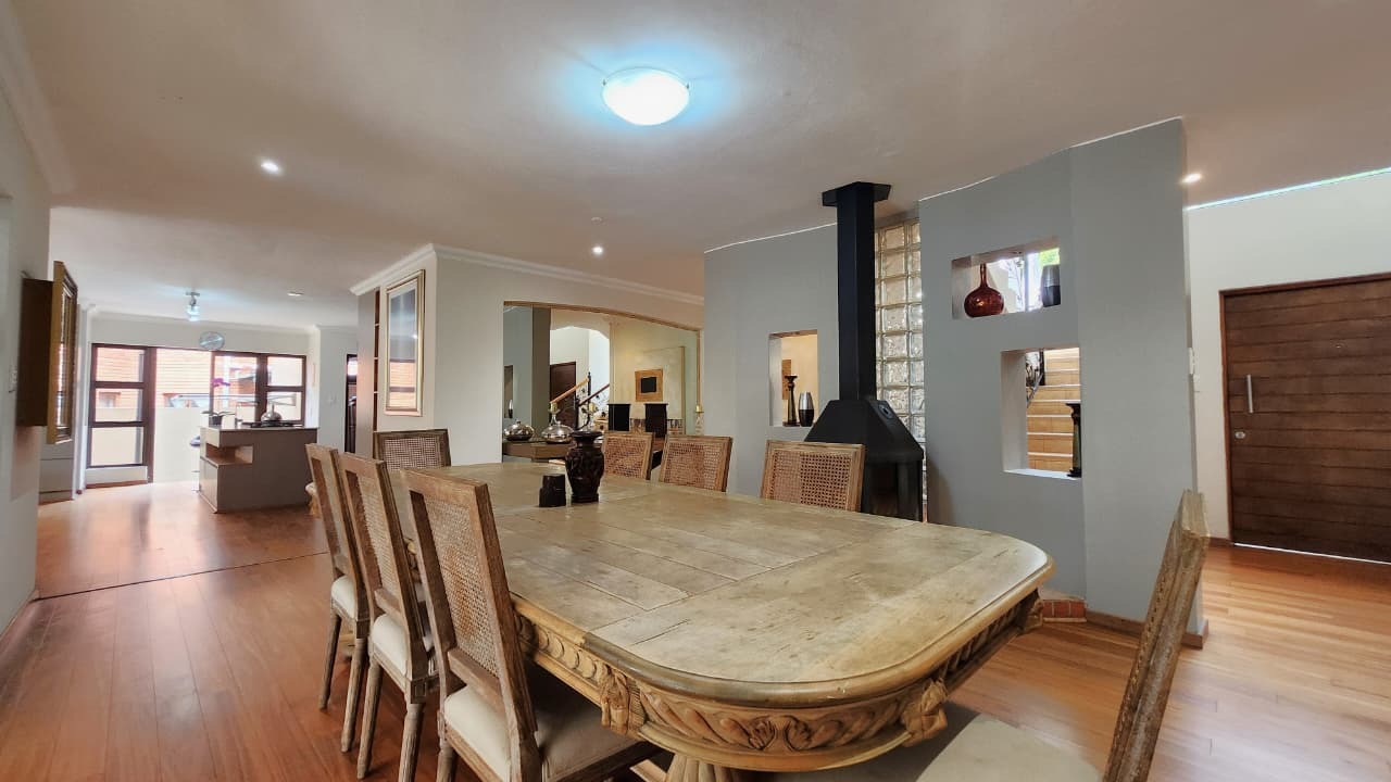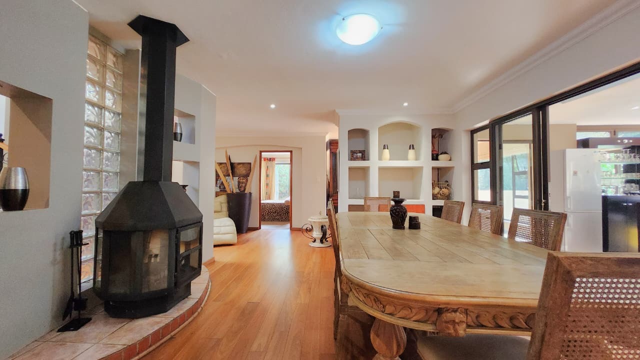 The ground floor features an inviting open-plan layout where the living and dining areas connect effortlessly to an enclosed entertainment veranda with a built-in braai. A dining-room fireplace adds warmth and charm, creating an ideal setting for both relaxed evenings and stylish hosting.
