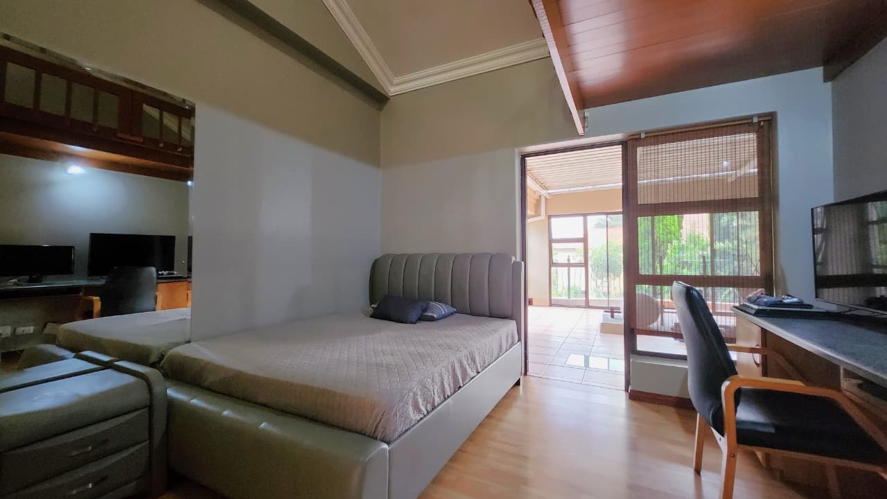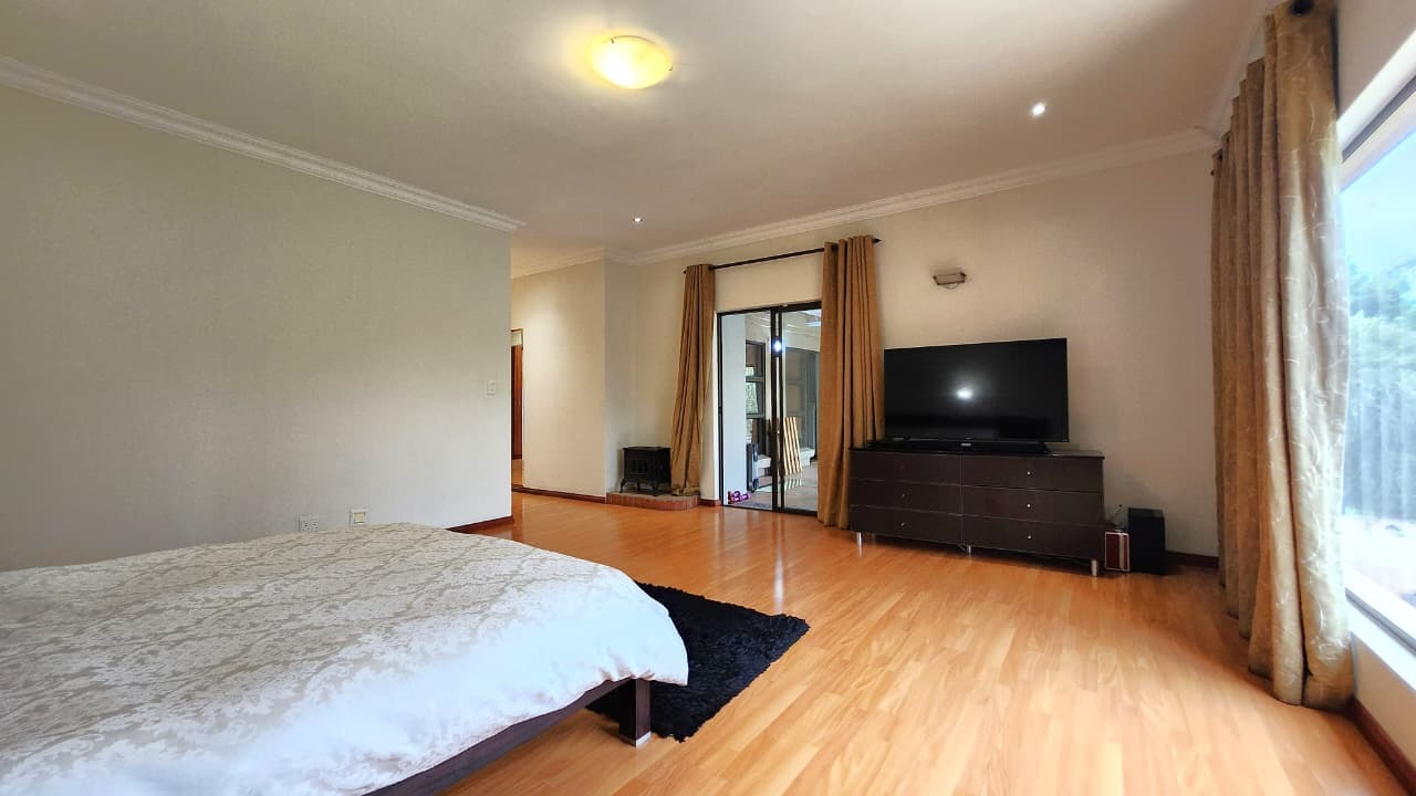 Upstairs, all four bedrooms are fitted with laminated flooring and enjoy beautiful natural light. Each room opens onto a shared covered balcony, enhancing the tranquil, elevated feel of the home. The main suite offers a luxurious private retreat, complete with an en-suite bathroom, walk-in closet, and its own fireplace, perfect for quiet moments of comfort.