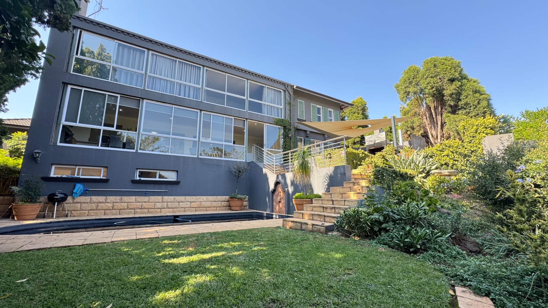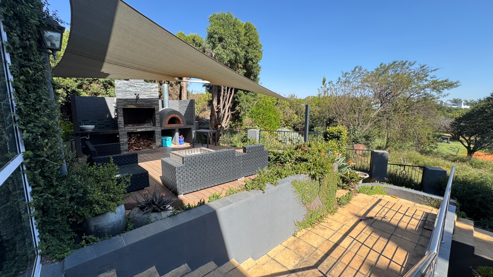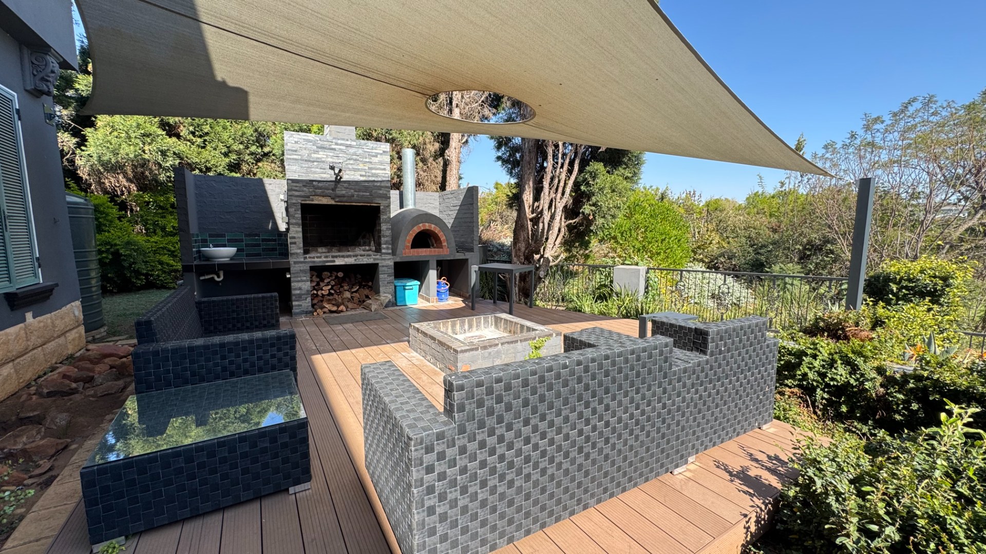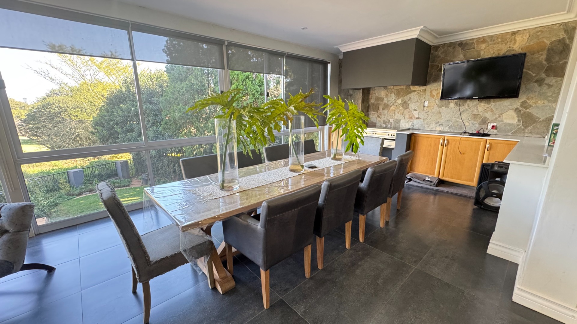 Seamless Indoor-Outdoor Flow: Floor-to-ceiling sliding doors open to an extraordinary outdoor haven featuring a dedicated boma, built-in gas braai, pizza oven, and a sparkling pool set within a lush, landscaped garden.