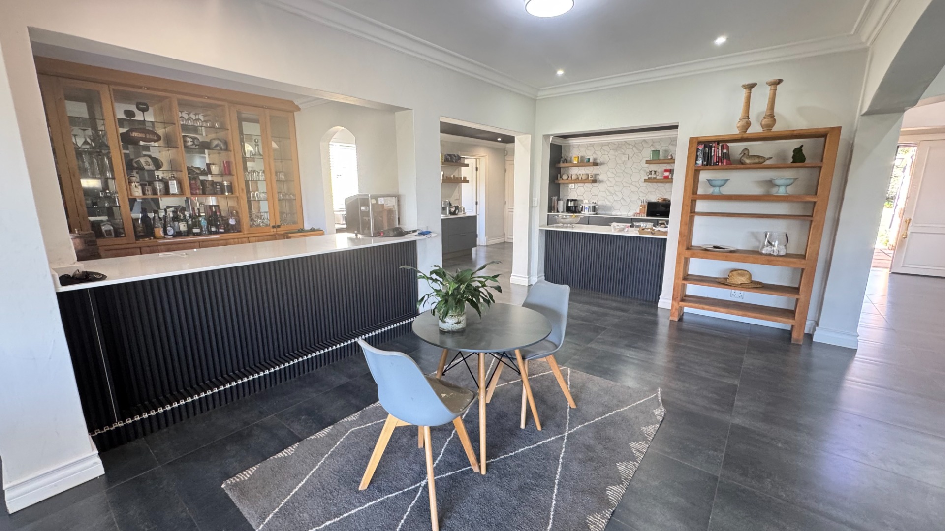 Gourmet Designer Kitchen: Equipped with a gas hob, glass cooktop, breakfast bar, generous pantry, sleek cabinetry, separate scullery, and an elegant bar counter—perfect for both daily living and grand entertaining.