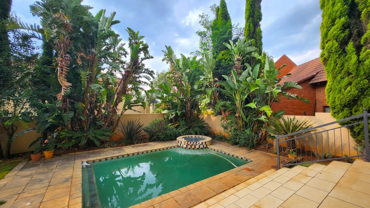 The home features a spacious open-plan design that flows effortlessly from the living and dining areas to a covered patio with a built-in braai, overlooking a beautiful garden and sparkling swimming pool, ideal for entertaining and family gatherings.