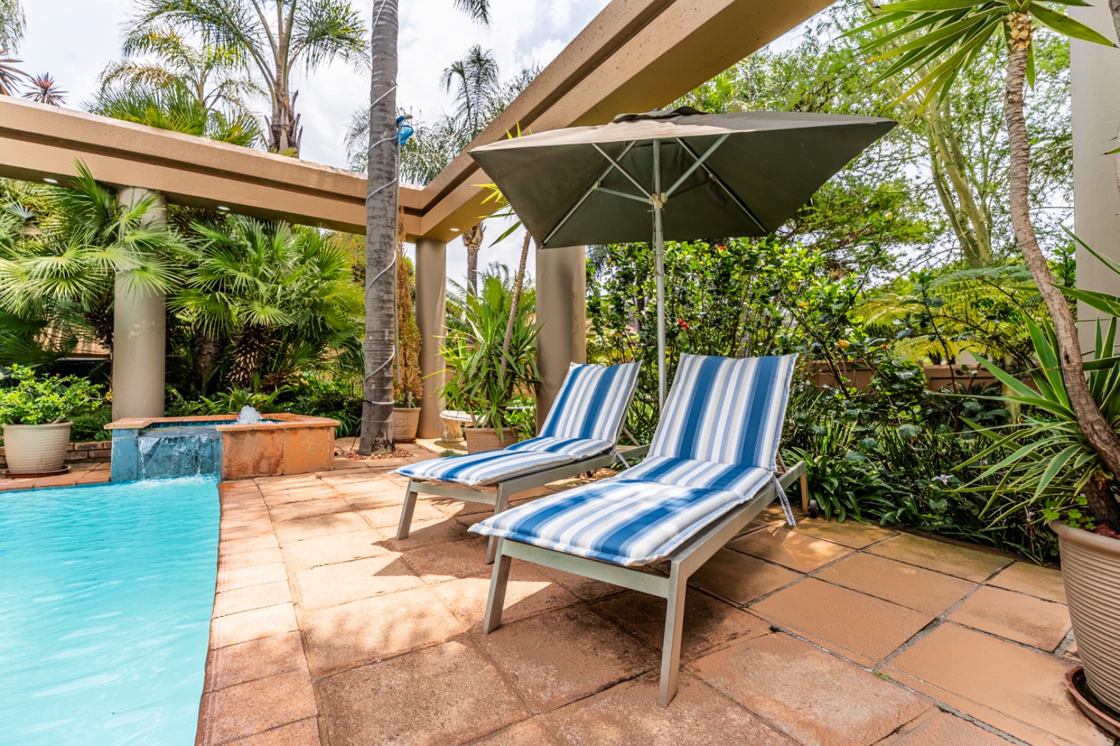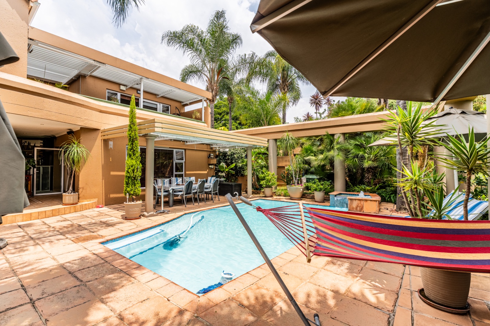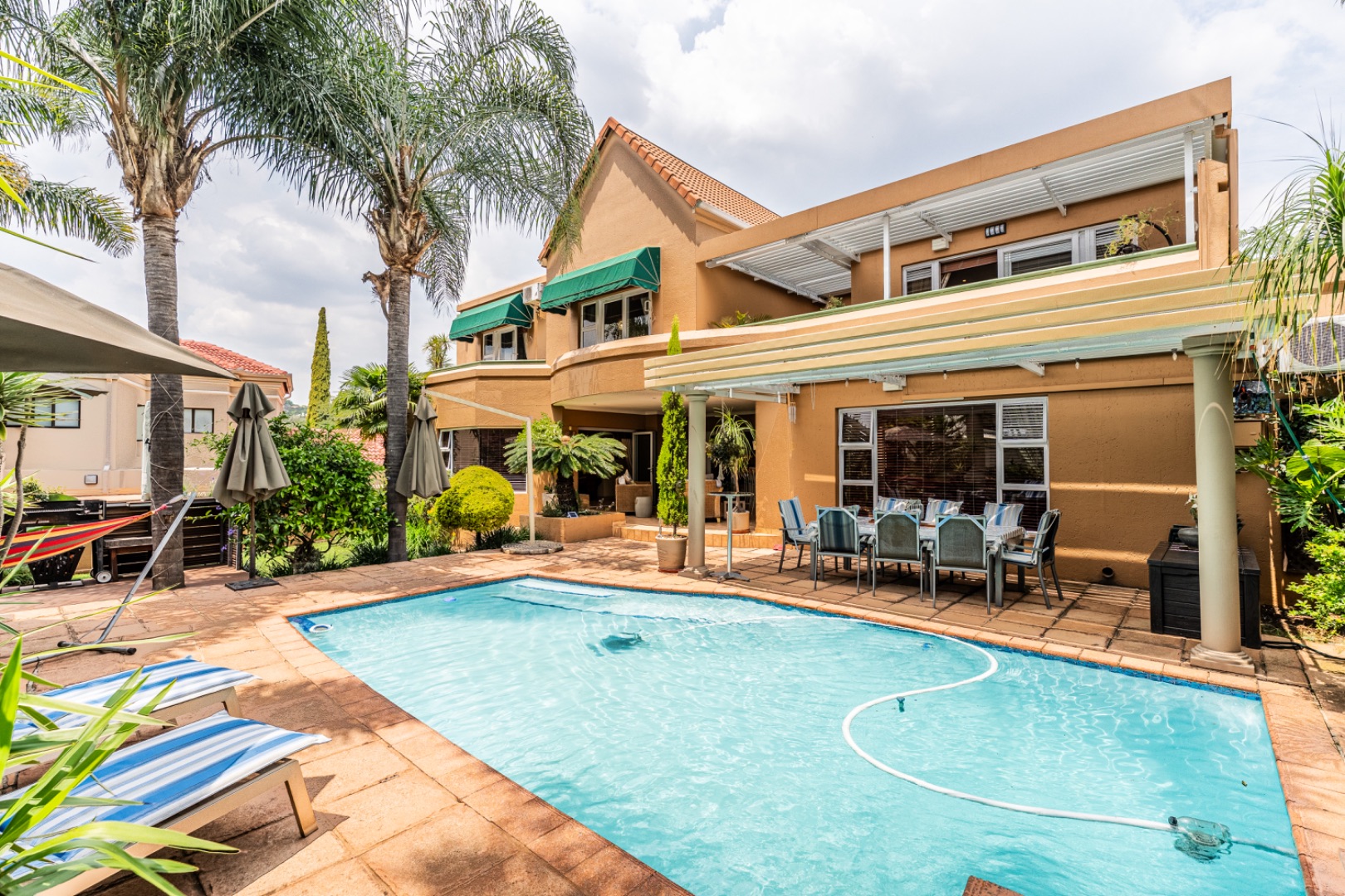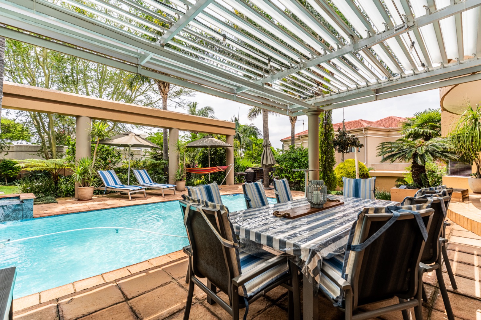 One of the home’s standout features is its expansive entertainment area—a beautifully covered patio that invites both relaxation and celebration. A built-in braai and charming bar make it the ideal space for entertaining guests or enjoying quiet evenings with loved ones. The patio overlooks a stunning garden and sparkling swimming pool, providing serene views and a tranquil setting for every occasion.