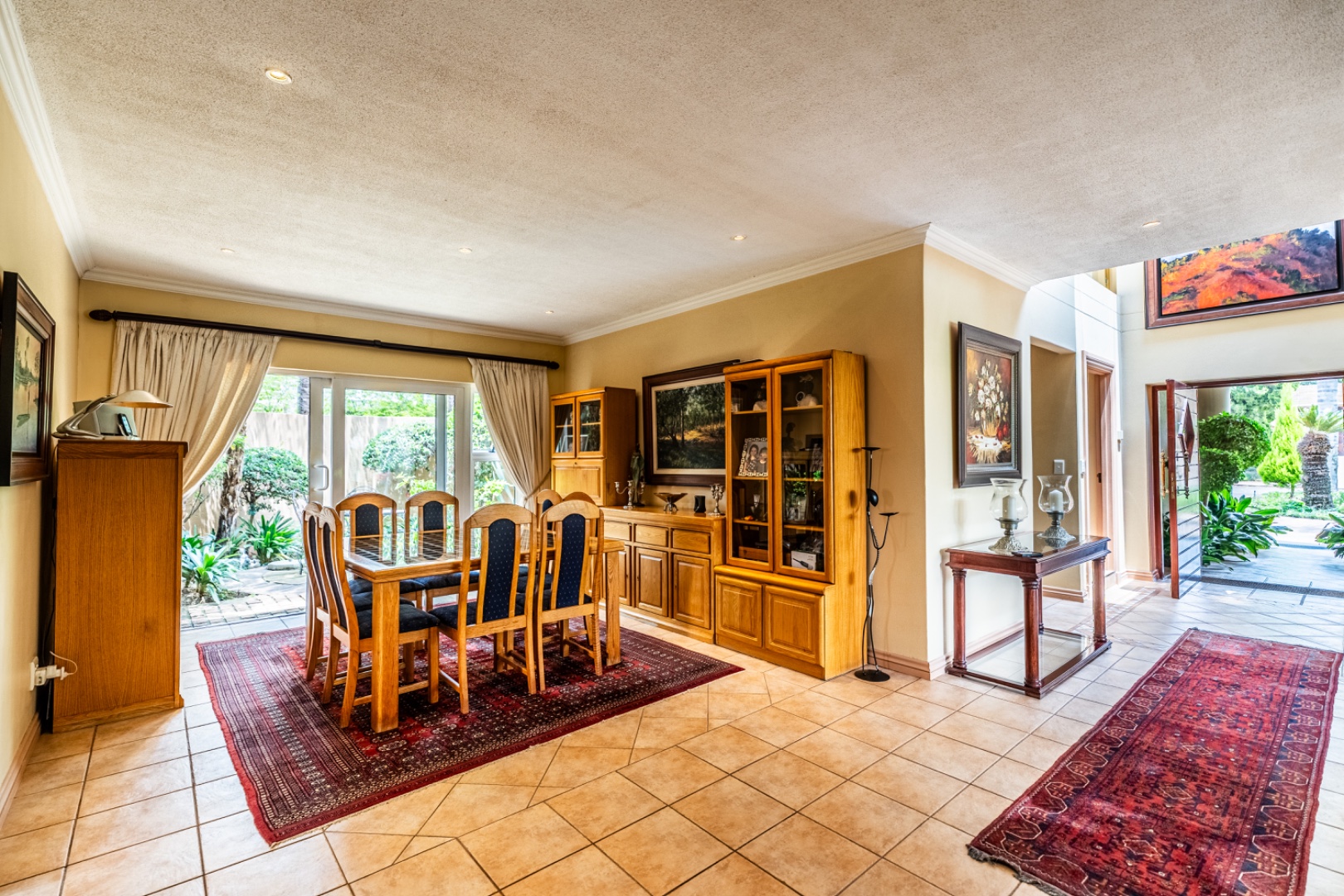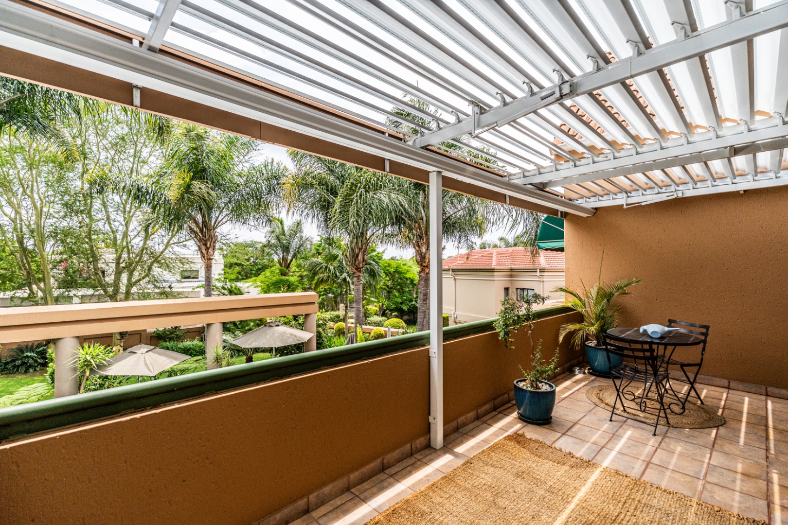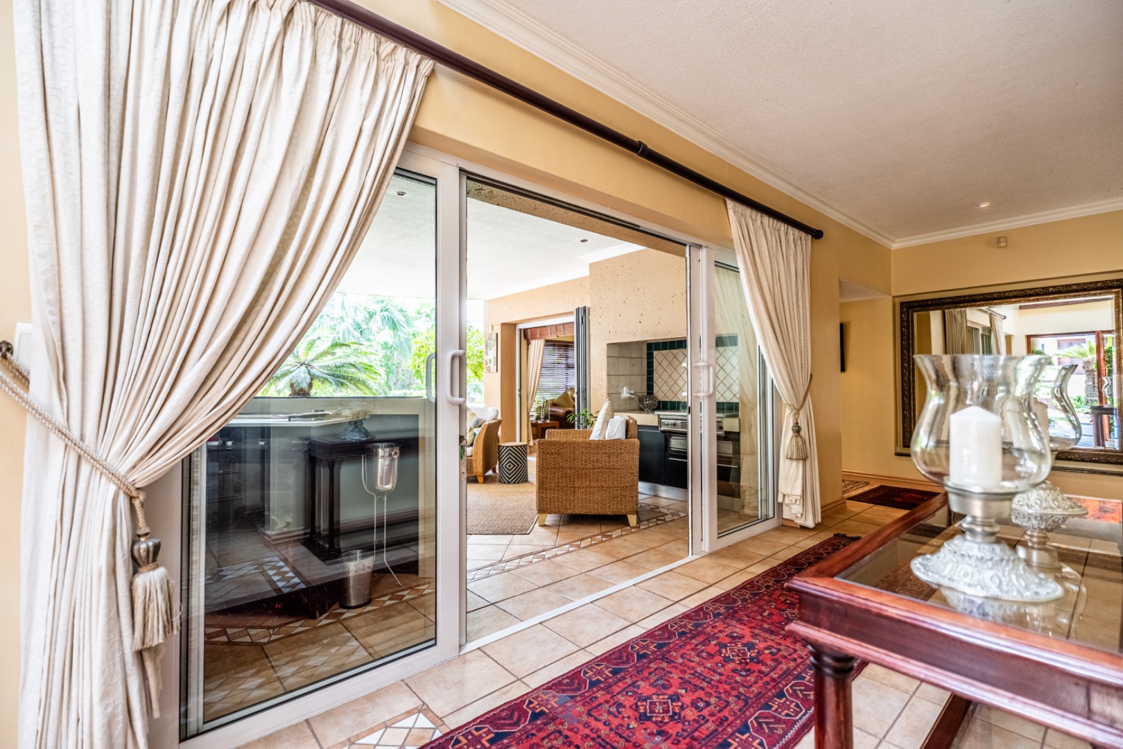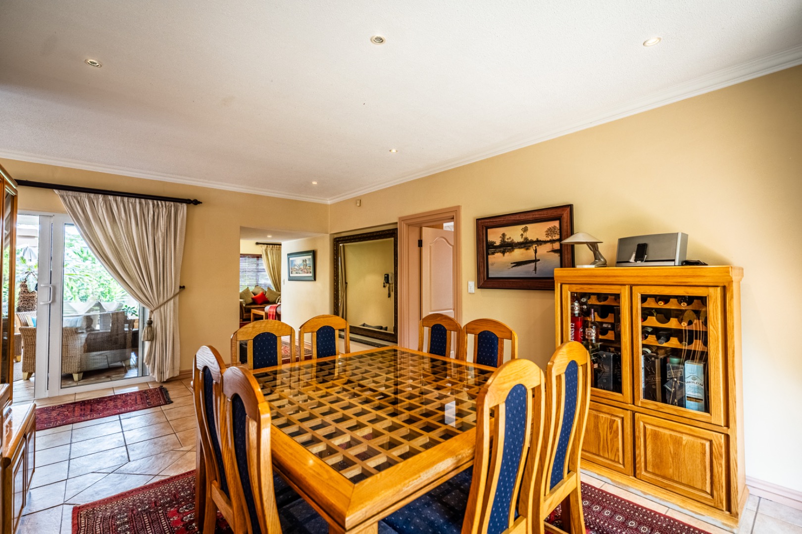 One of the home’s standout features is its expansive entertainment area—a beautifully covered patio that invites both relaxation and celebration. A built-in braai and charming bar make it the ideal space for entertaining guests or enjoying quiet evenings with loved ones. The patio overlooks a stunning garden and sparkling swimming pool, providing serene views and a tranquil setting for every occasion.