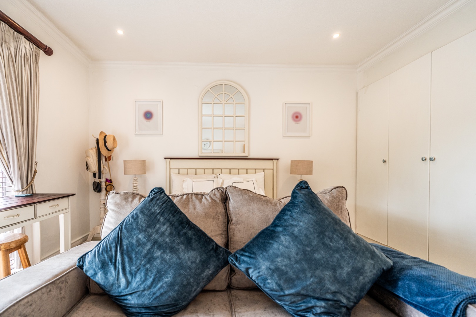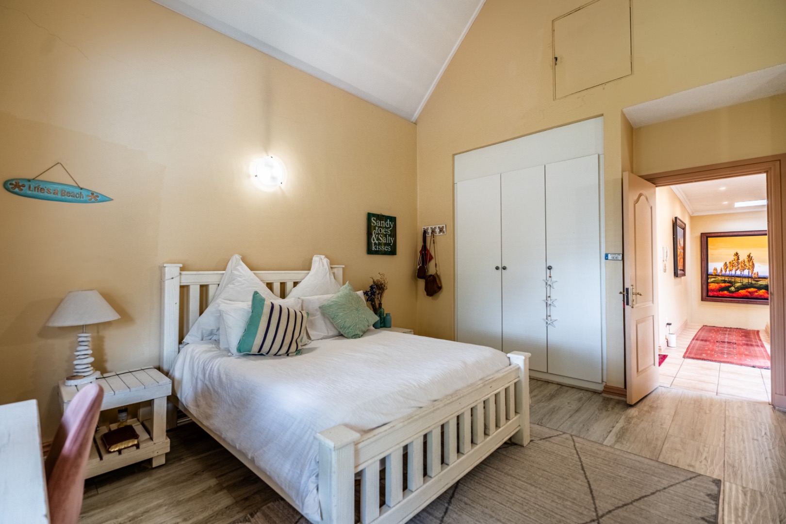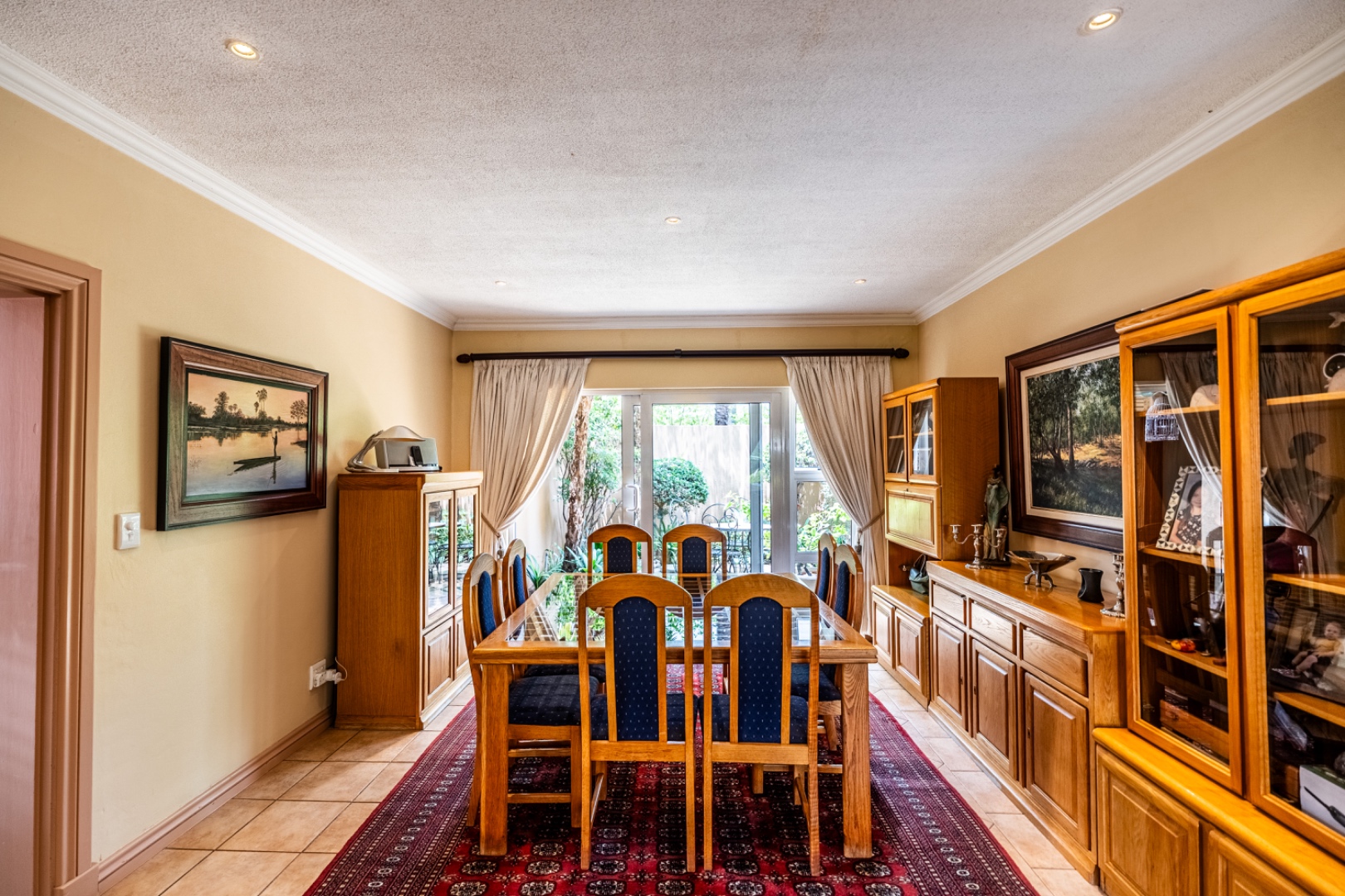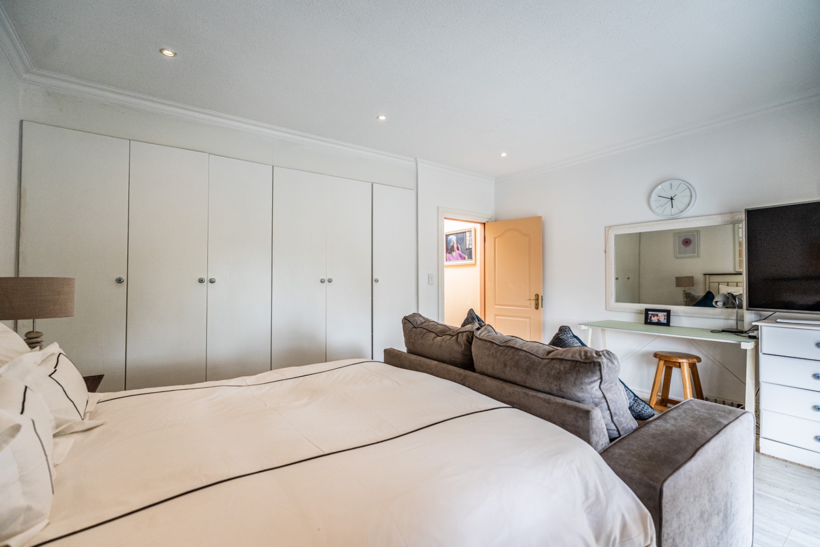 One of the home’s standout features is its expansive entertainment area—a beautifully covered patio that invites both relaxation and celebration. A built-in braai and charming bar make it the ideal space for entertaining guests or enjoying quiet evenings with loved ones. The patio overlooks a stunning garden and sparkling swimming pool, providing serene views and a tranquil setting for every occasion.