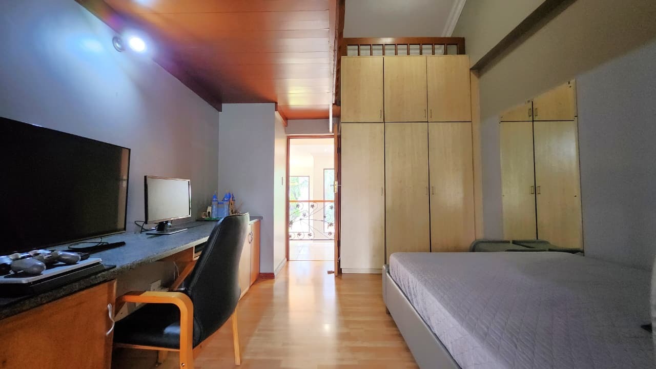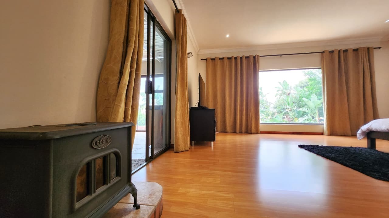 Upstairs, all four bedrooms are finished with laminated flooring and filled with beautiful natural light. Each bedroom opens onto a shared covered balcony, enhancing the elevated and tranquil ambience of the home. The main suite serves as a luxurious private retreat, complete with a walk-in closet, en-suite bathroom, and its own fireplace — the perfect setting for quiet comfort and sophistication.