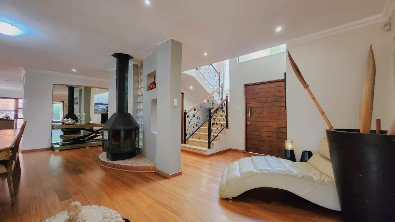 The ground floor welcomes you with an elegant open-plan layout where the living and dining areas flow effortlessly into an enclosed entertainment veranda featuring a built-in braai. A charming dining-room fireplace adds warmth and character, creating an inviting atmosphere for both relaxed evenings and refined entertaining.