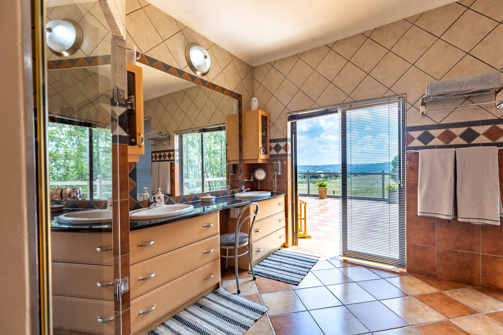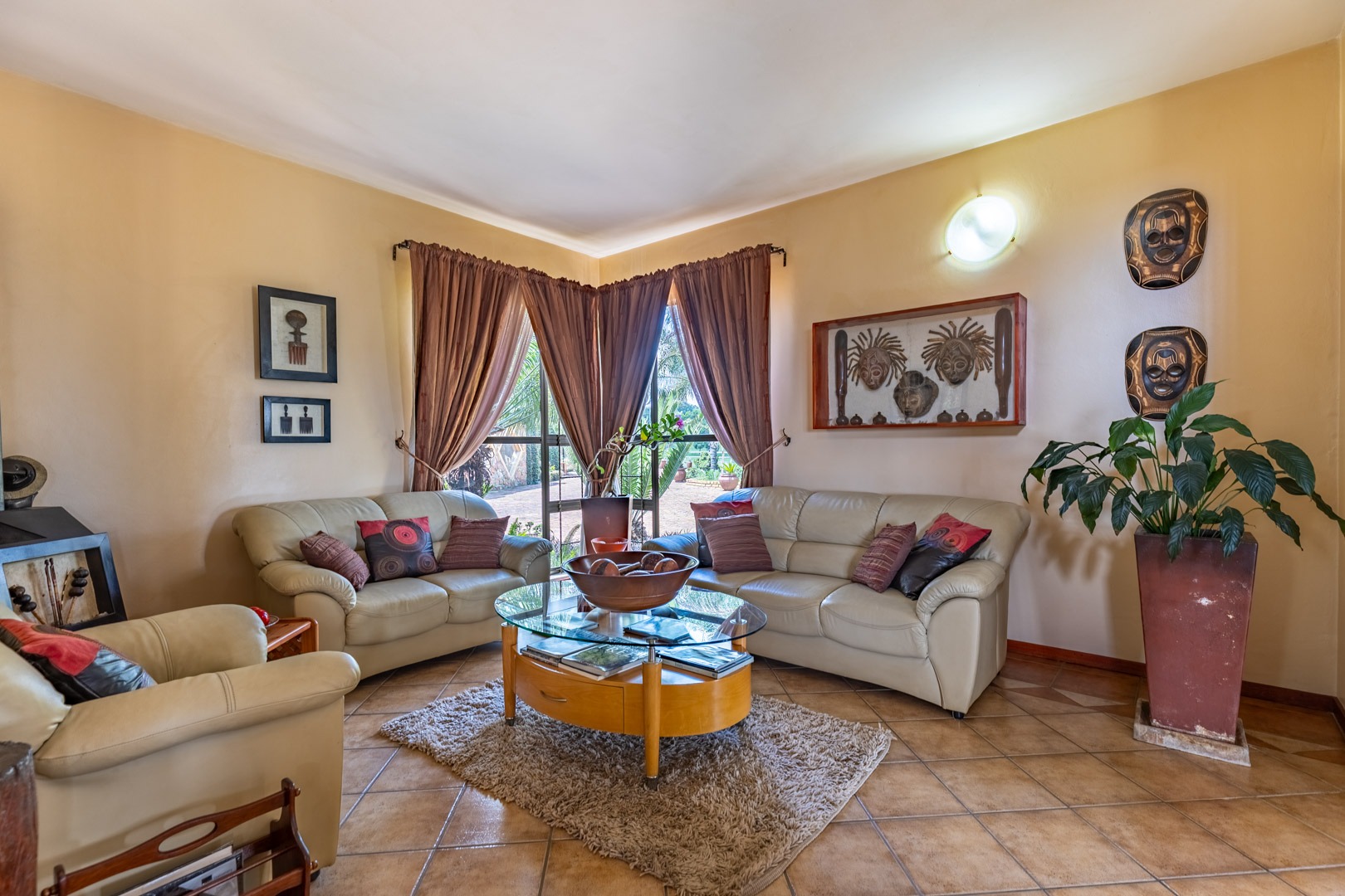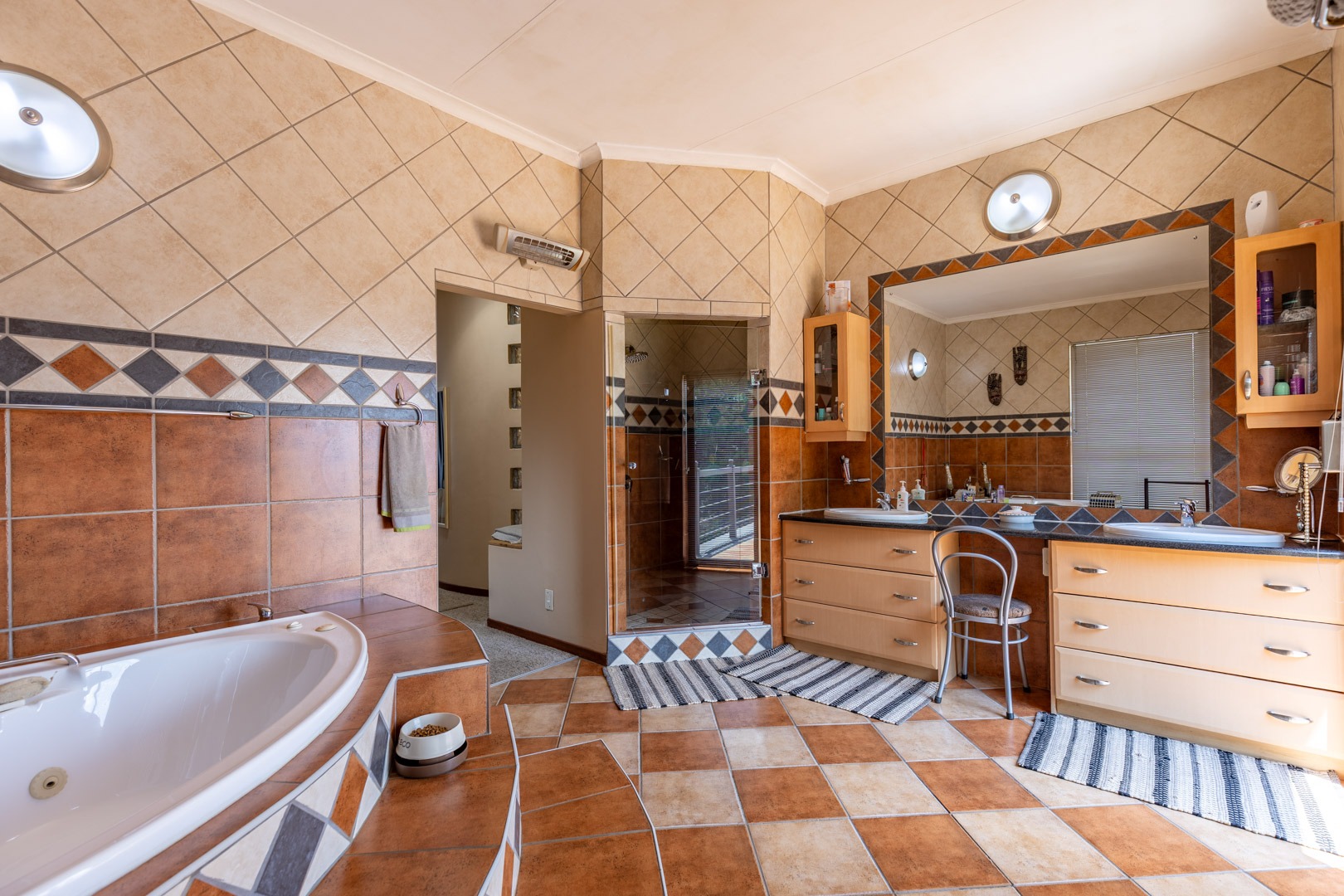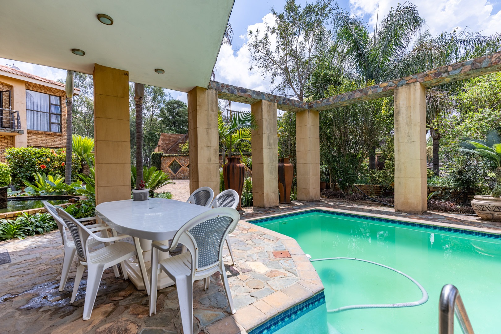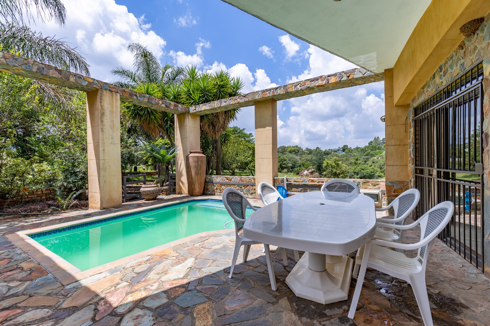 Discover an exceptional residential offering in Zwavelpoort AH, Pretoria, presenting a sprawling 4.55-hectare property with a substantial 670 sqm floor size. This impressive home features an inviting entrance hall leading to two spacious lounges and a dedicated dining room, all designed with an open-plan flow and enhanced by sliding doors. The well-appointed kitchen includes a scullery and pantry, catering to all culinary needs. The residence boasts five generously sized bedrooms, complemented by 5.5 bathrooms, including five luxurious ensuites and a convenient guest toilet. Comfort is assured throughout with air conditioning in key areas. Additional practical spaces include a study, staff quarters, a dedicated laundry room, and ample storage solutions, alongside a versatile flatlet. Outdoor living is a highlight, featuring a refreshing swimming pool, a welcoming patio, and a lapa perfect for entertaining. Enjoy picturesque scenic views from various vantage points. The property is equipped with a built-in braai, a charming garden, and a Wendy house. Parking is abundant with four garages and four additional parking spaces, all accessible via a paved driveway. Security is paramount within this gated community, featuring an access gate, electric fencing, CCTV surveillance, an intercom system, burglar bars, and a security gate. The property also embraces sustainability with solar panels, a borehole, and an irrigation system, ensuring efficient resource management. This eco-estate, functioning as a game/stock farm with a nature reserve lifestyle, offers a unique blend of rural tranquility and modern convenience. Key Features: * 5 Bedrooms, 5.5 Bathrooms (5 Ensuites) * 4.55 Hectare Erf, 670 sqm Floor Size * 2 Lounges, Dining Room, Study * Swimming Pool, Patio, Lapa, Built-in Braai * 4 Garages, 4 Parking Spaces * Gated Community with Electric Fencing & CCTV * Solar Panels, Borehole, Irrigation System * Staff Quarters, Laundry, Storage
