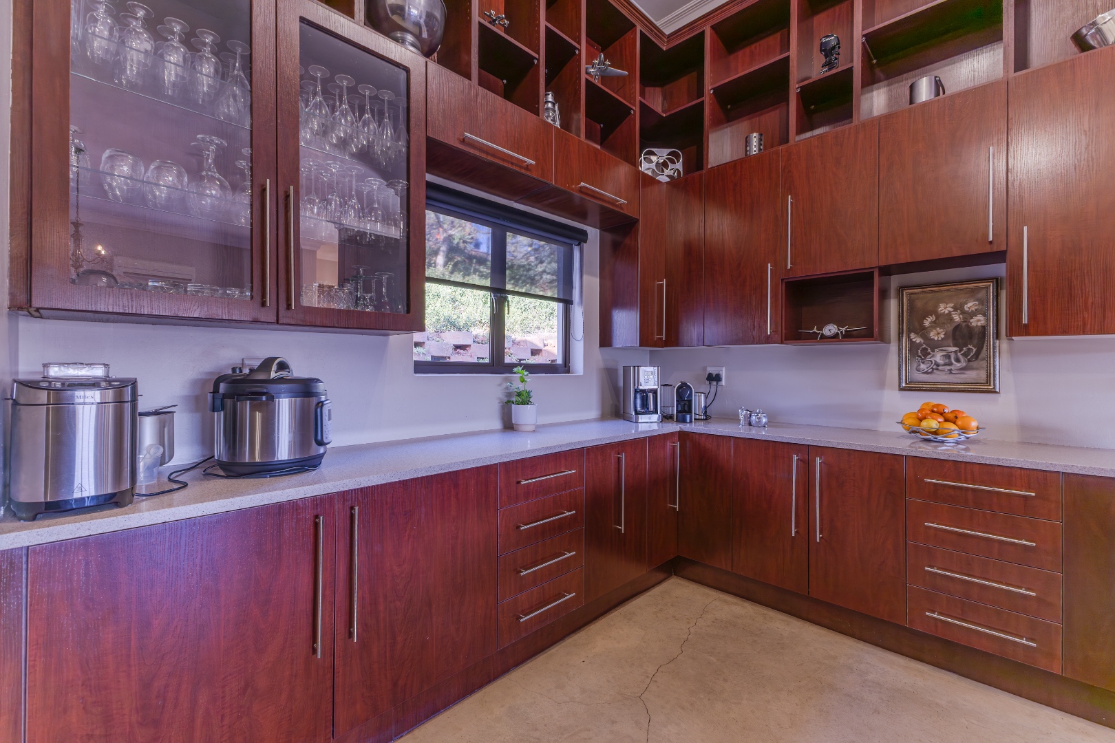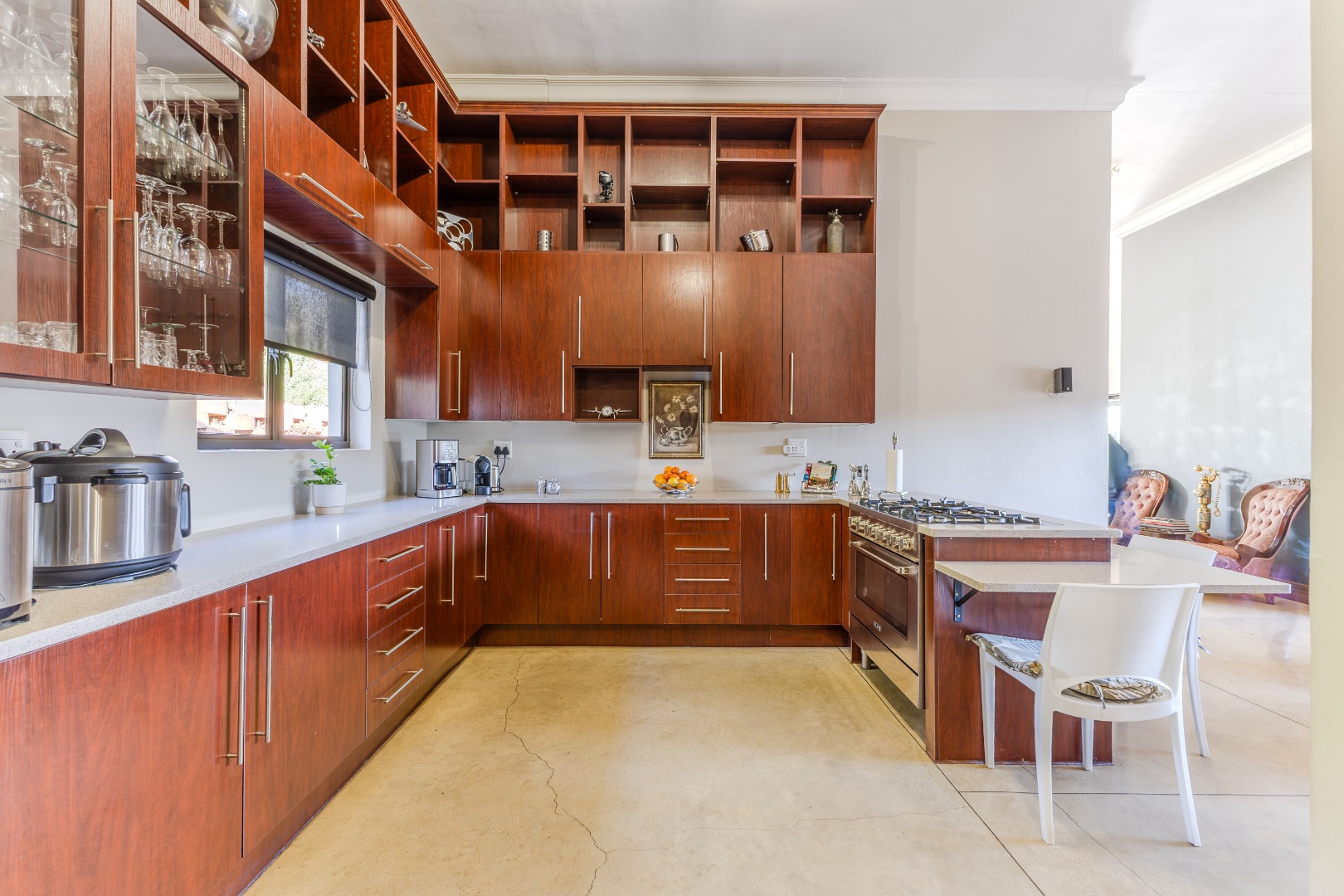 Gourmet kitchen with blue-pearl granite counters, solid beach-wood cabinetry, gas stove, induction hob, thermo-fan electric oven, and walk-in pantry.