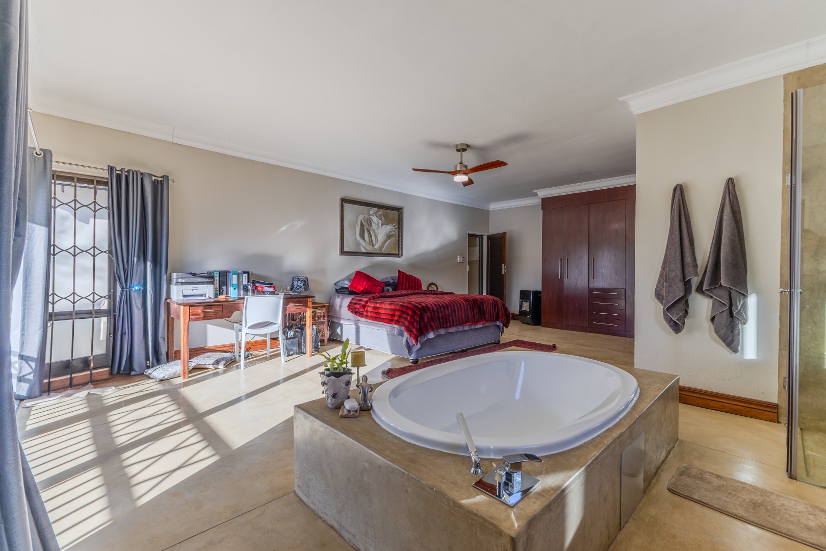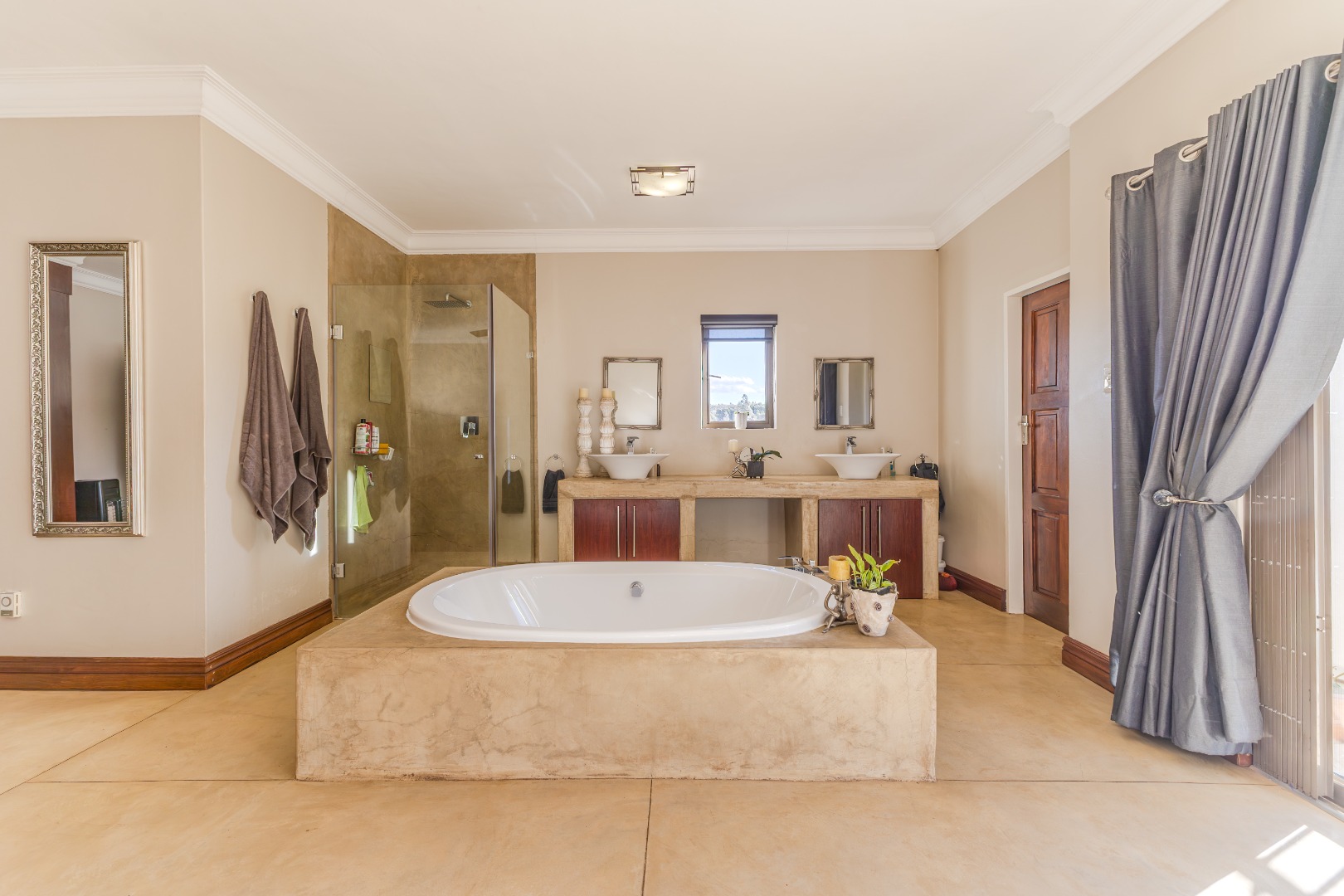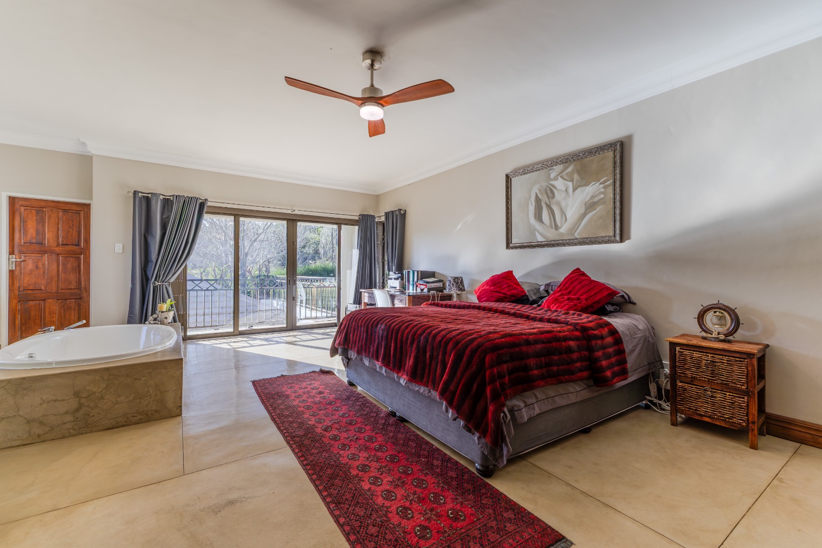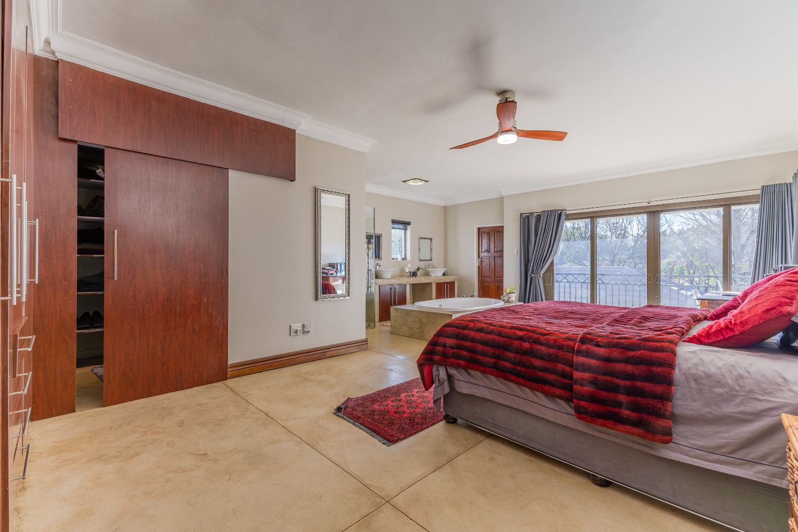 Main suite: balcony access, dressing room, spa bath, and shower