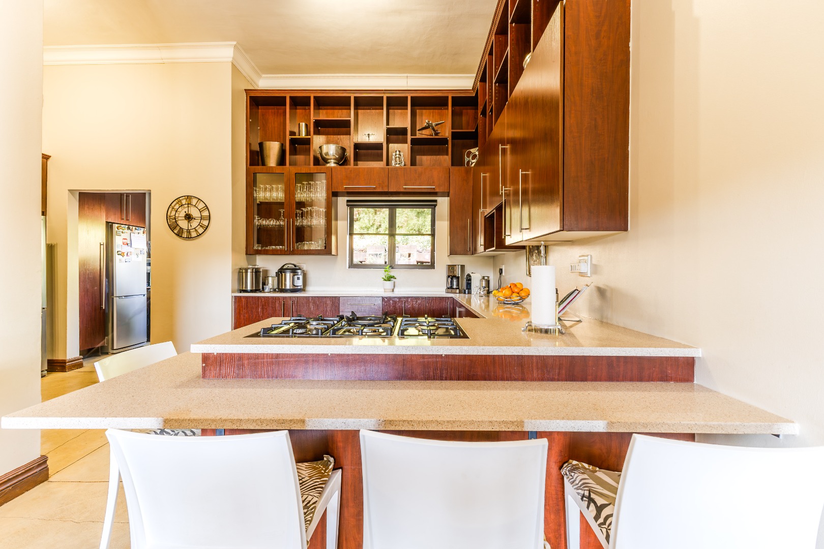 Built-in wooden bar area with a natural flow out onto the patio swimming pool area