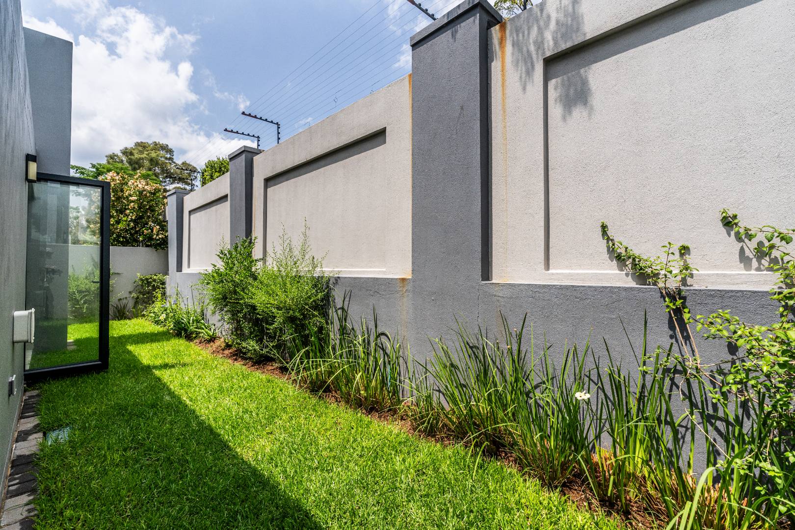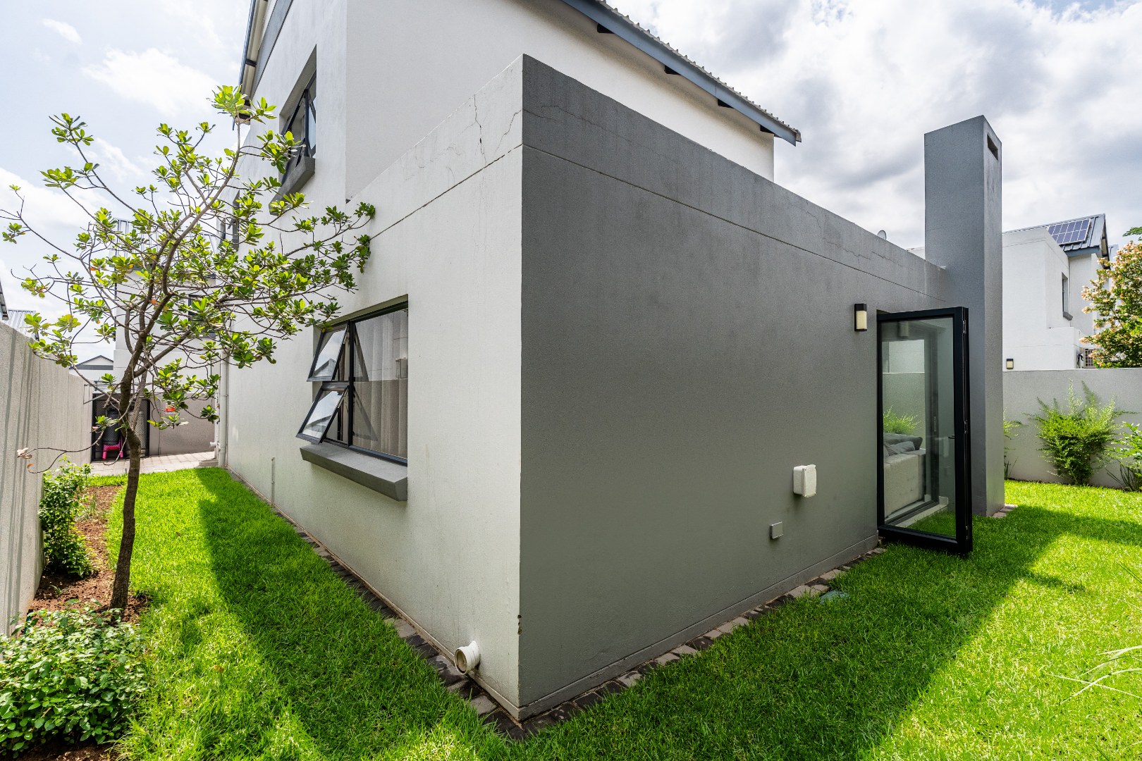 Extending from the living area, the enclosed patio with built-in braai offers versatility as a second lounge, recreation room, or entertainment space. Expansive glass stacking doors open out to the wrap-around garden, creating a light-filled flow between the indoors and outdoors.