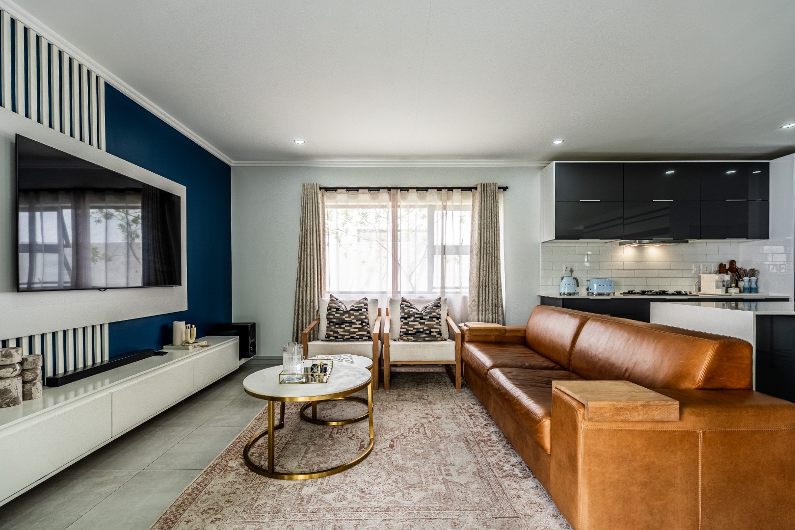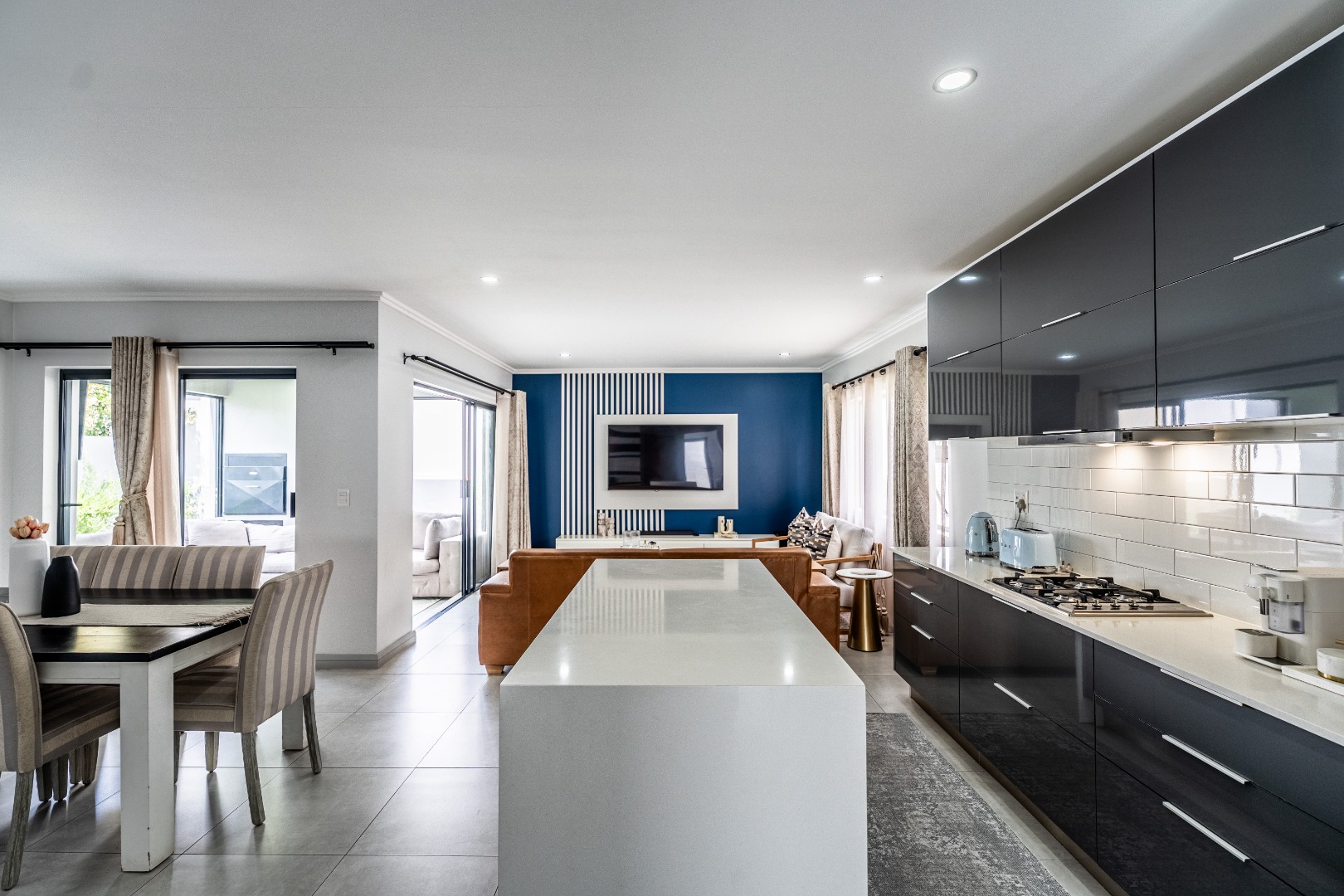 As you step inside, you are greeted by a spacious open-plan living area encompassing a welcoming lounge, dining space, and a stunning designer kitchen. The kitchen features high-gloss cabinetry, ample storage, and a centre island with breakfast bar — perfect for family gatherings or entertaining. Quality appliances include a gas hob with extractor fan, eye-level oven, and integrated microwave, while the separate scullery provides space for three under-counter appliances.