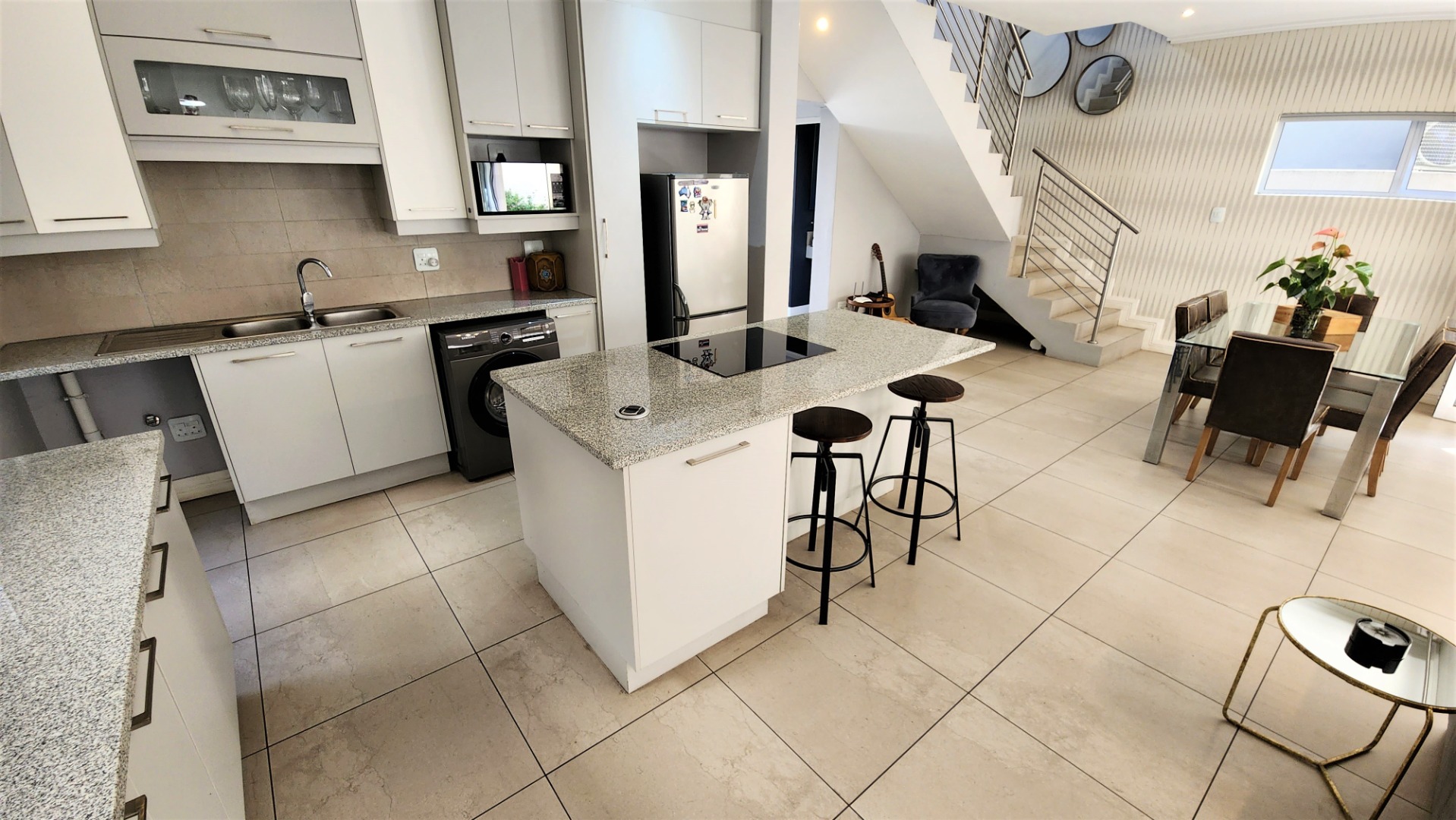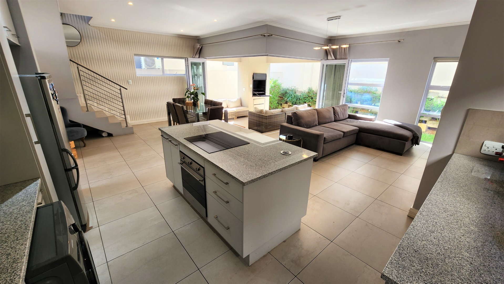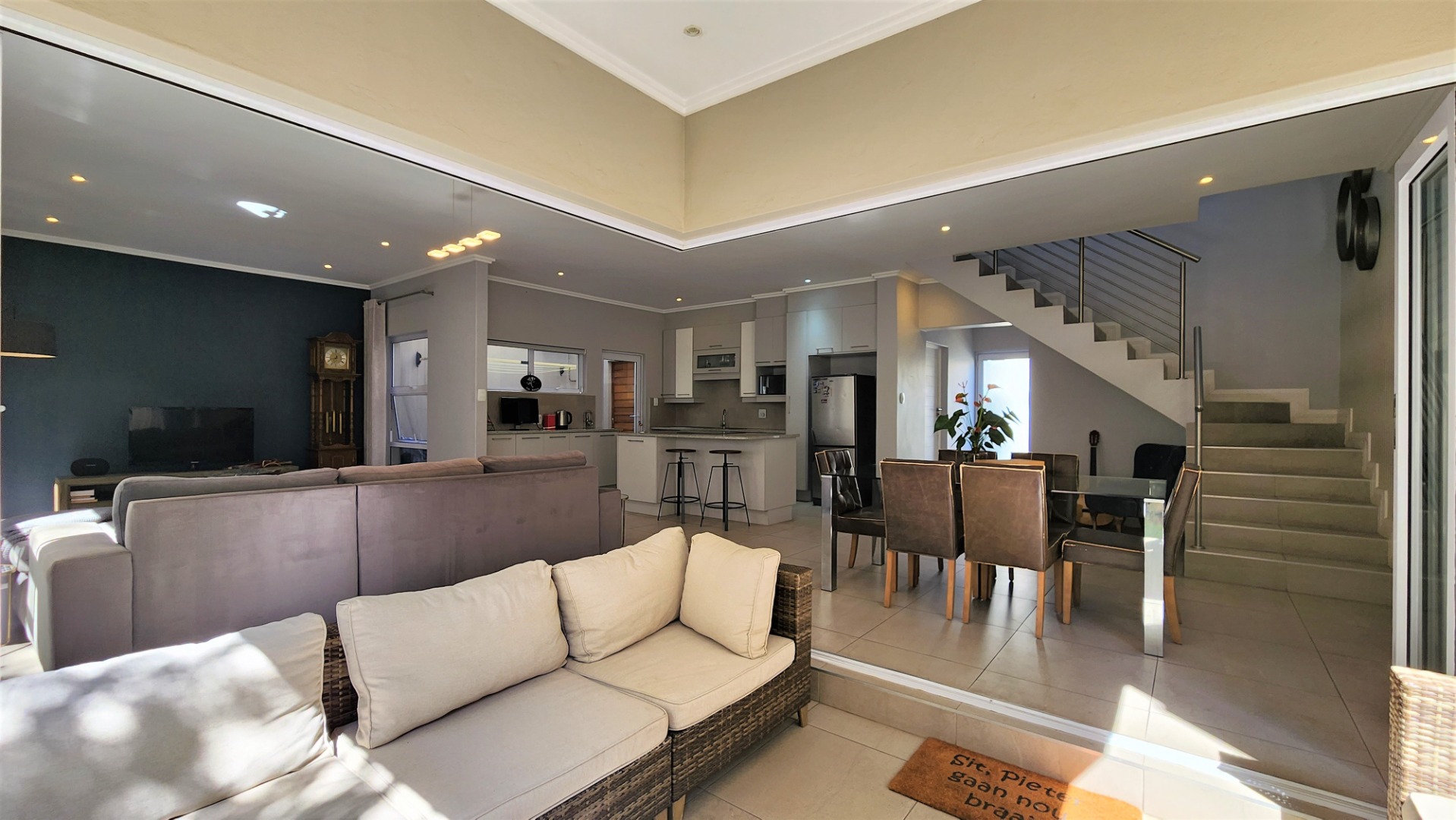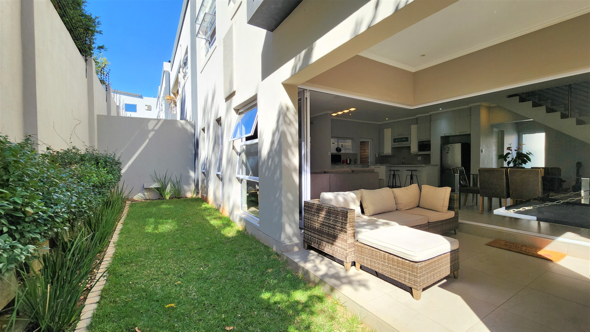 This modern double-storey home in the east of Bryanston offers luxurious living in a prime location near Riverside Junction. The open-plan layout of the ground floor creates a spacious atmosphere, with a lounge, dining area, and kitchen featuring a centre island and breakfast bar. The kitchen also offers space for two under-counter appliances and a double fridge, and leads out to a private kitchen-courtyard. Glass stacking doors open from the living areas to a covered patio with a built-in braai, perfect for indoor-outdoor entertaining. The patio leads to a private garden. The ground floor includes a guest toilet for convenience.