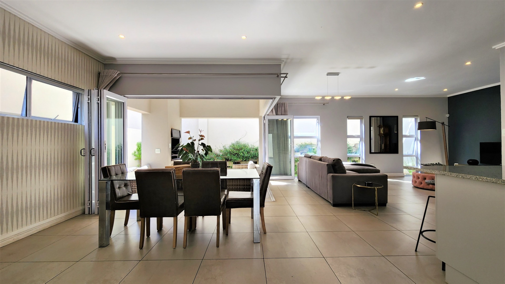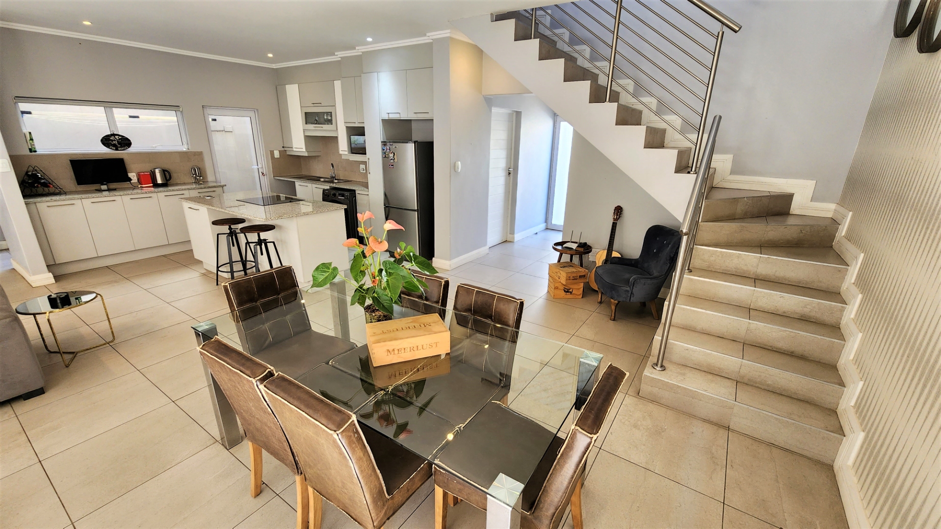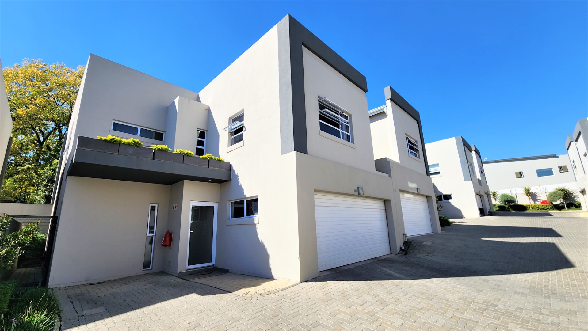 This modern double-storey home in the east of Bryanston offers luxurious living in a prime location near Riverside Junction. The open-plan layout of the ground floor creates a spacious atmosphere, with a lounge, dining area, and kitchen featuring a centre island and breakfast bar. The kitchen also offers space for two under-counter appliances and a double fridge, and leads out to a private kitchen-courtyard. Glass stacking doors open from the living areas to a covered patio with a built-in braai, perfect for indoor-outdoor entertaining. The patio leads to a private garden. The ground floor includes a guest toilet for convenience.