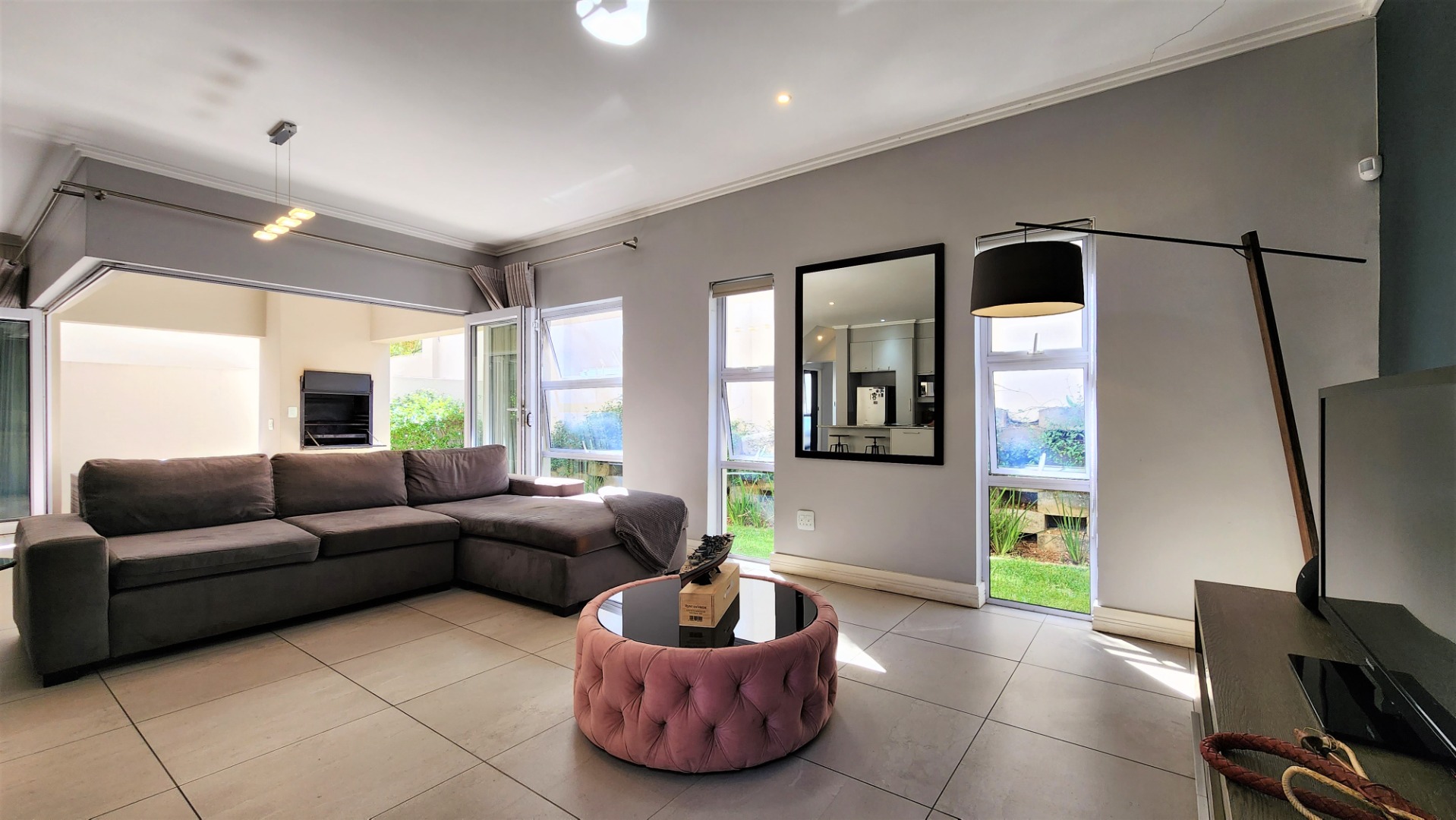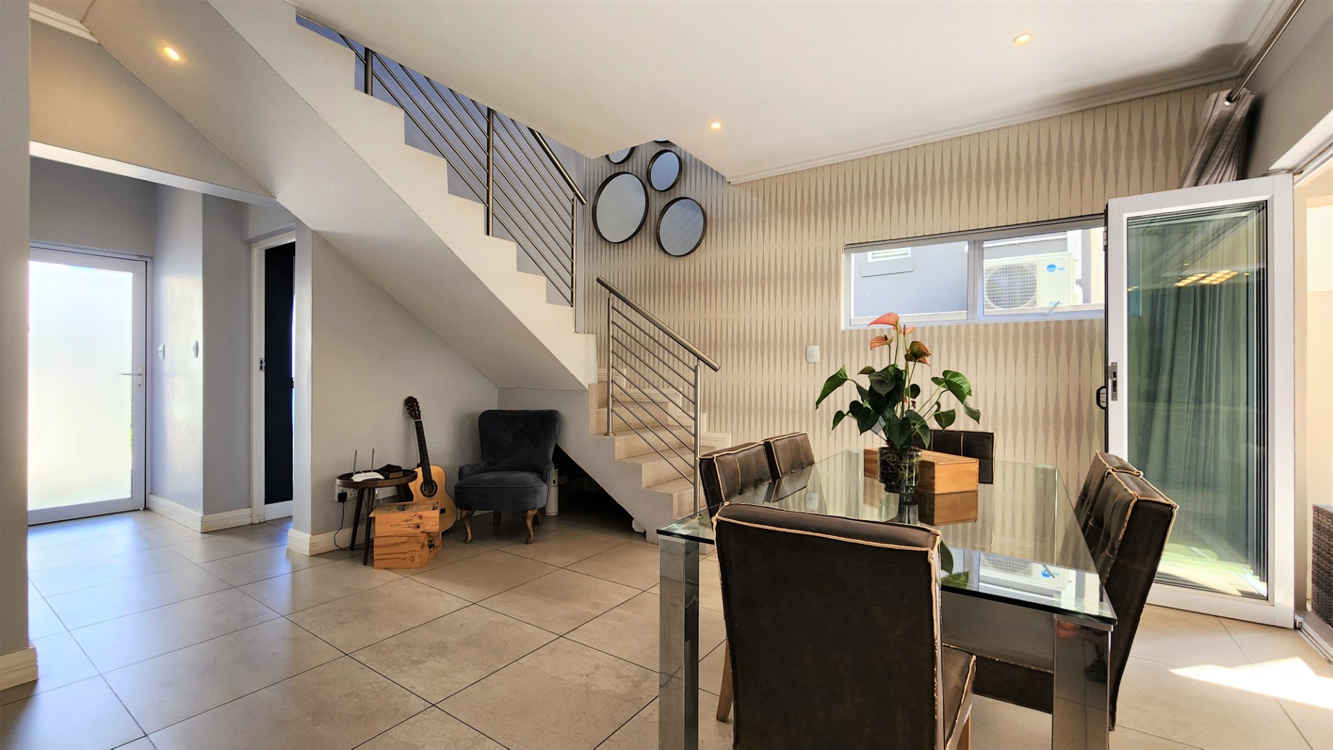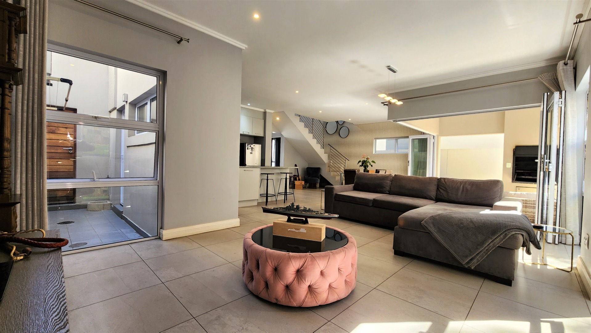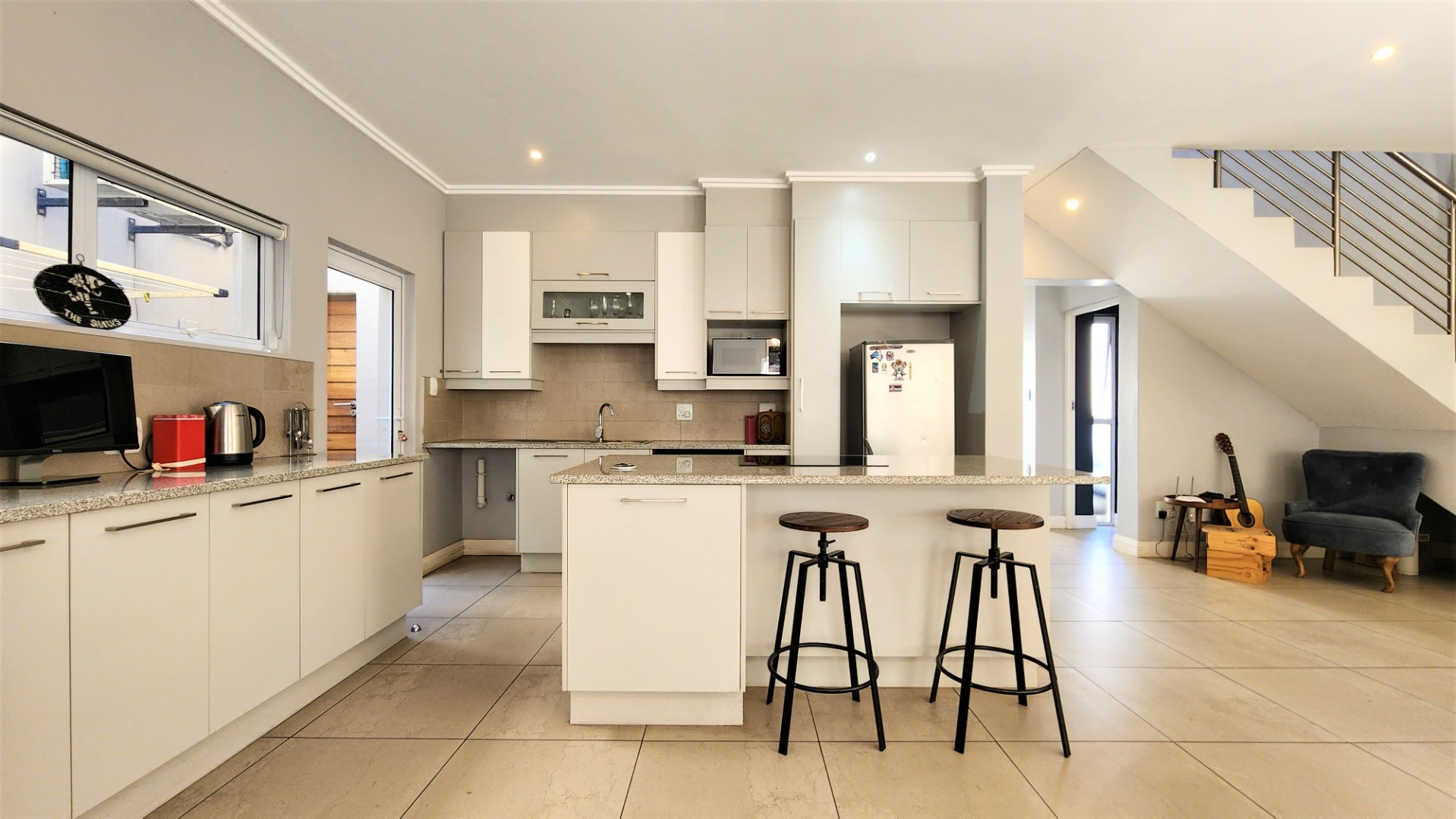 This modern double-storey home in the east of Bryanston offers luxurious living in a prime location near Riverside Junction. The open-plan layout of the ground floor creates a spacious atmosphere, with a lounge, dining area, and kitchen featuring a centre island and breakfast bar. The kitchen also offers space for two under-counter appliances and a double fridge, and leads out to a private kitchen-courtyard. Glass stacking doors open from the living areas to a covered patio with a built-in braai, perfect for indoor-outdoor entertaining. The patio leads to a private garden. The ground floor includes a guest toilet for convenience.
