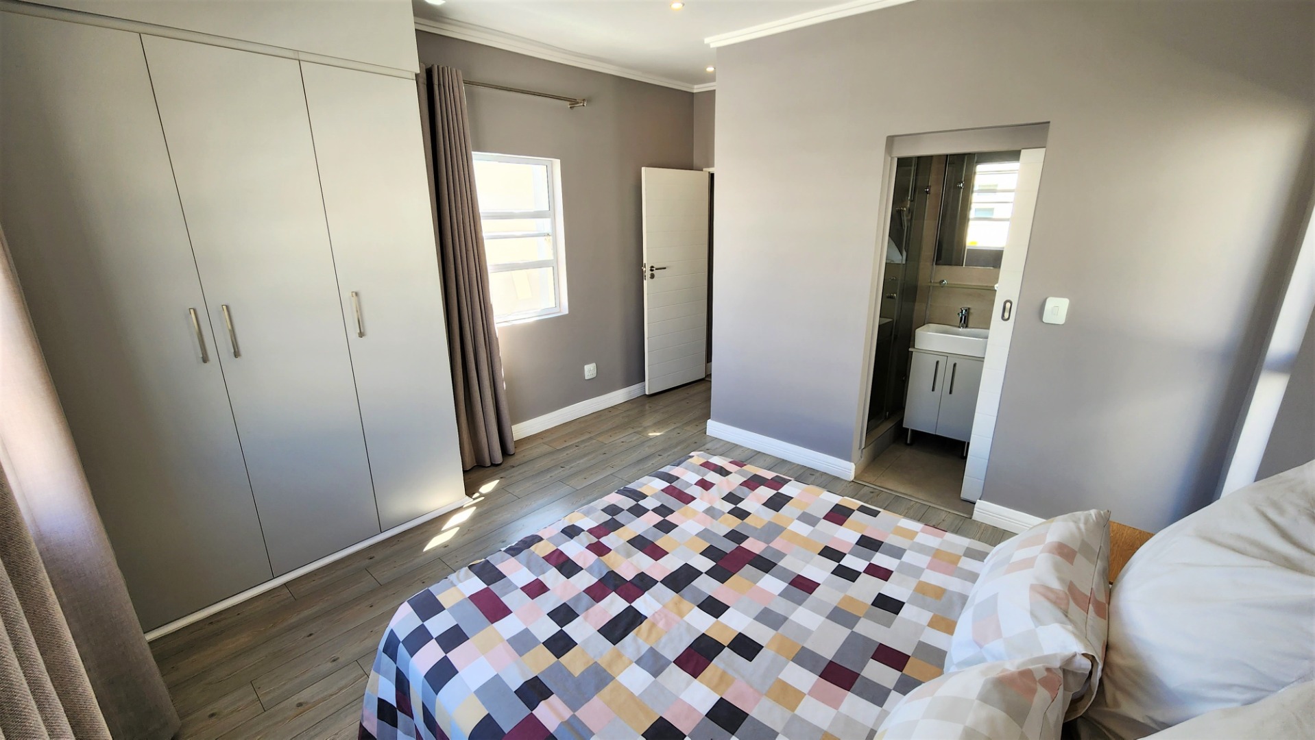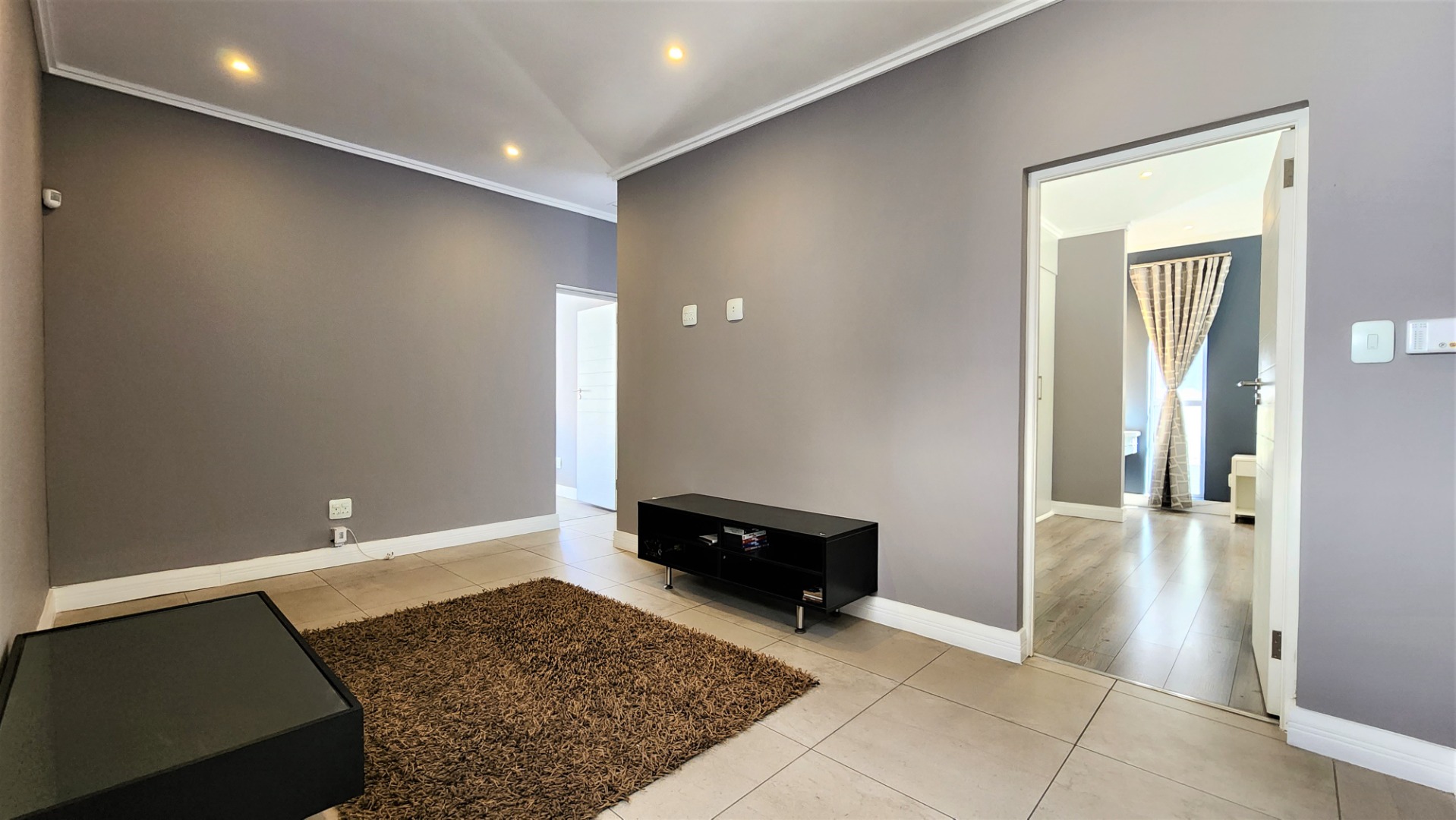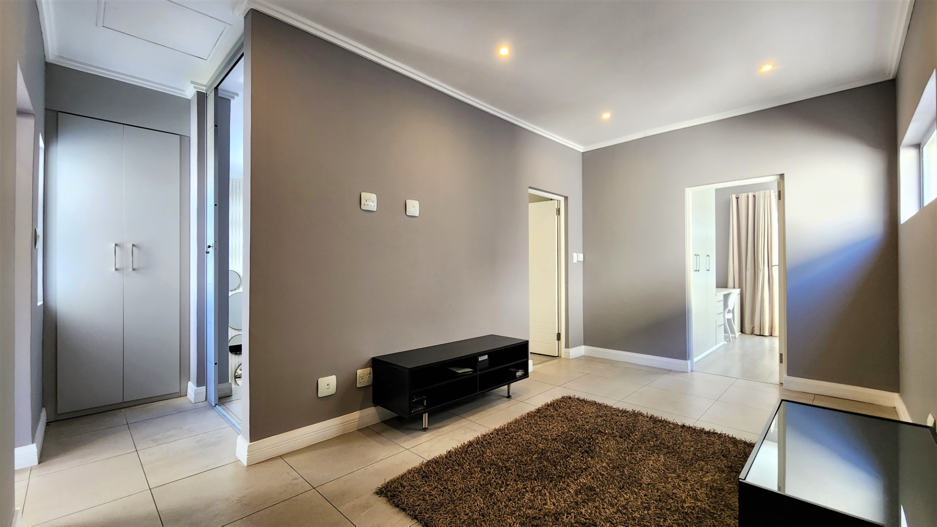 Upstairs, a pyjama lounge / TV lounge provides additional relaxation space. Three sizable bedrooms, all with ensuite bathrooms, offer comfort and privacy. The main bedroom includes ample cupboard space, a dressing area and dressing table, a balcony, and a spacious full ensuite bathroom.