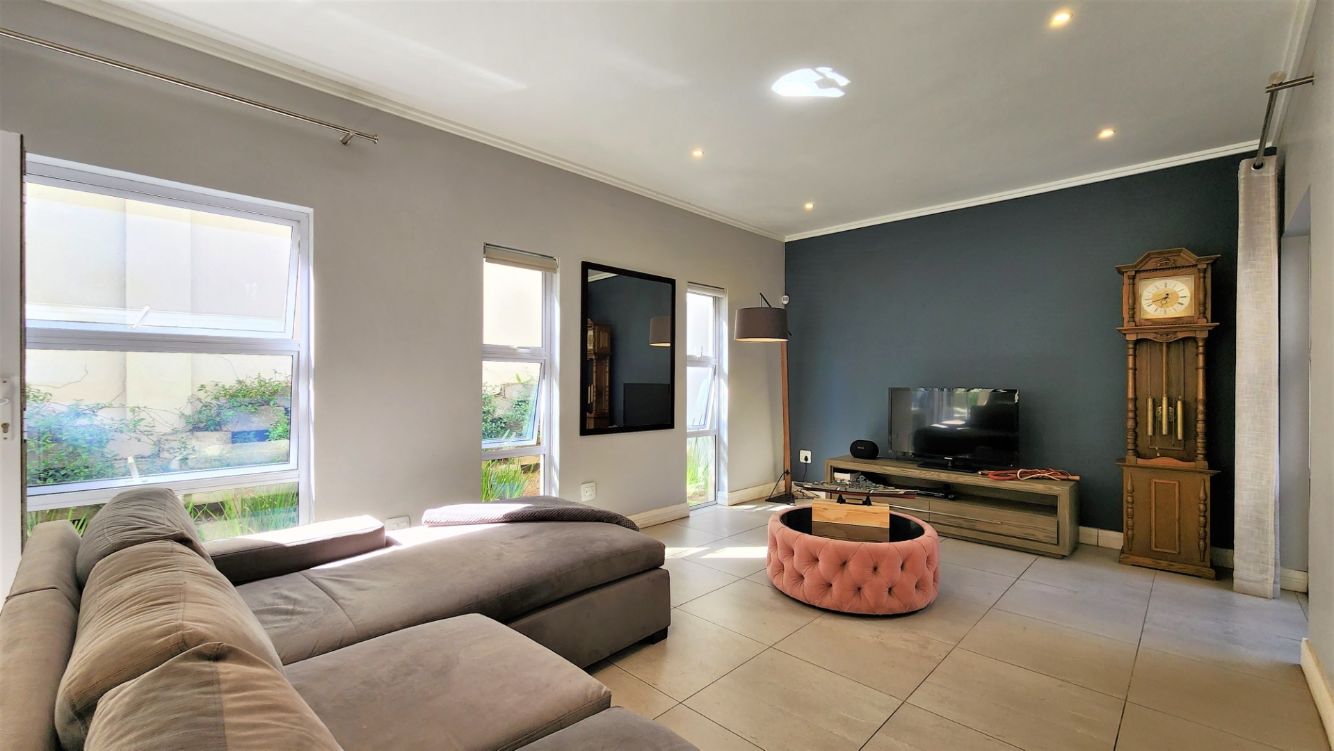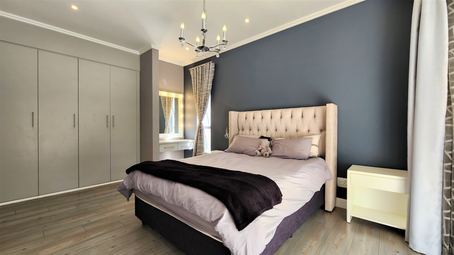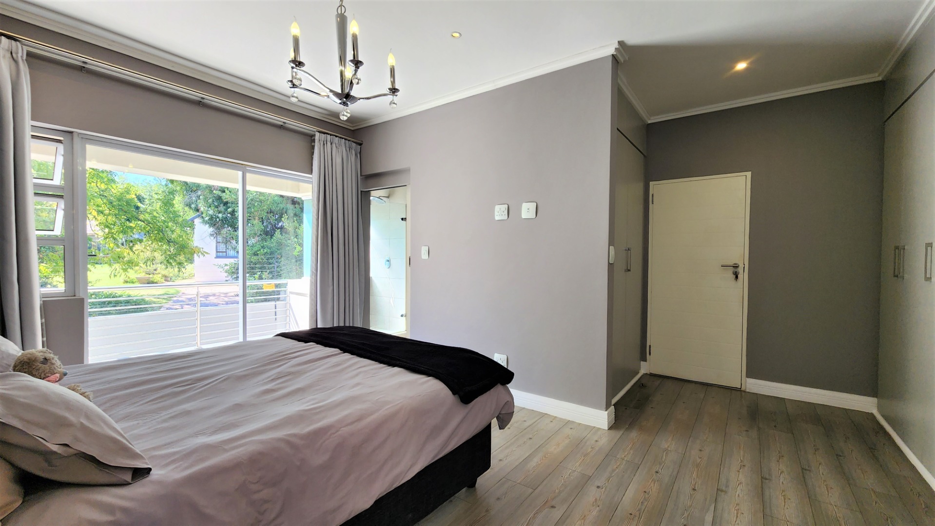 Upstairs, a pyjama lounge / TV lounge provides additional relaxation space. Three sizable bedrooms, all with ensuite bathrooms, offer comfort and privacy. The main bedroom includes ample cupboard space, a dressing area and dressing table, a balcony, and a spacious full ensuite bathroom.