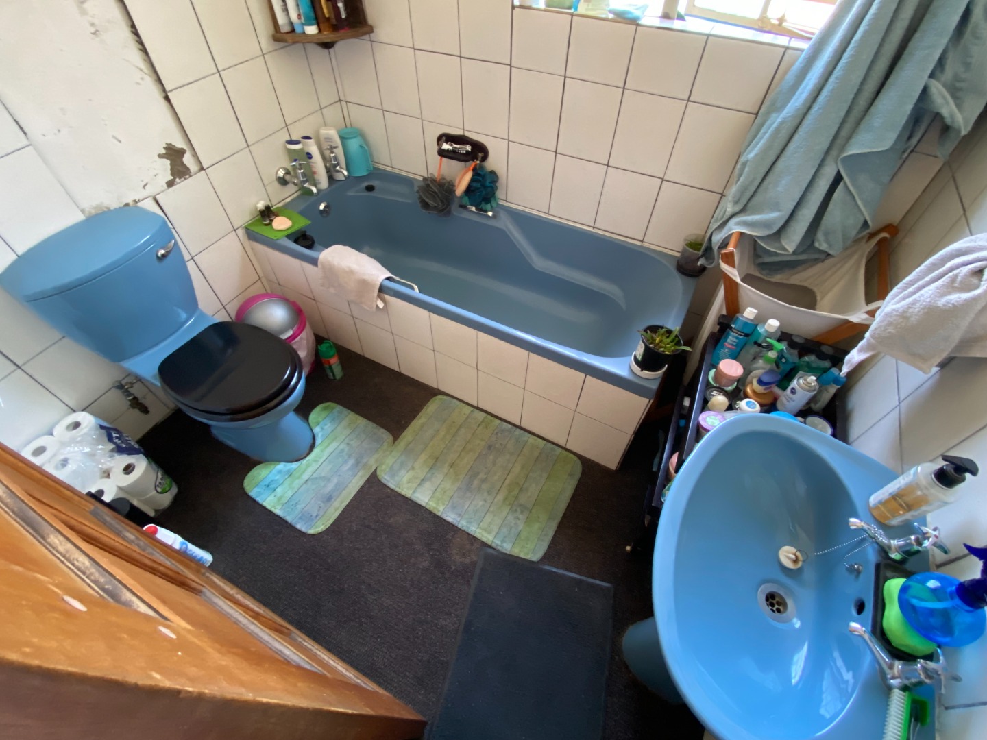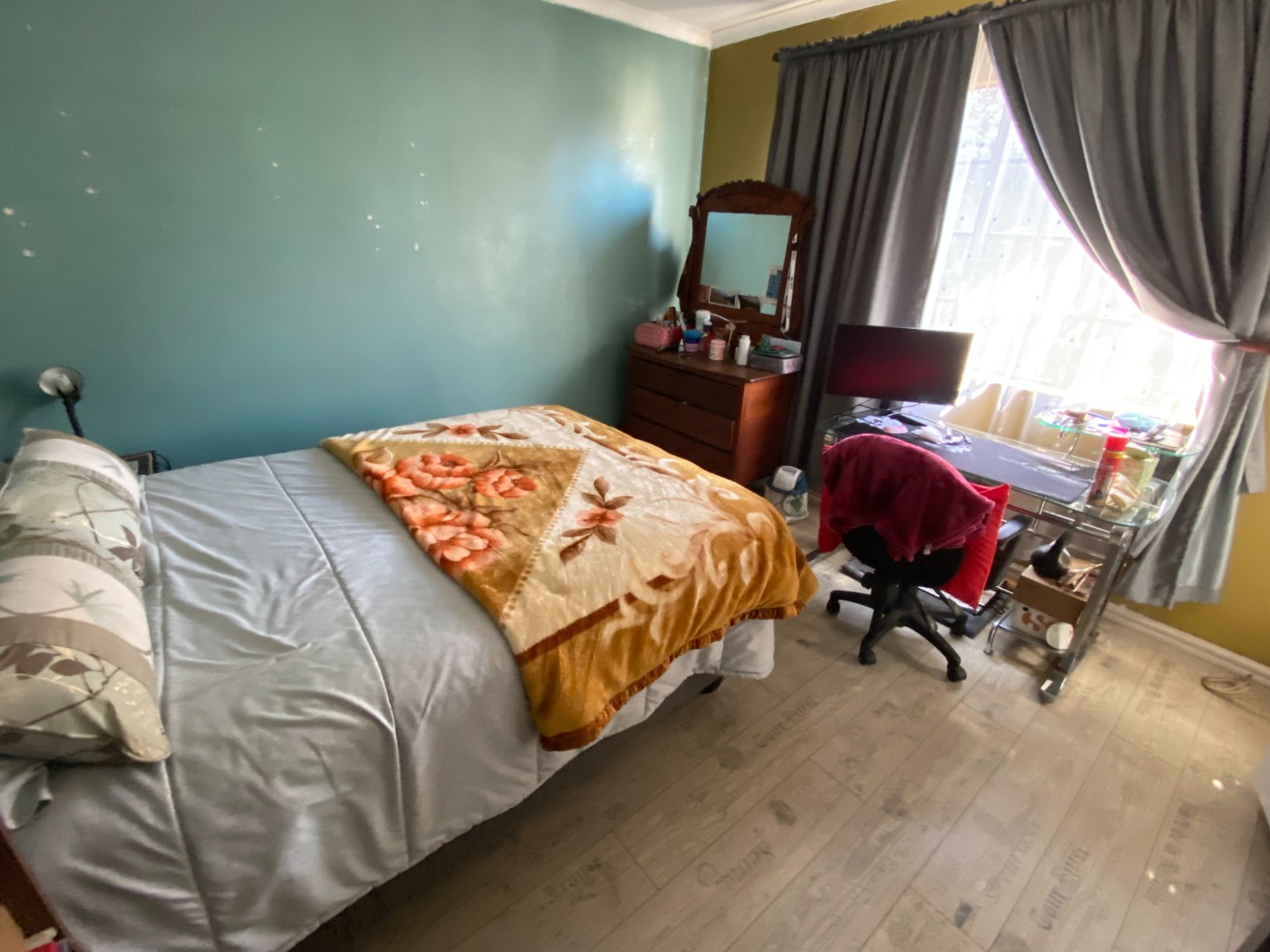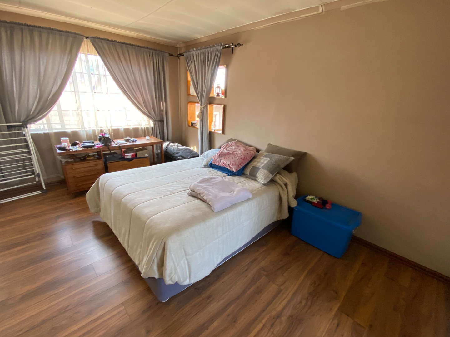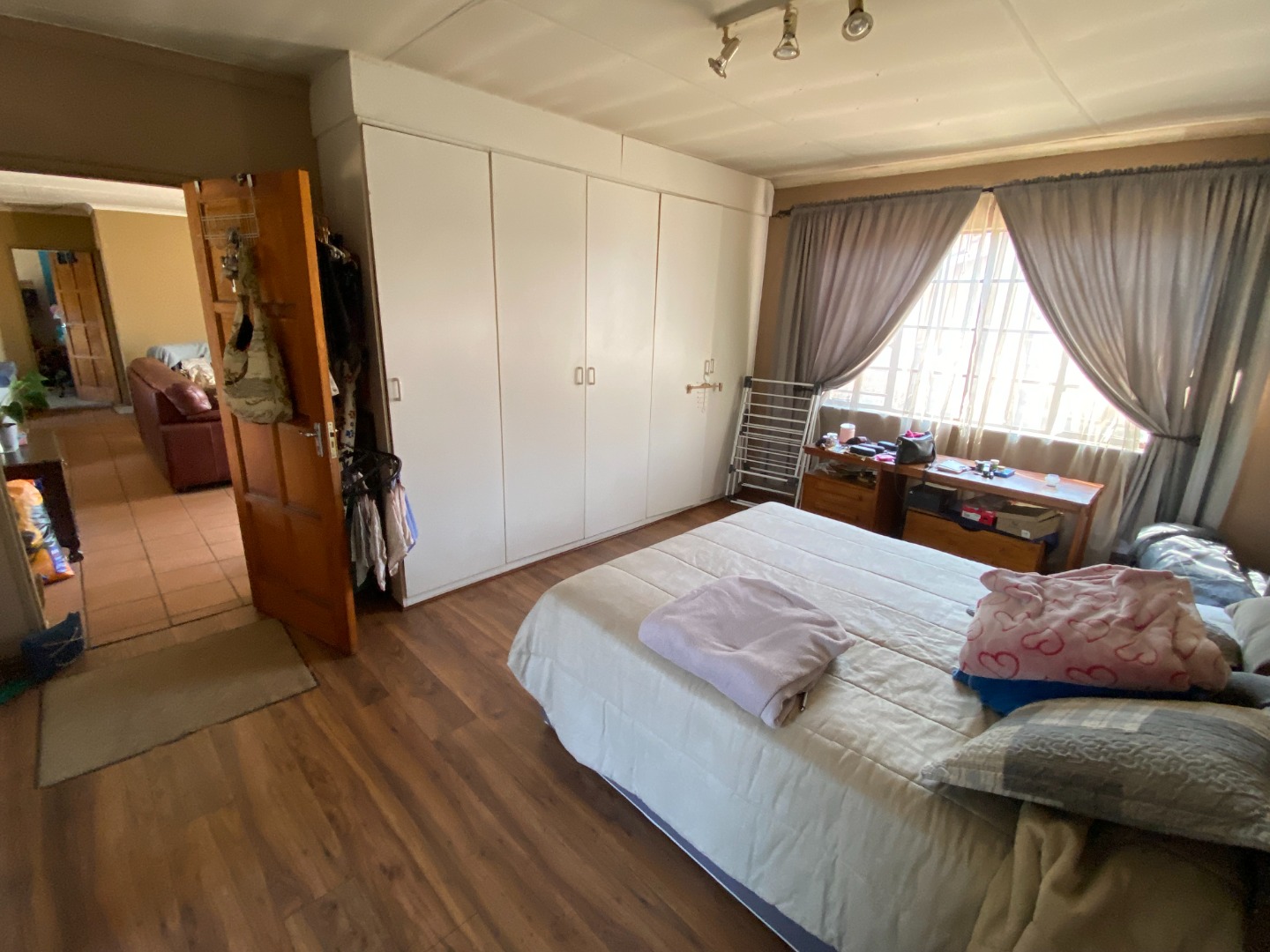 The bedroom floors are laminated wood, the bathrooms have carpets, and the rest of the house is tiled.