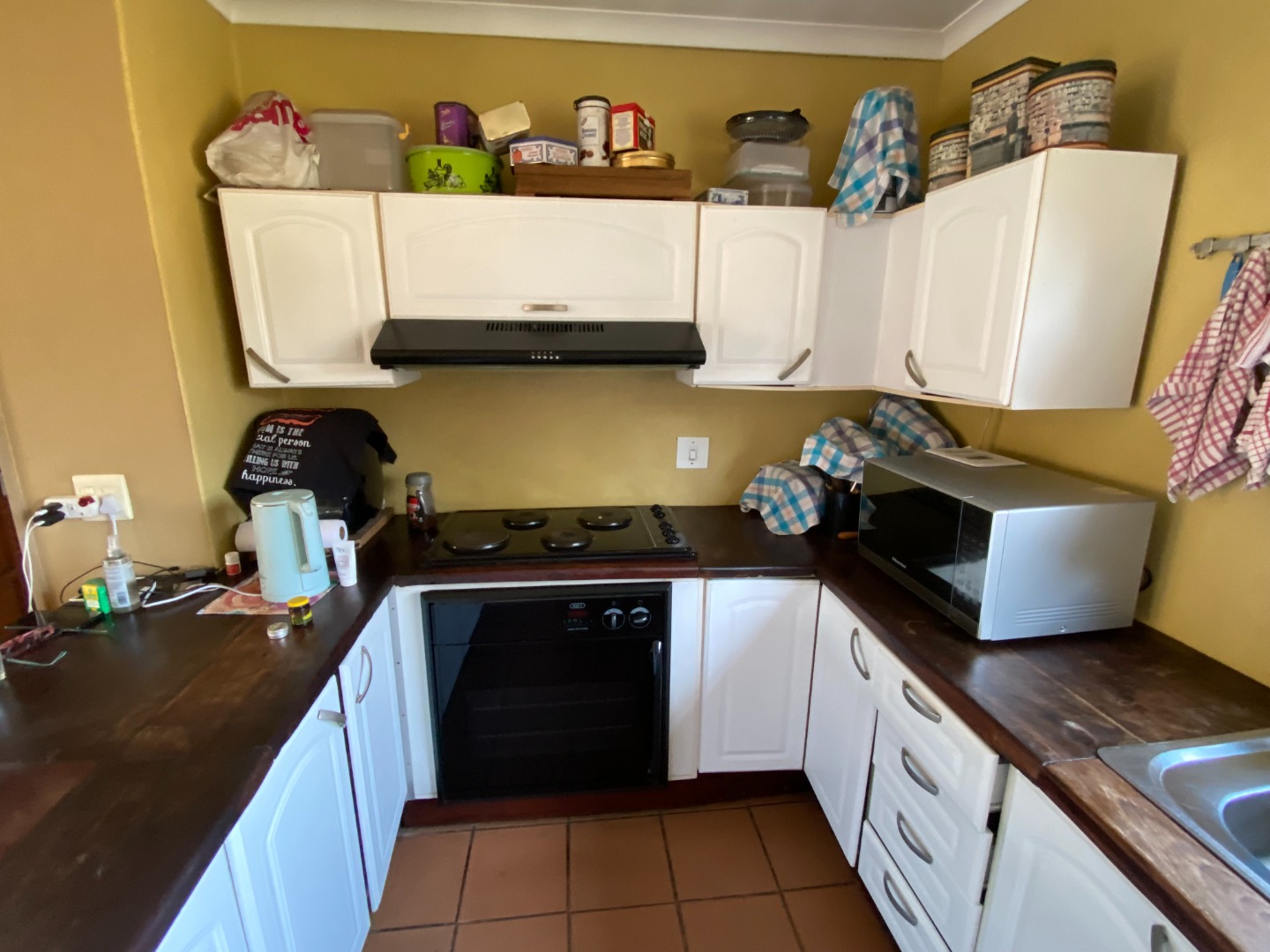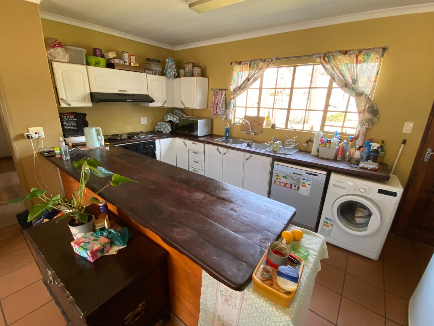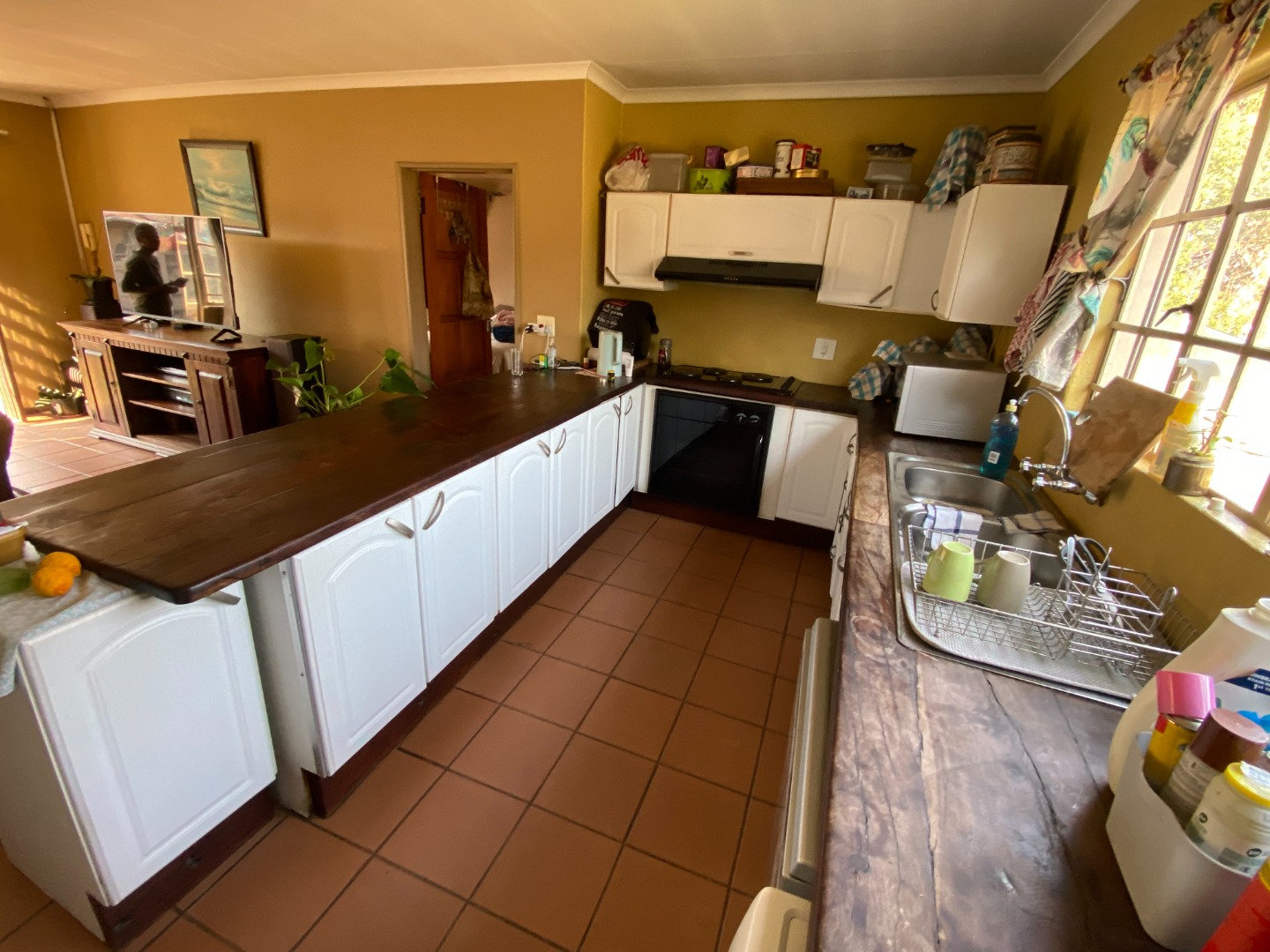 This 3-bedroom house is situated on a large erf in Buccleuch. The living area is open plan. The kitchen is open plan with breakfast nook. There are many cupboards with sleeper wood tops, an undercounter oven with hob and extractor fan, washing machine and dishwasher outlets, and sink with basin.