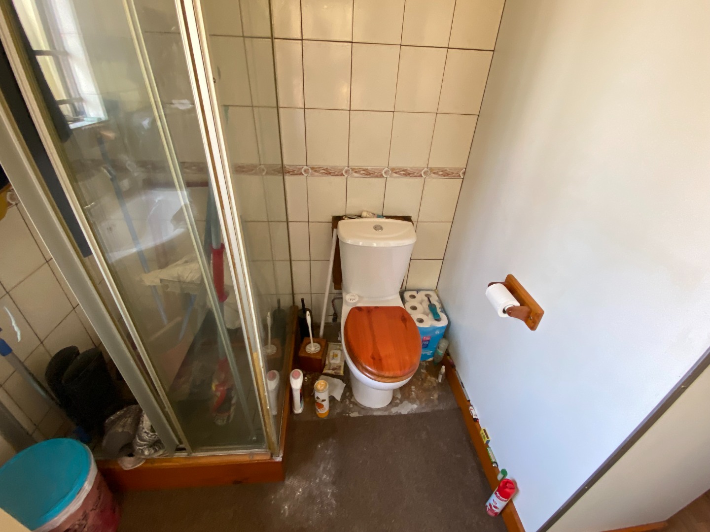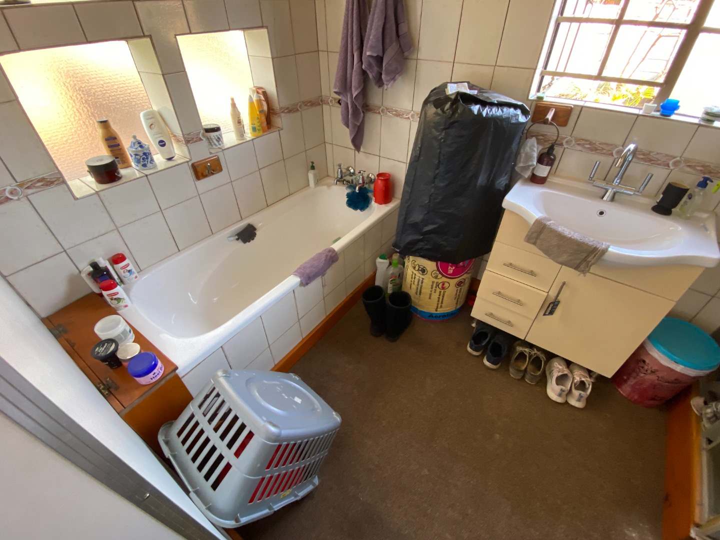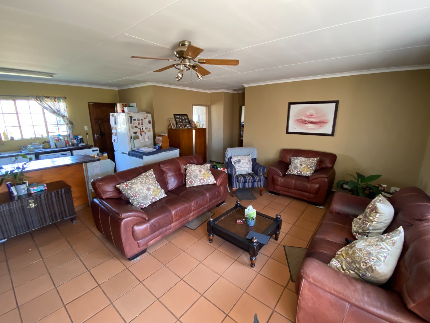 This 3-bedroom house is situated on a large erf in Buccleuch. The living area is open plan. The kitchen is open plan with breakfast nook. There are many cupboards with sleeper wood tops, an undercounter oven with hob and extractor fan, washing machine and dishwasher outlets, and sink with basin.
