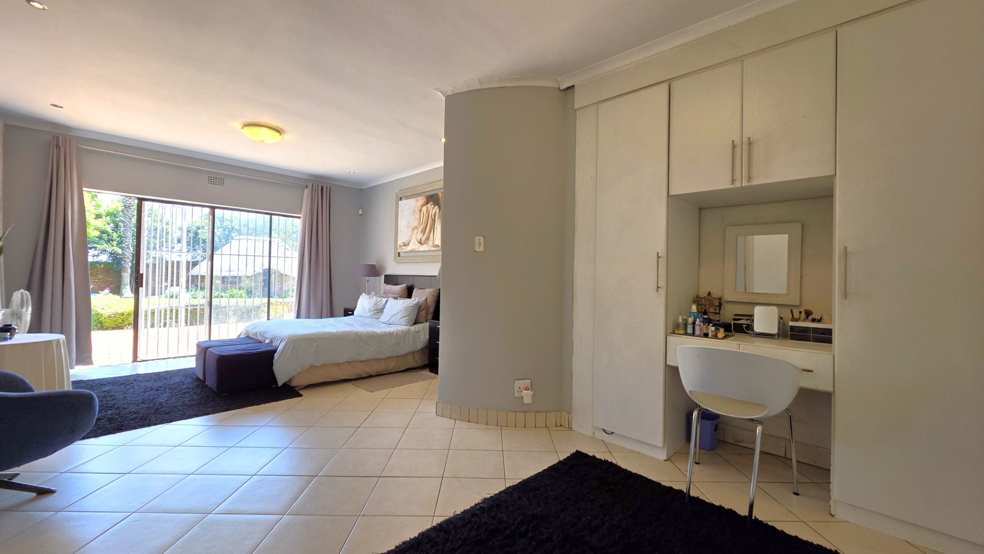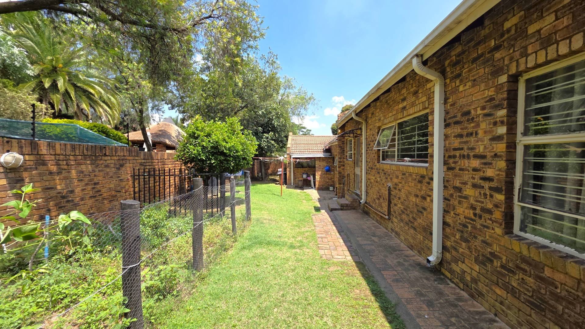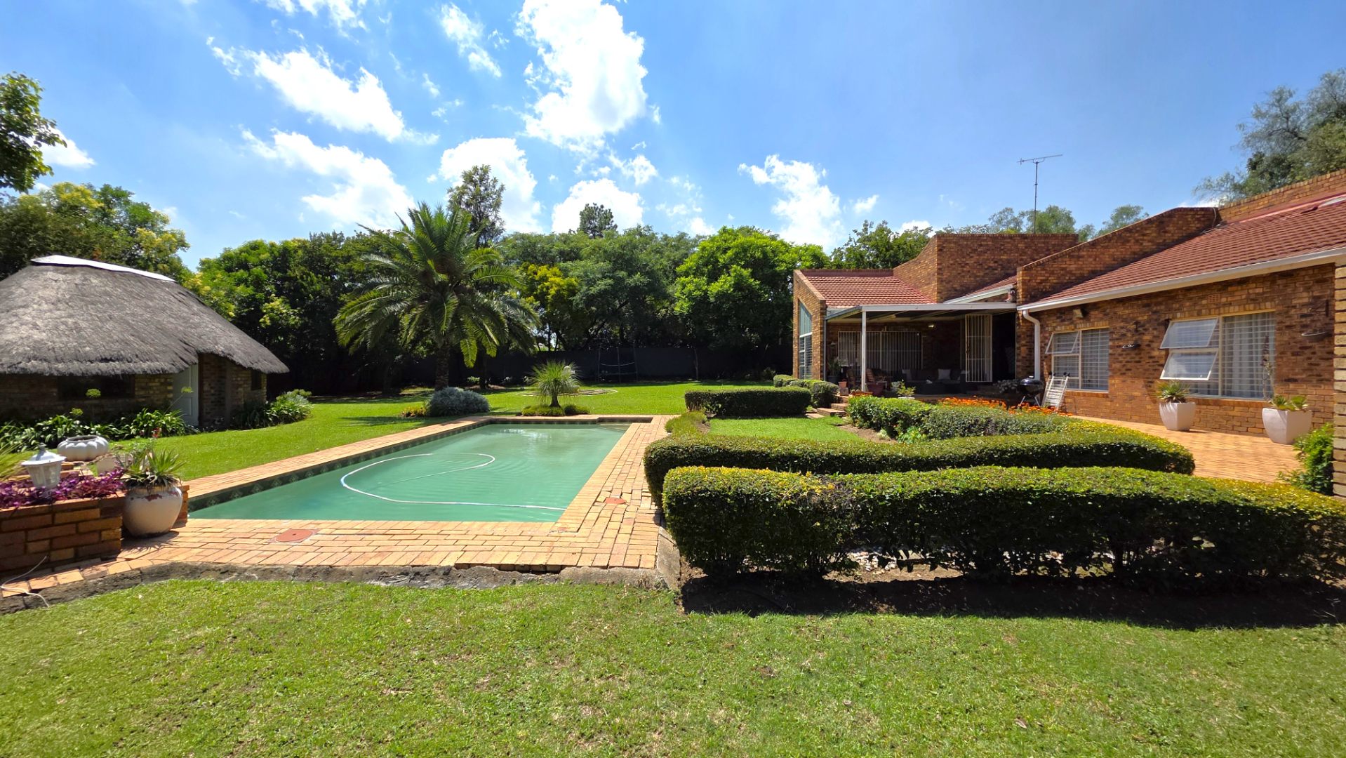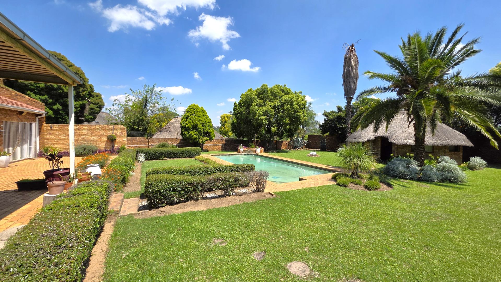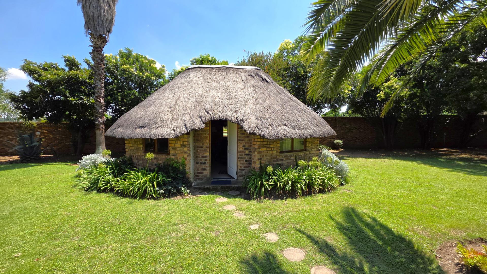 Sliding doors lead from the open-plan area to a covered patio overlooking a lush garden and sparkling swimming pool—perfect for relaxed weekends and hosting guests. The outdoor space is further enhanced by an enclosed entertainment lapa, creating an inviting entertainment area for all seasons. The lapa is currently utilized as a cottage, using dry-walling to create a bedroom with separate small living space, and separate toilet with basin.